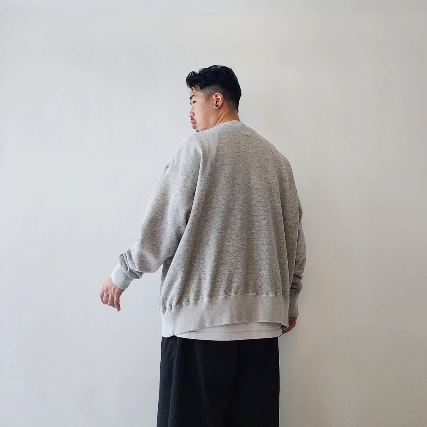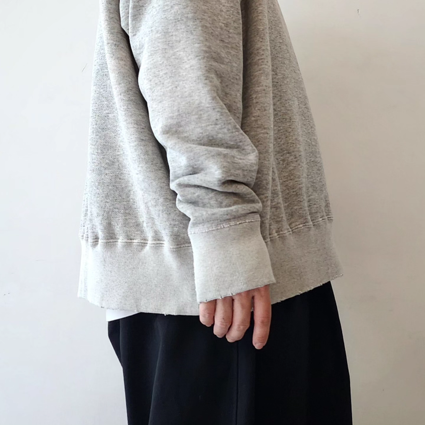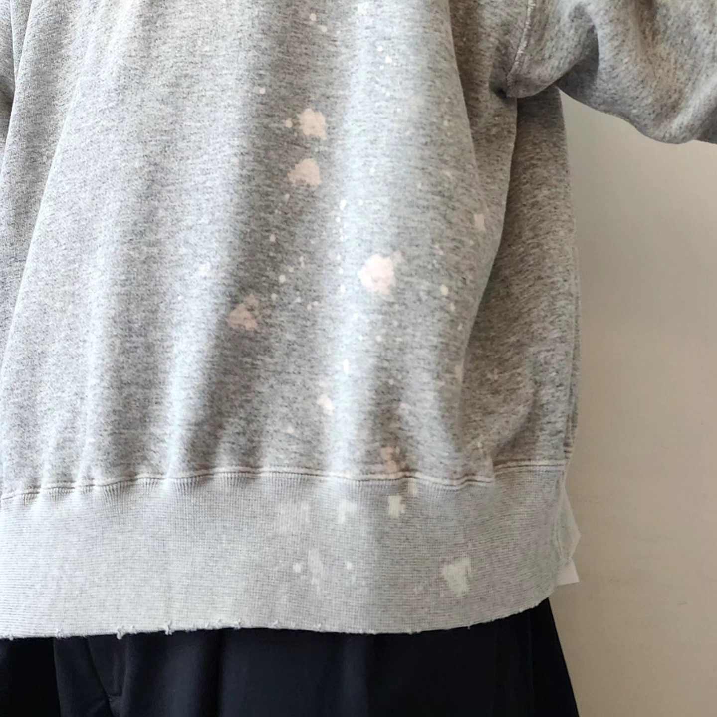 This double-V sweatshirt was inspired by the sweatshirts that physicist Albert Einstein liked to wear in his later years. The retro-style loop-knit fabric was knitted in Wakayama Prefecture, with a round body finish and original color, and then vintage-washed and processed. In addition to fading the color and adding small scratches to the entire body, a splash of bleach was added to the lower left corner, and a faded color reminiscent of sunburn was added to the back. The image is that it will change over time as if you were actually wearing it and working for many years. Can be worn with UNISEX. Due to the characteristics of the fabric, there may be differences in texture and size.