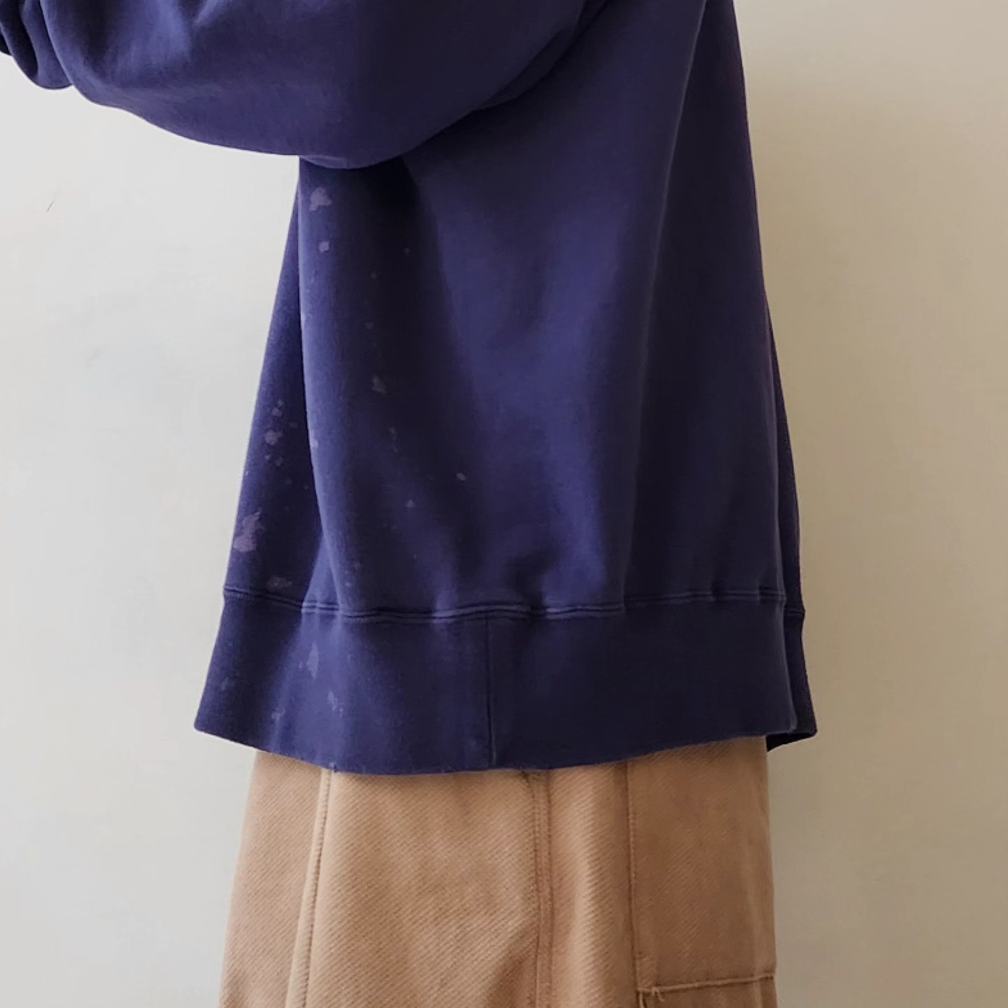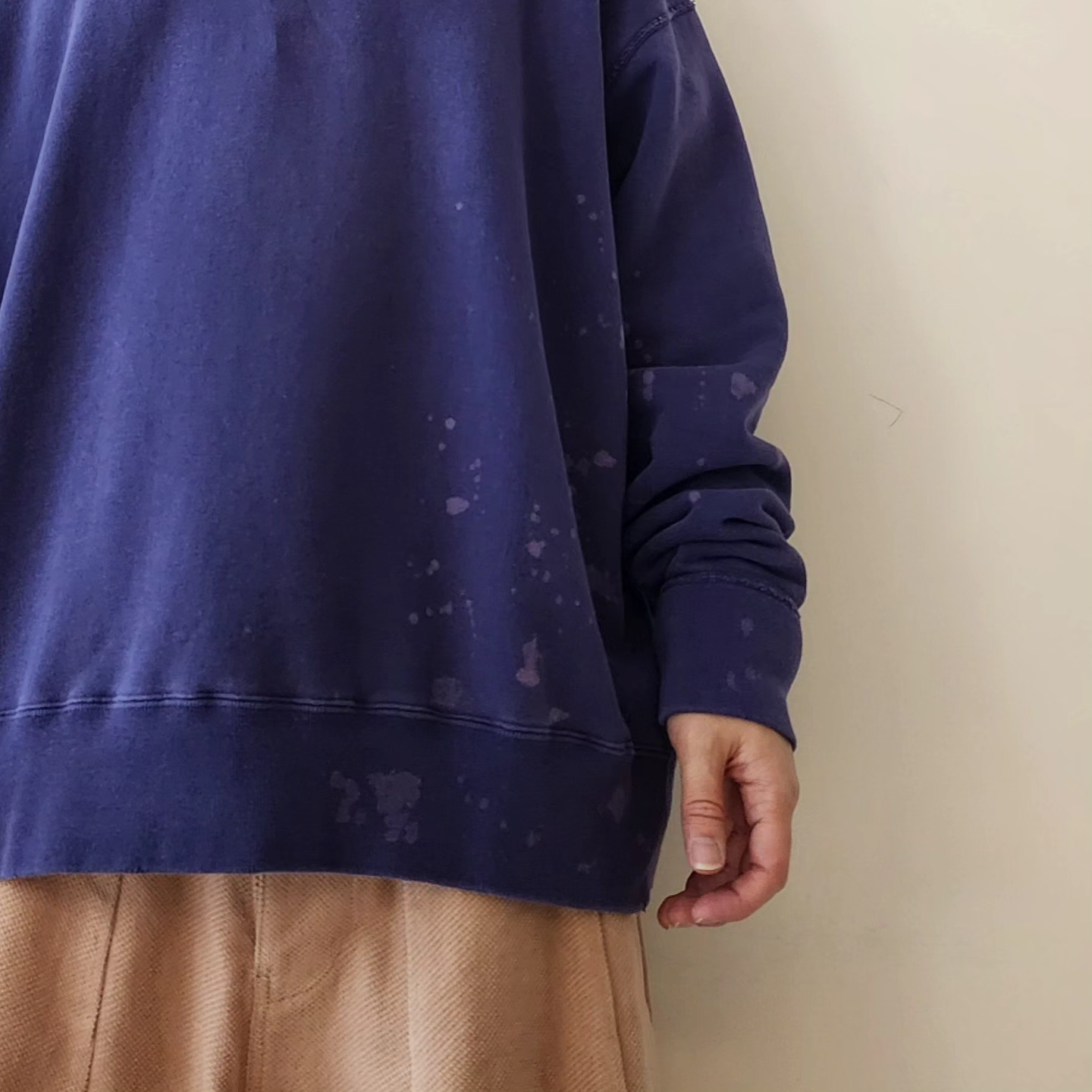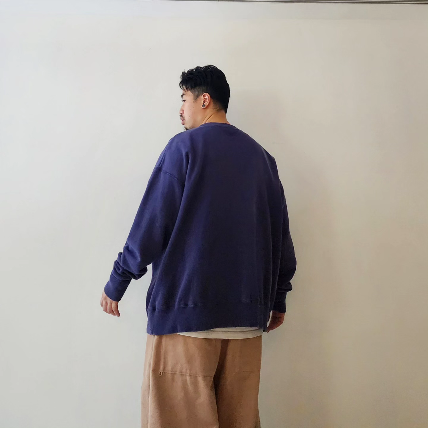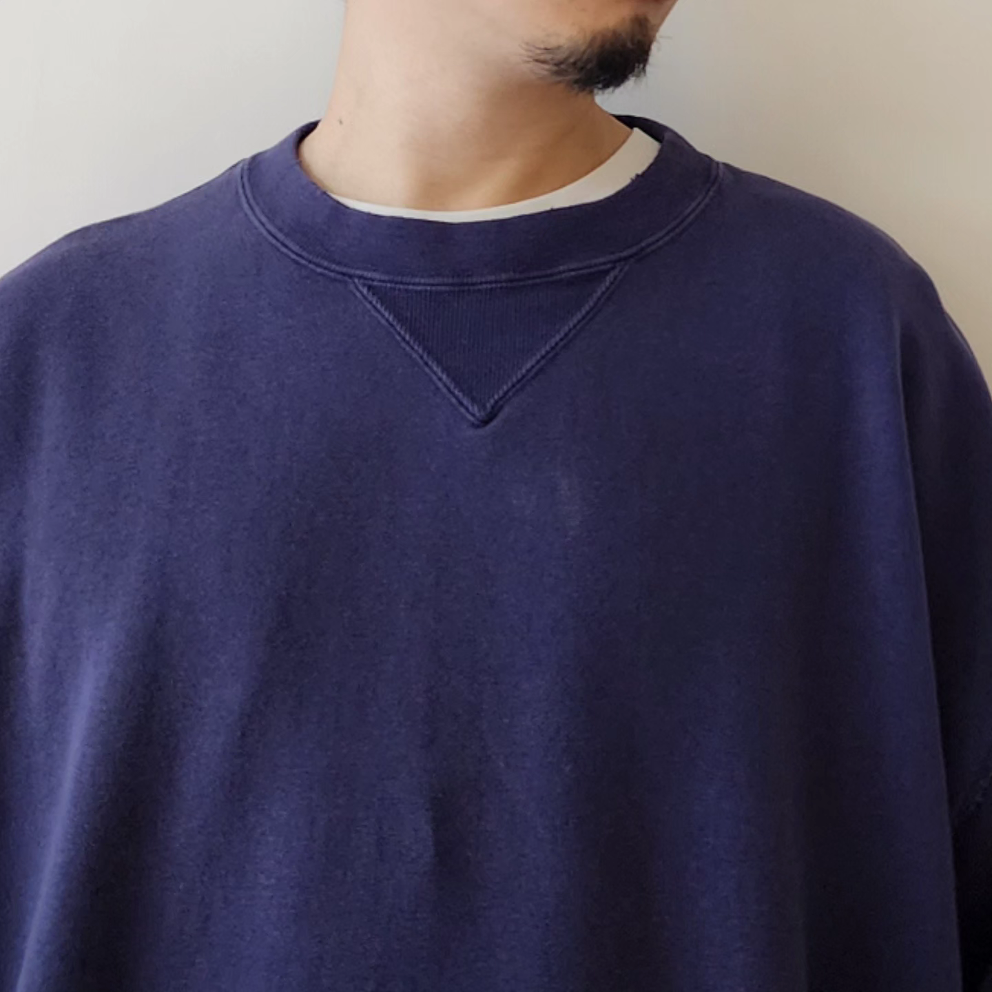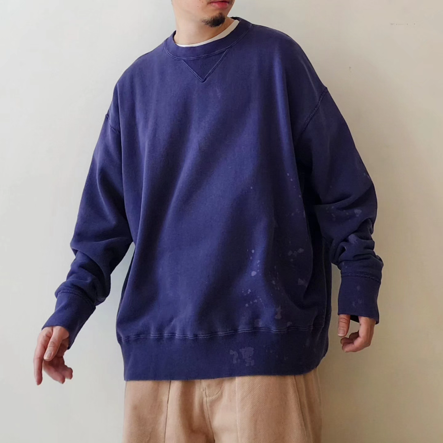 This double-V sweatshirt was inspired by the sweatshirts that physicist Albert Einstein liked to wear in his later years.  The retro-style loop-knit fabric was knitted in Wakayama Prefecture, with a round body finish and original color, and then vintage-washed and processed.  In addition to fading the color and adding small scratches to the entire body, a splash of bleach was added to the lower left corner, and a faded color reminiscent of sunburn was added to the back.  The image is that it will change over time as if you were actually wearing it and working for many years.  Can be worn with UNISEX.  Due to the characteristics of the fabric, there may be differences in texture and size.
