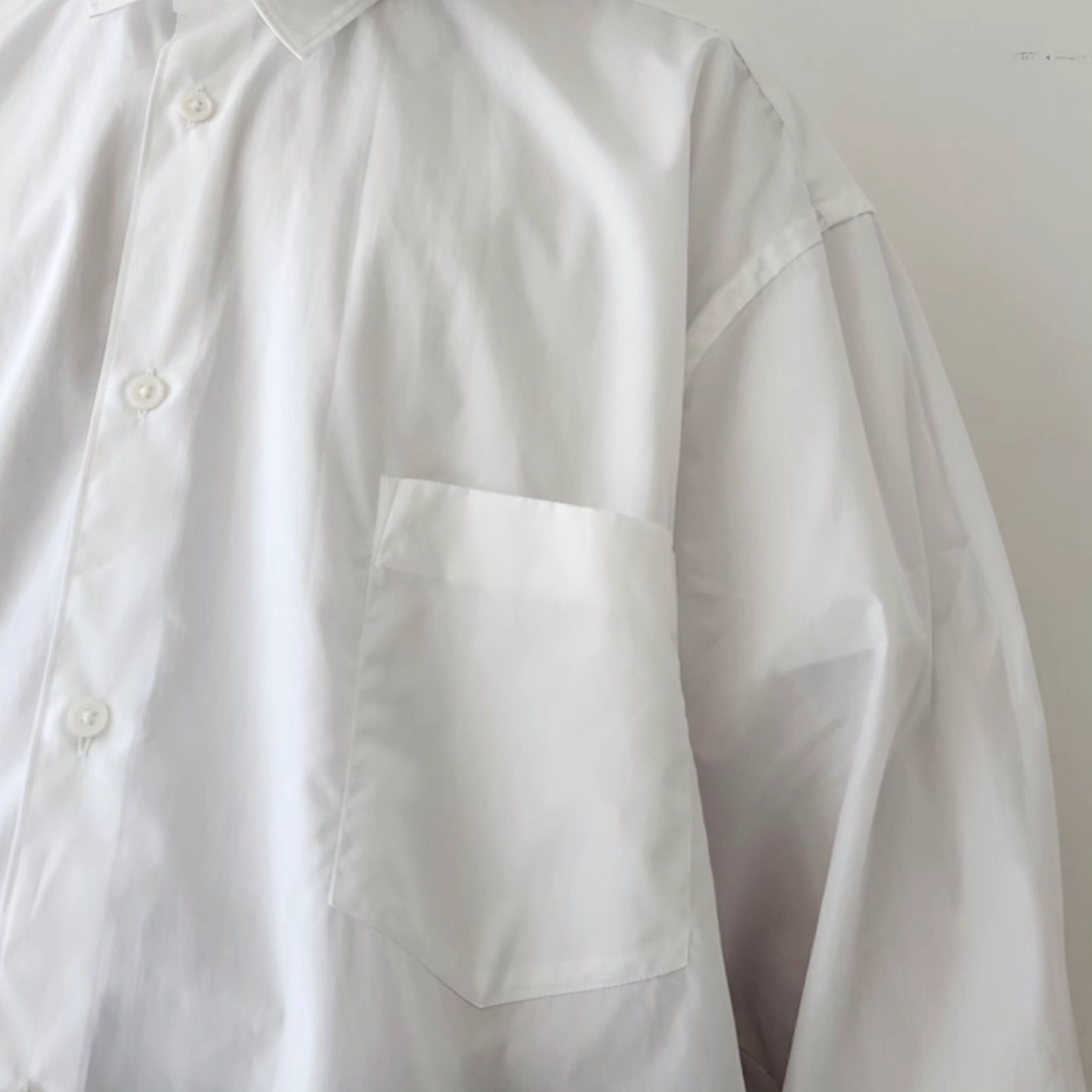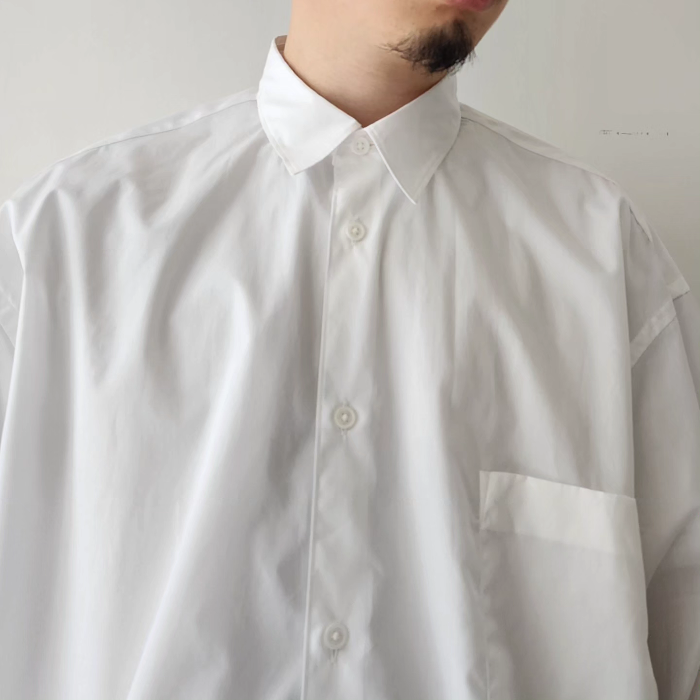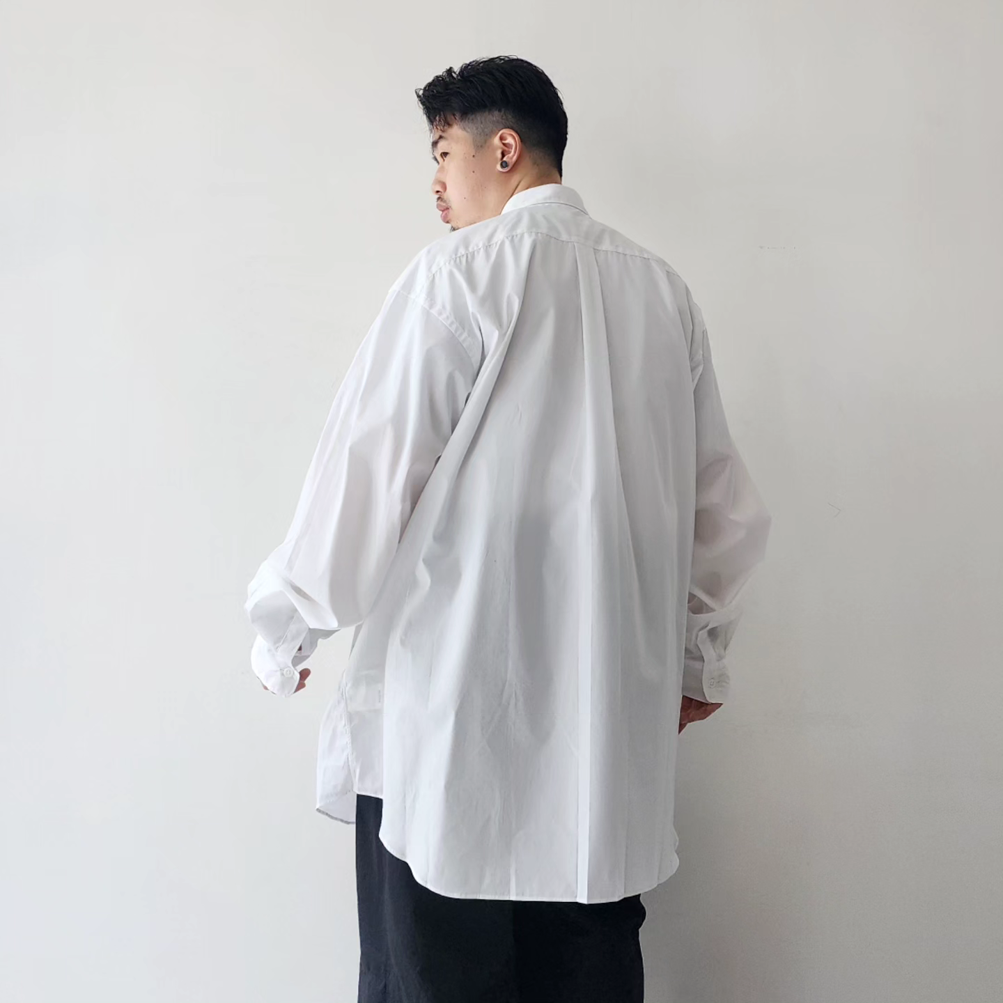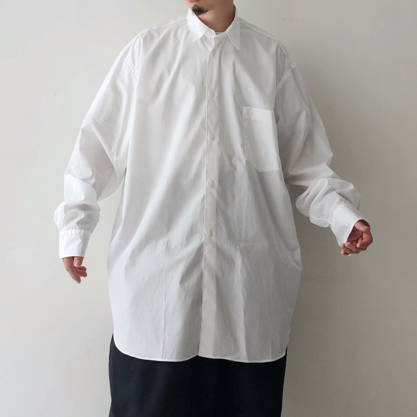 -A regular color shirt inspired by the masterpiece of the 1990s by the French shirt label, a brand that leads the world's fashion, was created with two types of blue 200 double broads with a beautiful luster. The size of the chest pocket is kept, and it is tailored to a hyper big size. The width, length, and armholes are loosely matched with a small collar to create a balance that matches both tucked in and out. Sewing at a dress shirt factory in Japan, we have achieved a tailoring that does not feel sticky while using fine stitching. The front and cuffs are made with thin freshwater pearl shell buttons.