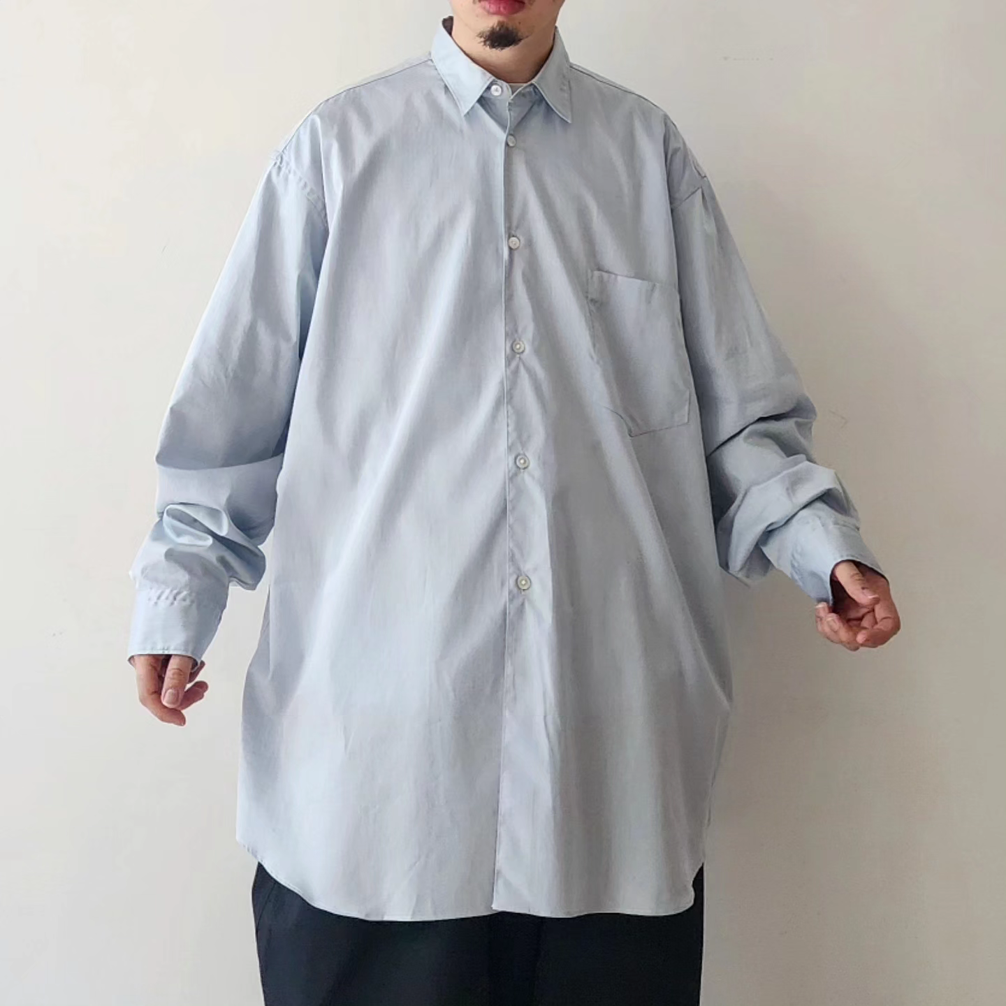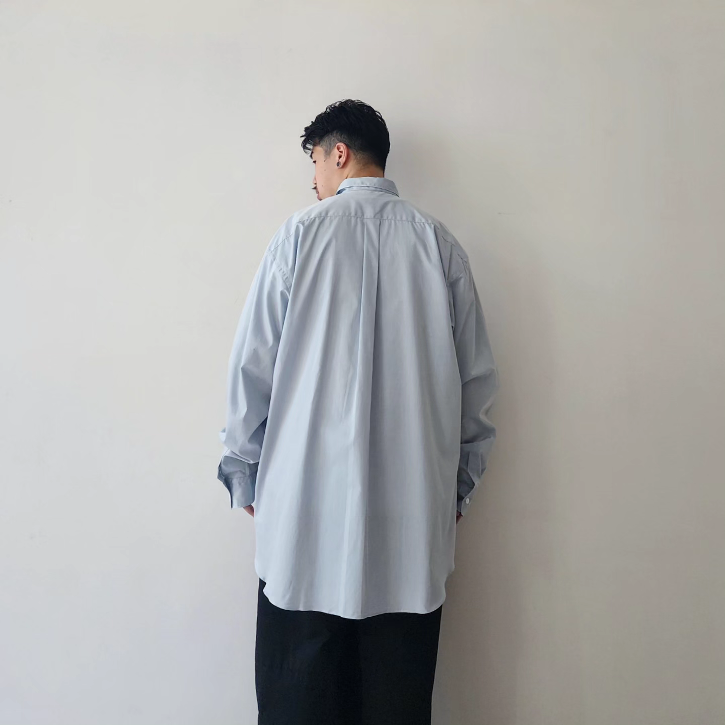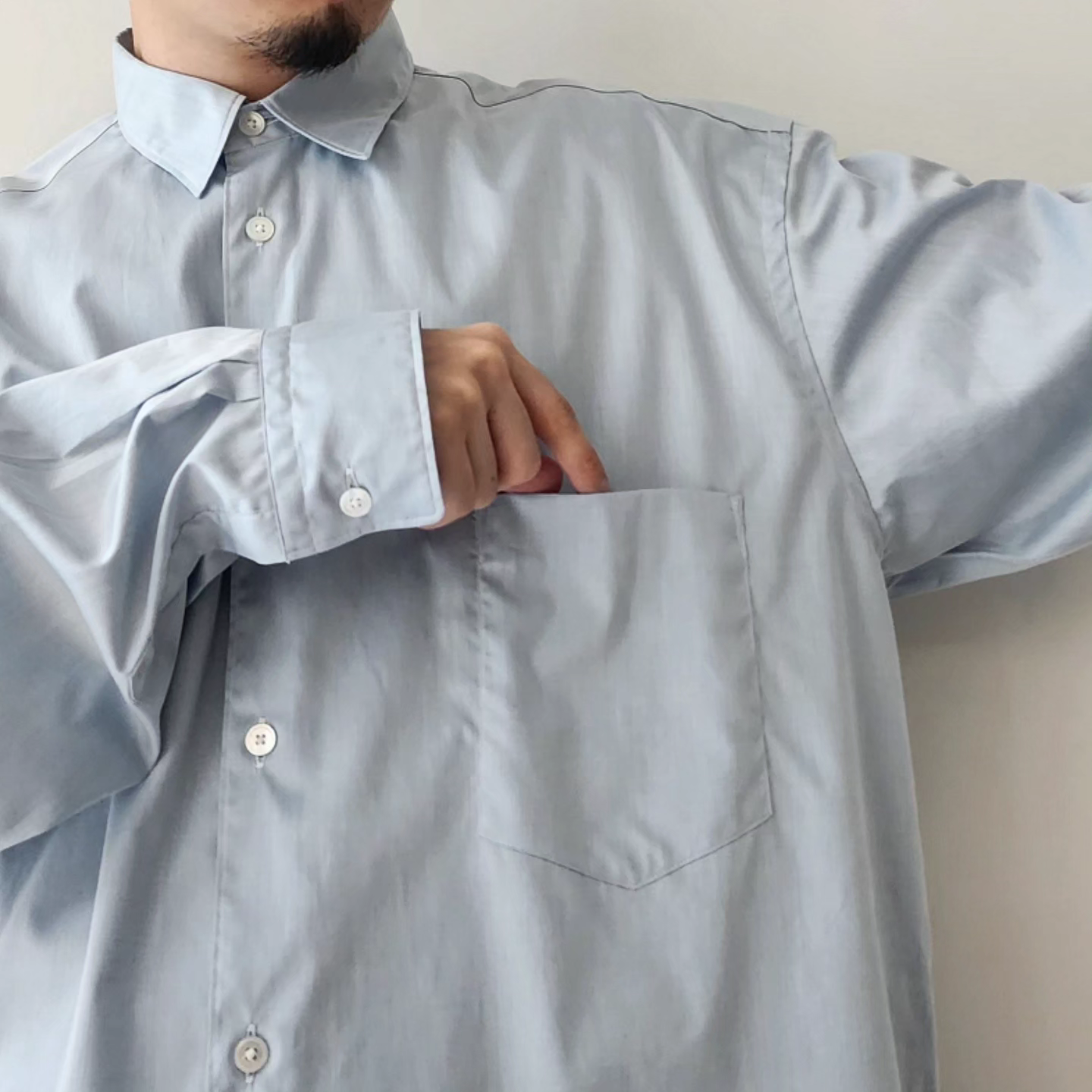 -A regular color shirt inspired by the masterpiece of the 1990s by the French shirt label, a brand that leads the world's fashion, was created with two types of blue 200 pairs of twill with a beautiful luster. The size of the chest pocket is kept, and it is tailored to a hyper big size. The width, length, and armholes are loosely matched with a small collar to create a balance that matches both tucked in and out. Sewing at a dress shirt factory in Japan, we have achieved a tailoring that does not feel sticky while using fine stitching. Thin Takase shell buttons are used for the front and cuffs.