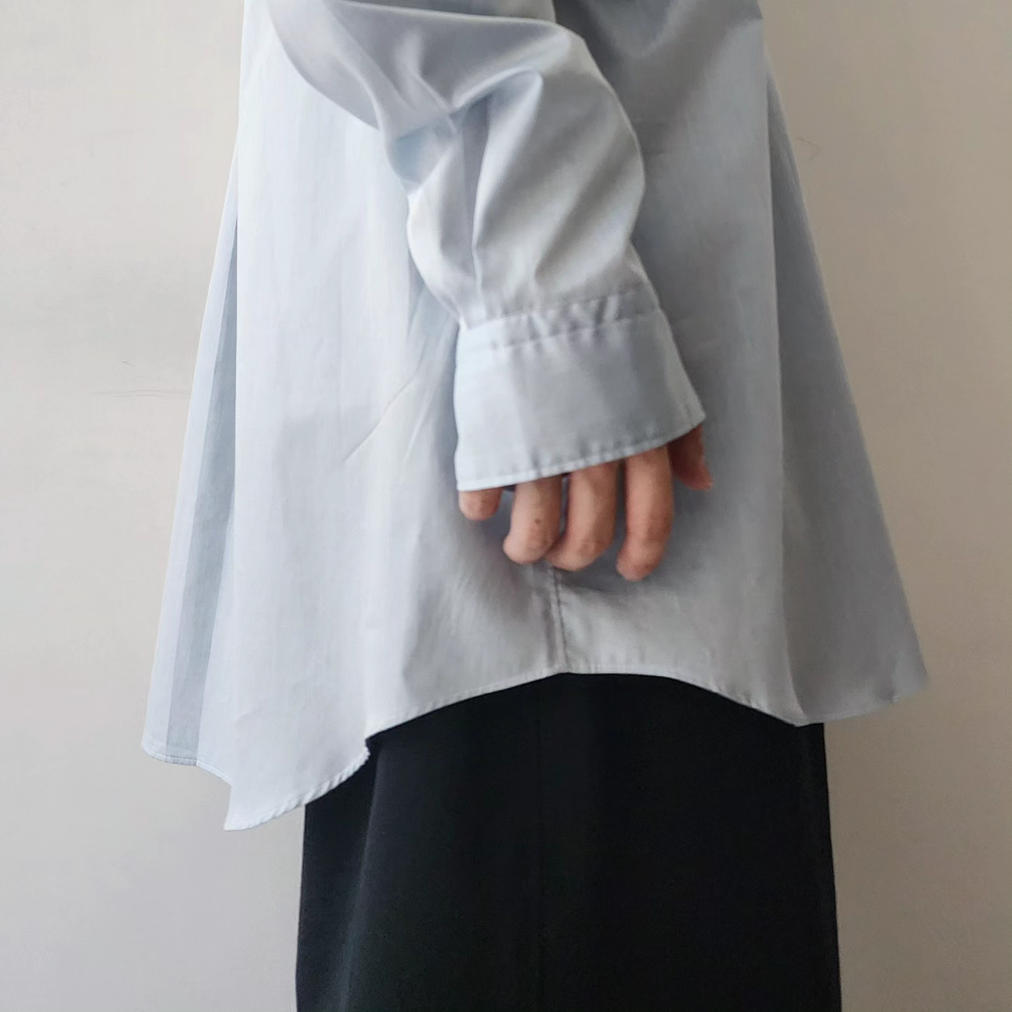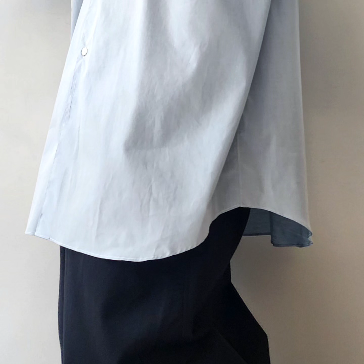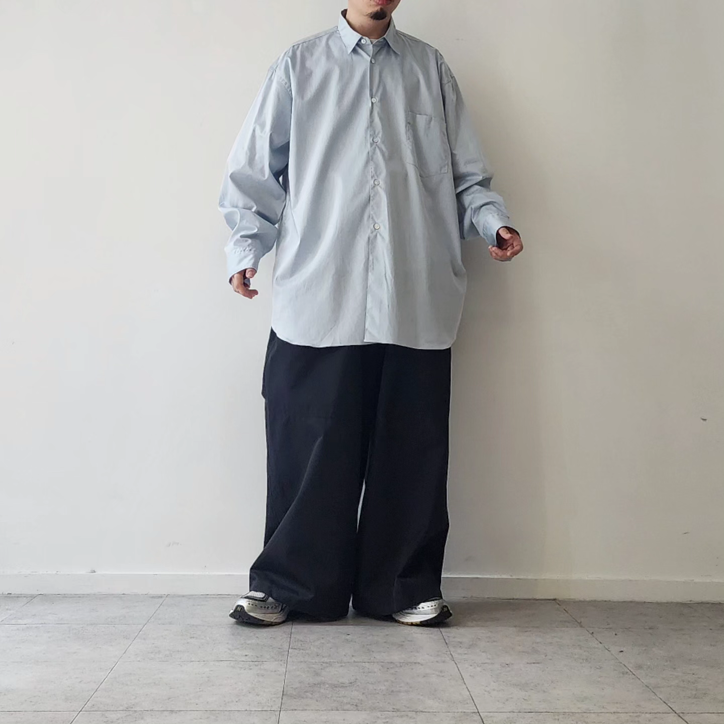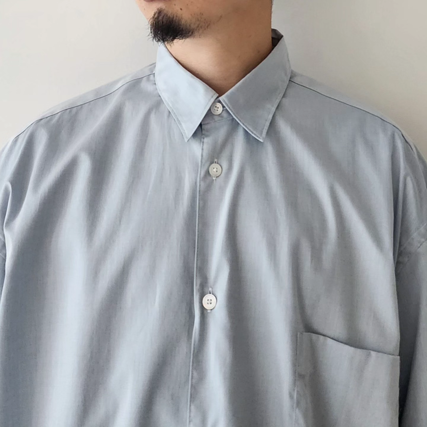 -A regular color shirt inspired by the masterpiece of the 1990s by the French shirt label, a brand that leads the world's fashion, was created with two types of blue 200 pairs of twill with a beautiful luster. The size of the chest pocket is kept, and it is tailored to a hyper big size. The width, length, and armholes are loosely matched with a small collar to create a balance that matches both tucked in and out. Sewing at a dress shirt factory in Japan, we have achieved a tailoring that does not feel sticky while using fine stitching. Thin Takase shell buttons are used for the front and cuffs.