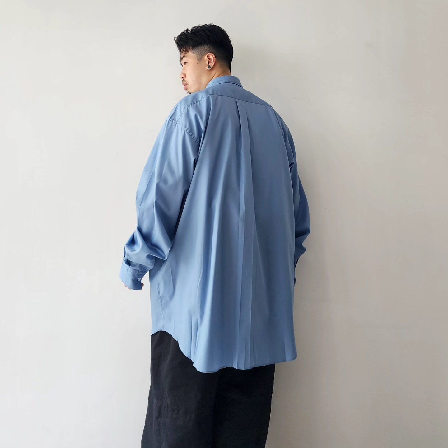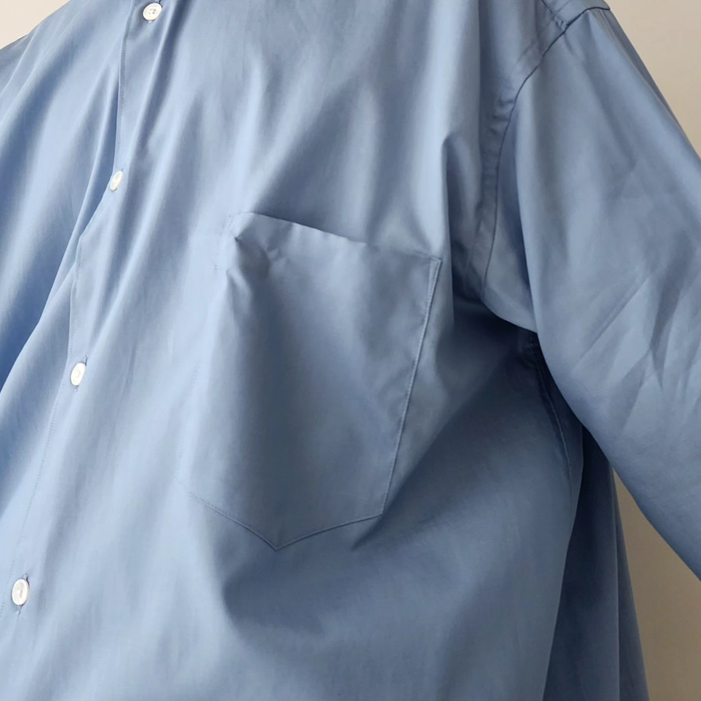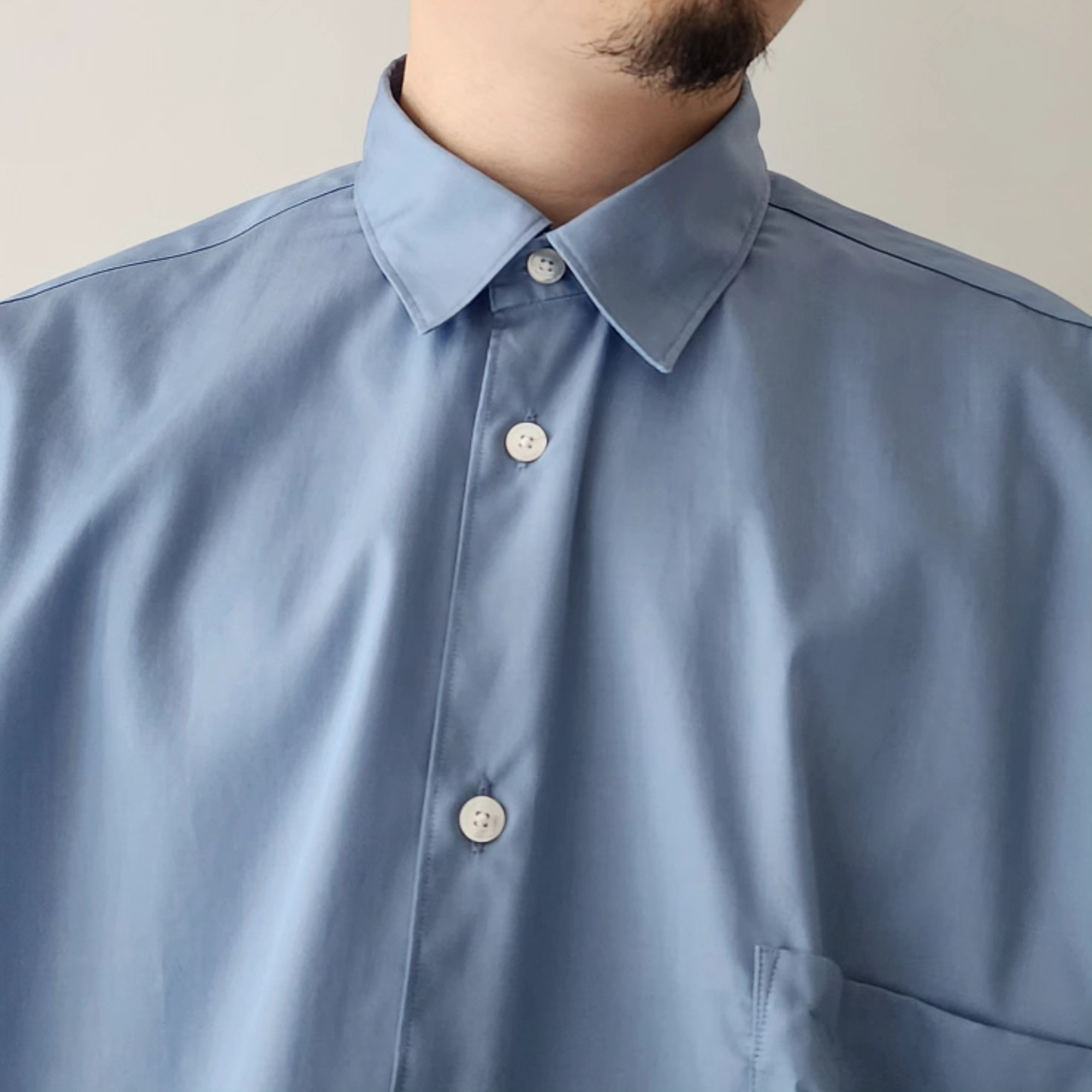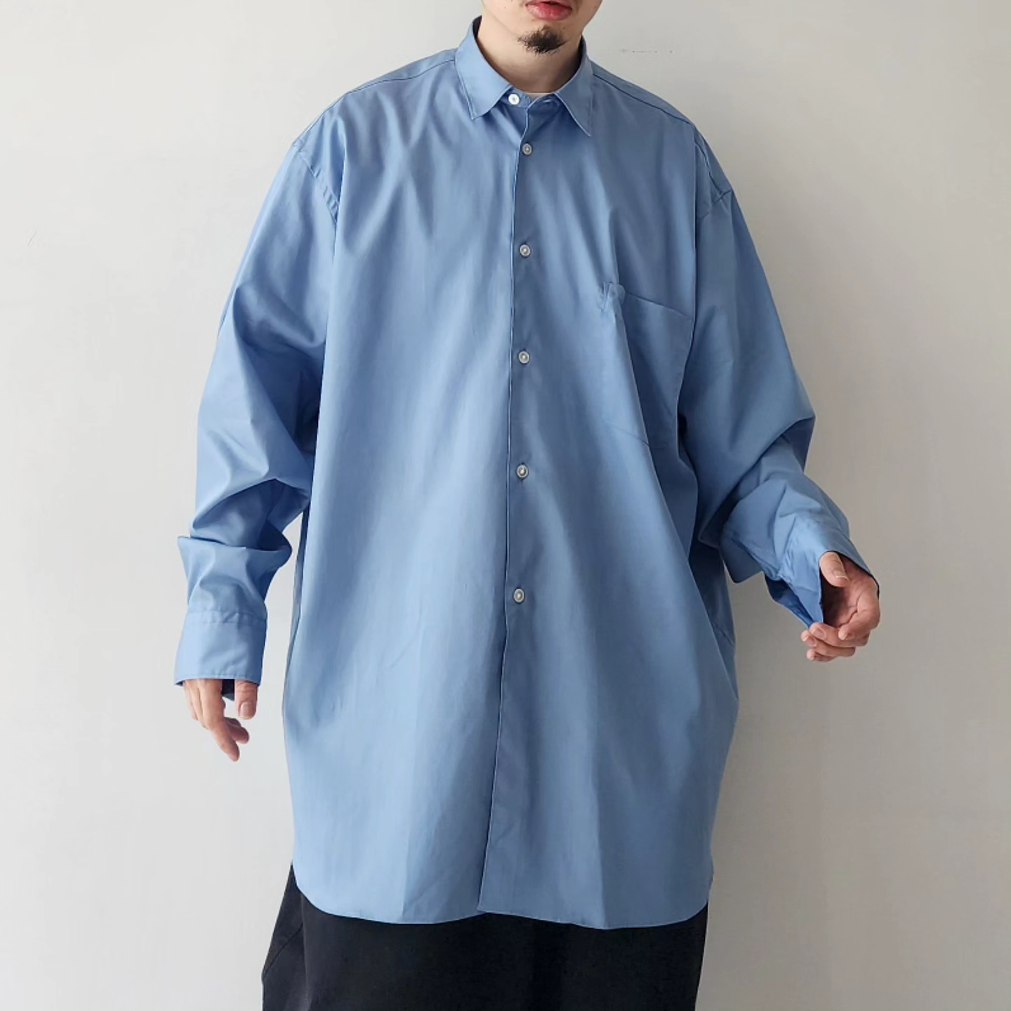 -A regular color shirt inspired by the masterpiece of the 1990s by the French shirt label, a brand that leads the world's fashion, was created with two types of blue 200 pairs of twill with a beautiful luster.  The size of the chest pocket is kept, and it is tailored to a hyper big size.  The width, length, and armholes are loosely matched with a small collar to create a balance that matches both tucked in and out.  Sewing at a dress shirt factory in Japan, we have achieved a tailoring that does not feel sticky while using fine stitching.  Thin Takase shell buttons are used for the front and cuffs.