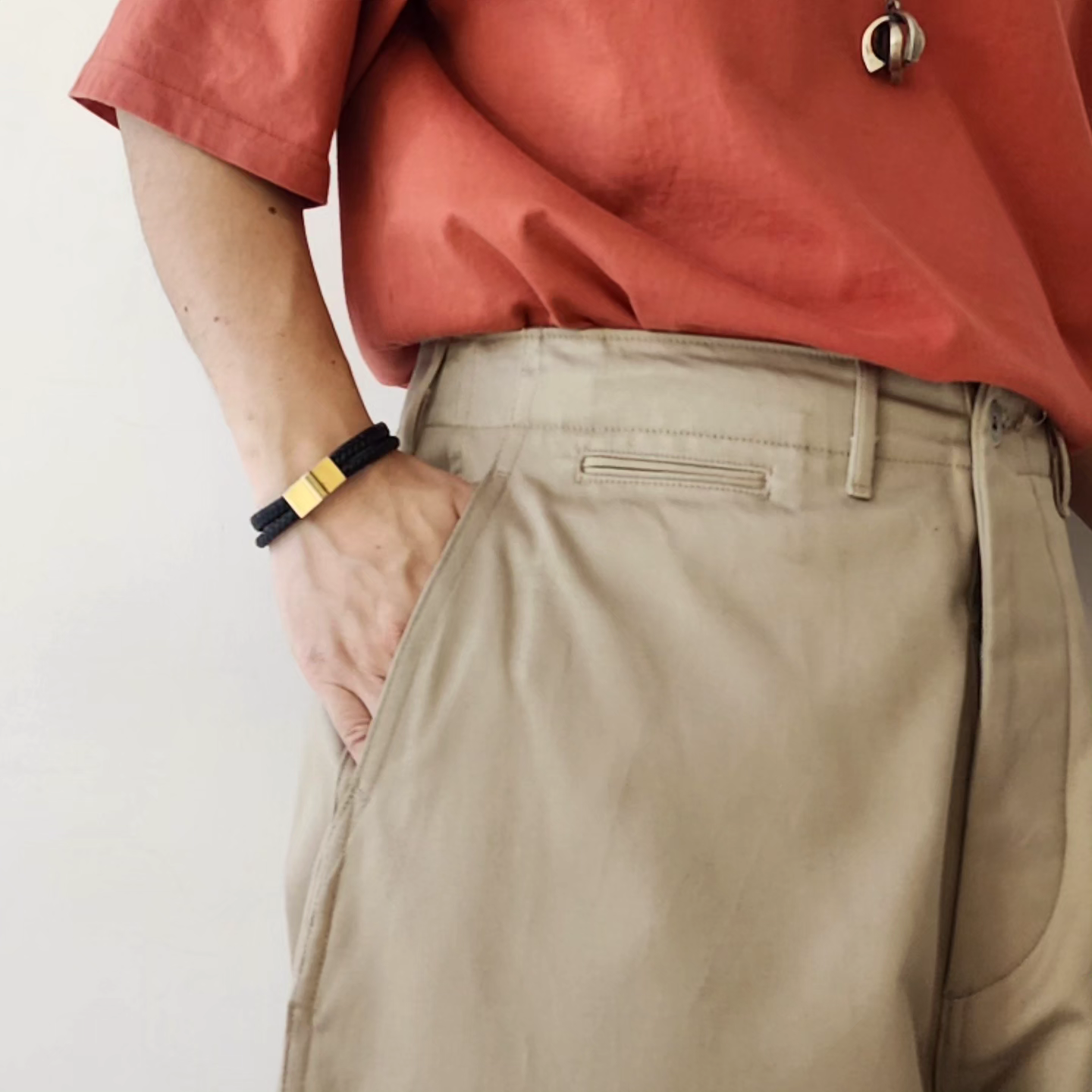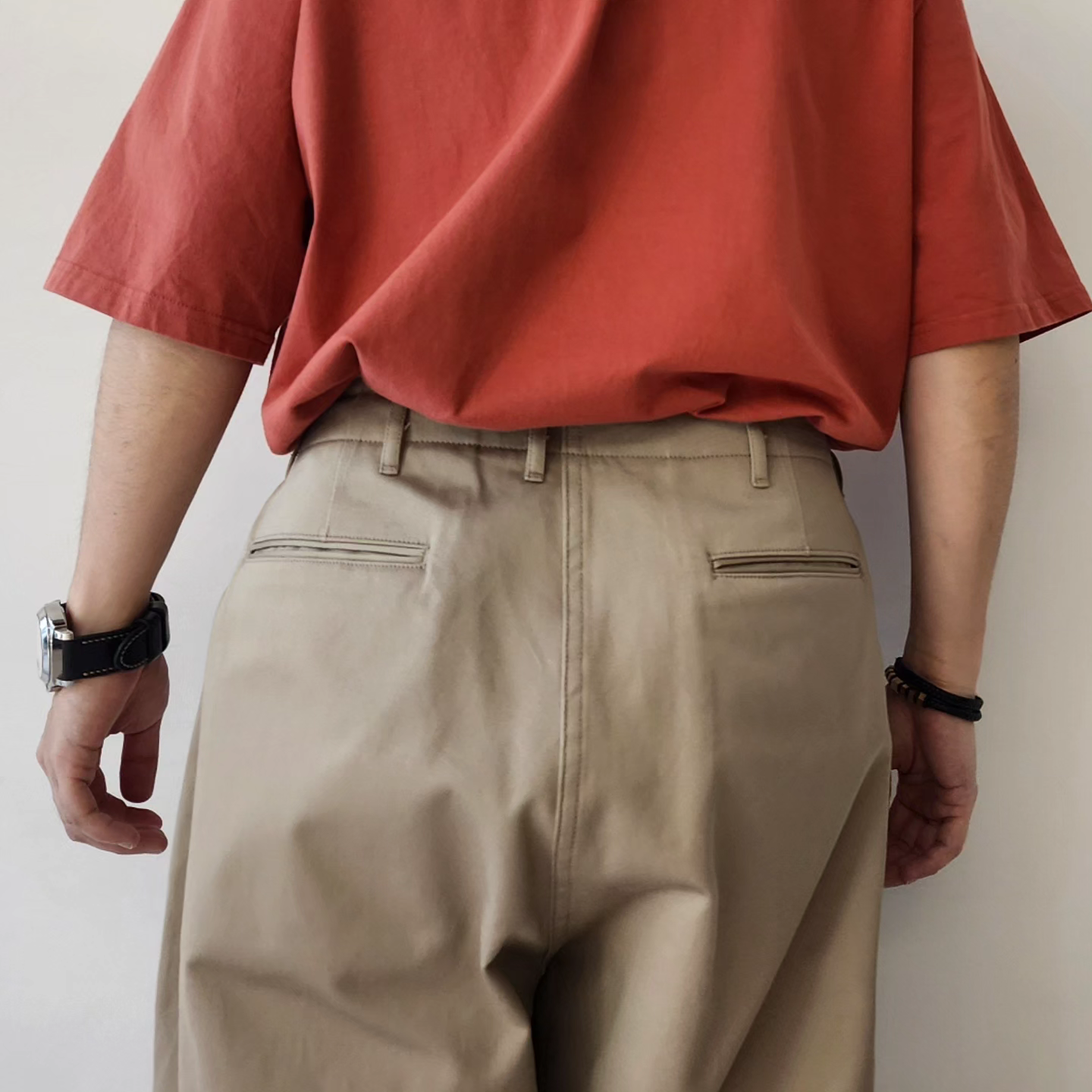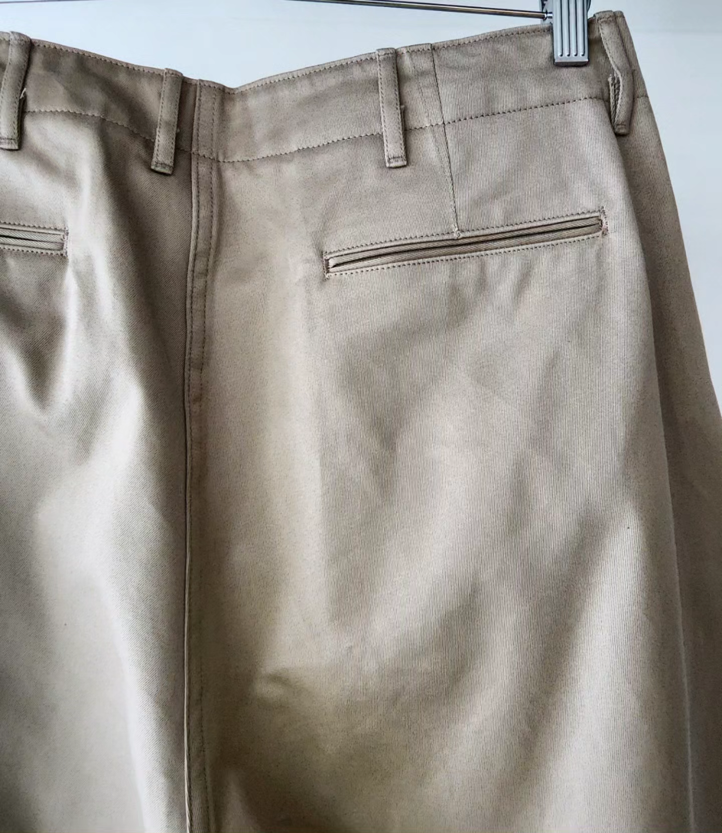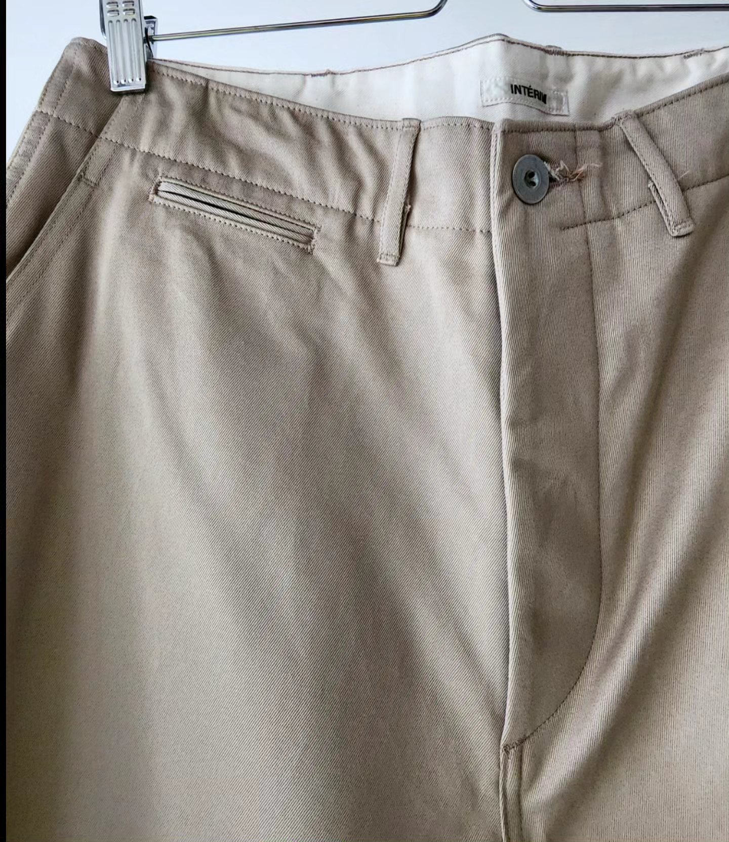 -A hyper-big size version of the US military M-41 Chino, interpreted by INTERIM.  While maintaining the straight impression of the M-41, we have created a relaxed and wide silhouette by adding volume to the width.  The fabric is a weapon (right twill two-ply yarn) fabric that is a reproduction of the fabric of the time and has a glossy look.  41 Chino details such as 4-hole metal buttons, thick sleek on the back of the waist, and ball green pockets on the front and waist are included.  -A slightly dressier impression is achieved by using thread with a finer count than vintage and sewing with finely set needle movements.