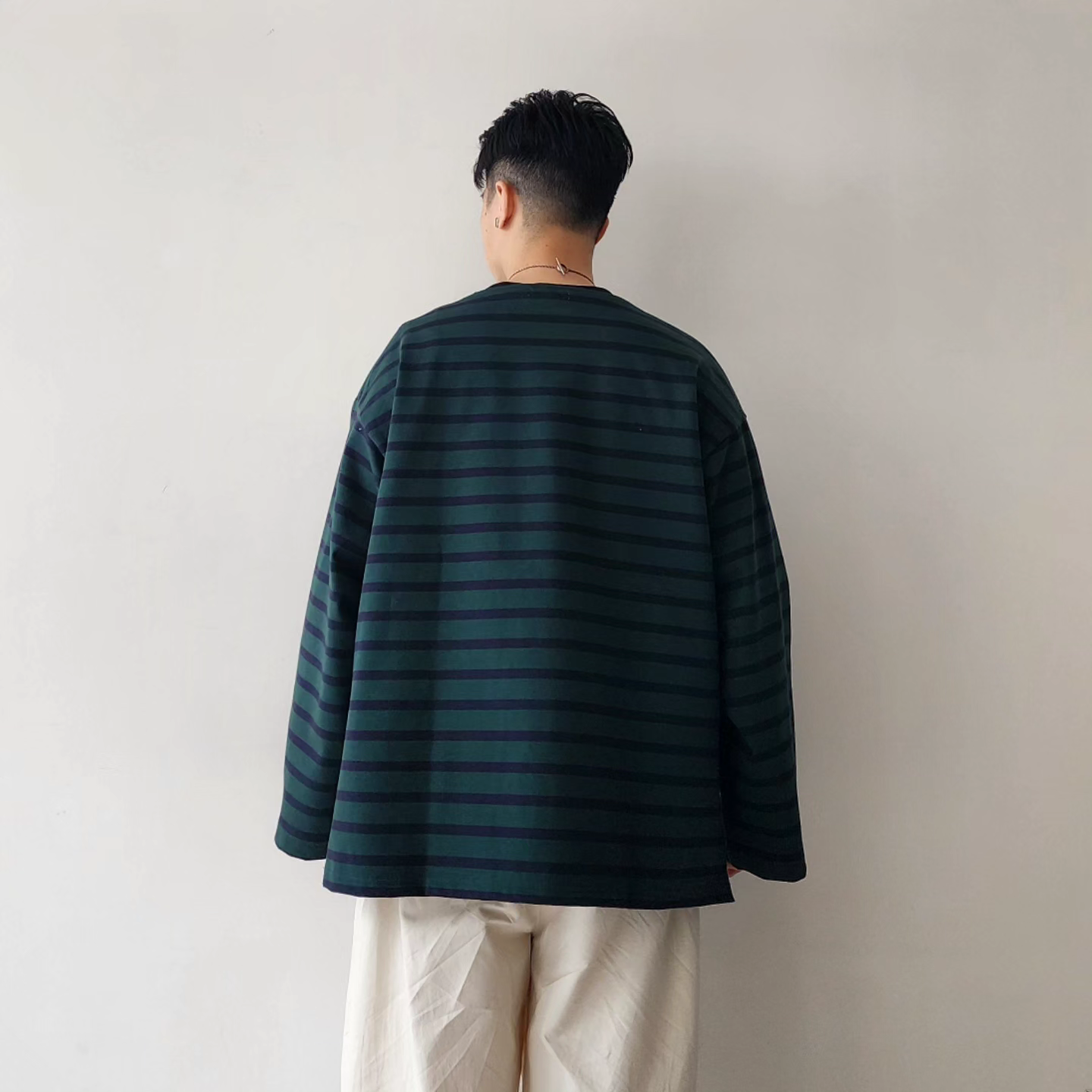 -Based on the specifications of the classic Basque shirt, this piece has been tailored to a hyper big size by significantly changing the size balance.