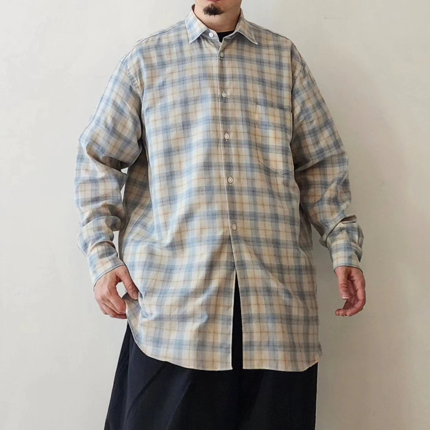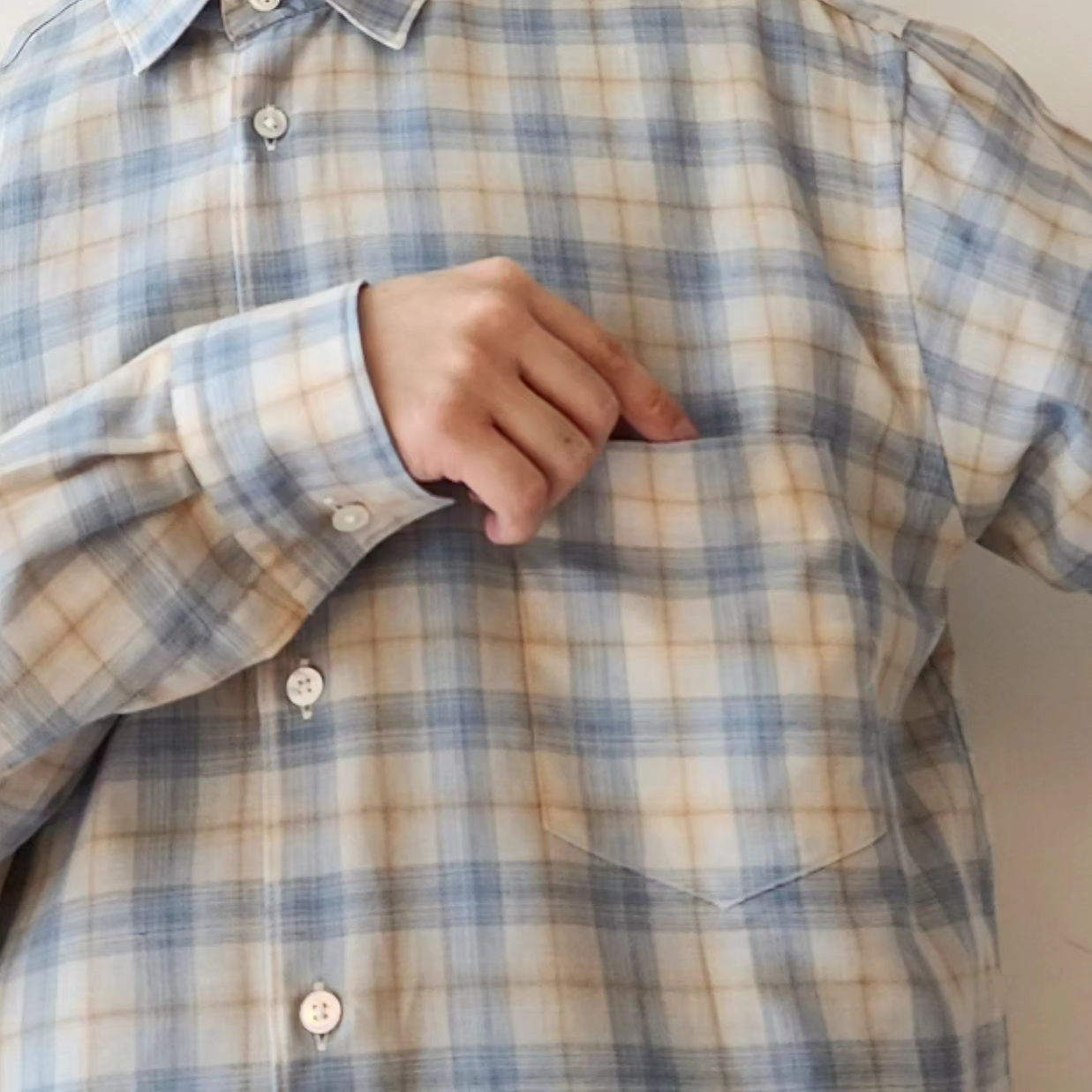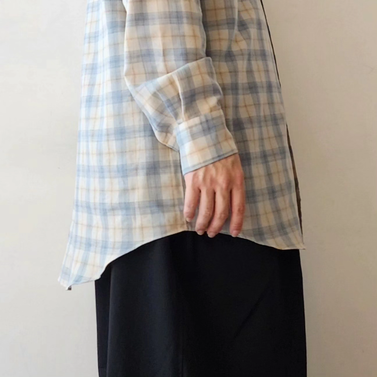A check fabric made by combining Supima cotton and wool. It has a soft feel like wool, but the surface texture is well-balanced, and it is a supple material that is easy to remove from the skin. It is almost not see-through, but it is light and has a beautiful drape.