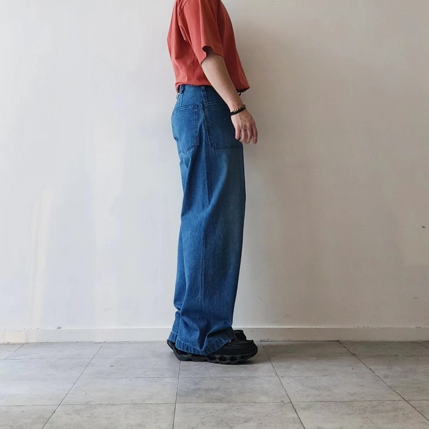 -While following the original specifications, the rise and width are generous, and the silhouette is wide and straight, falling all the way to the hem.