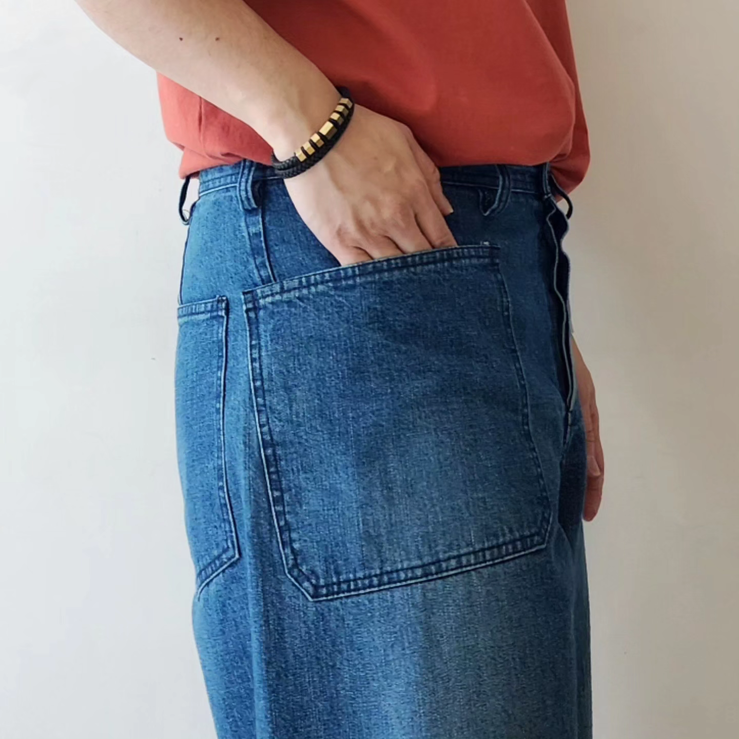 -We use selvedge denim fabric made from vintage research and made from rice cotton and fallen cotton that has a rough feel to it.