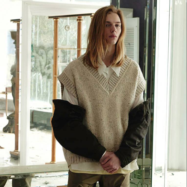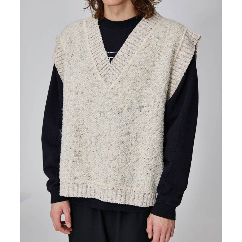 ■A combination of several types of knitted fabrics to express the tweed fabric, bright rayon, slub yarn and curl yarn, mohair loop yarn with luster and firmness, and silk yarn to create a tweed-like presence. A knit made with a luxurious three-dimensional knitted fabric using certain threads.