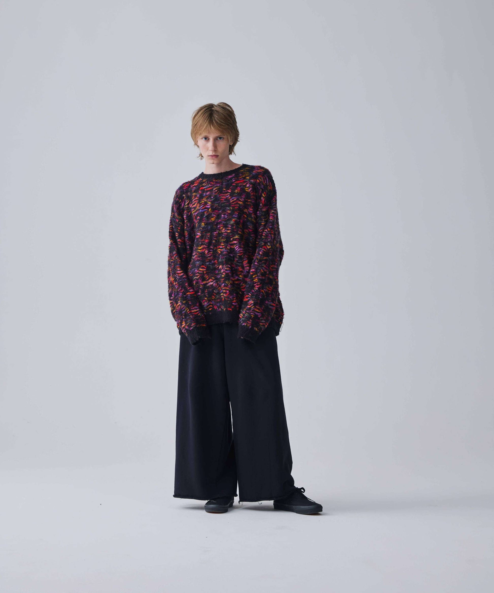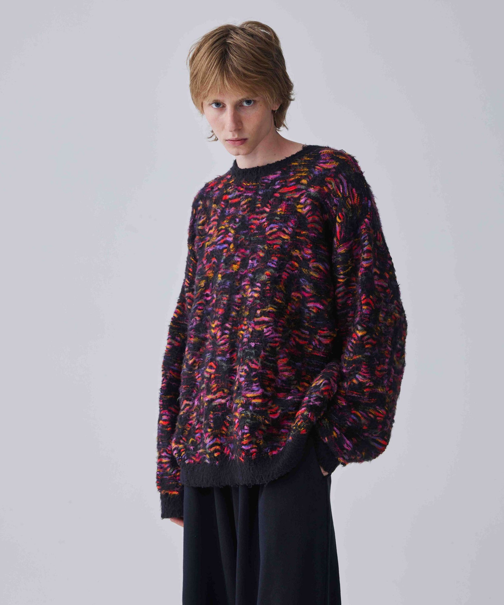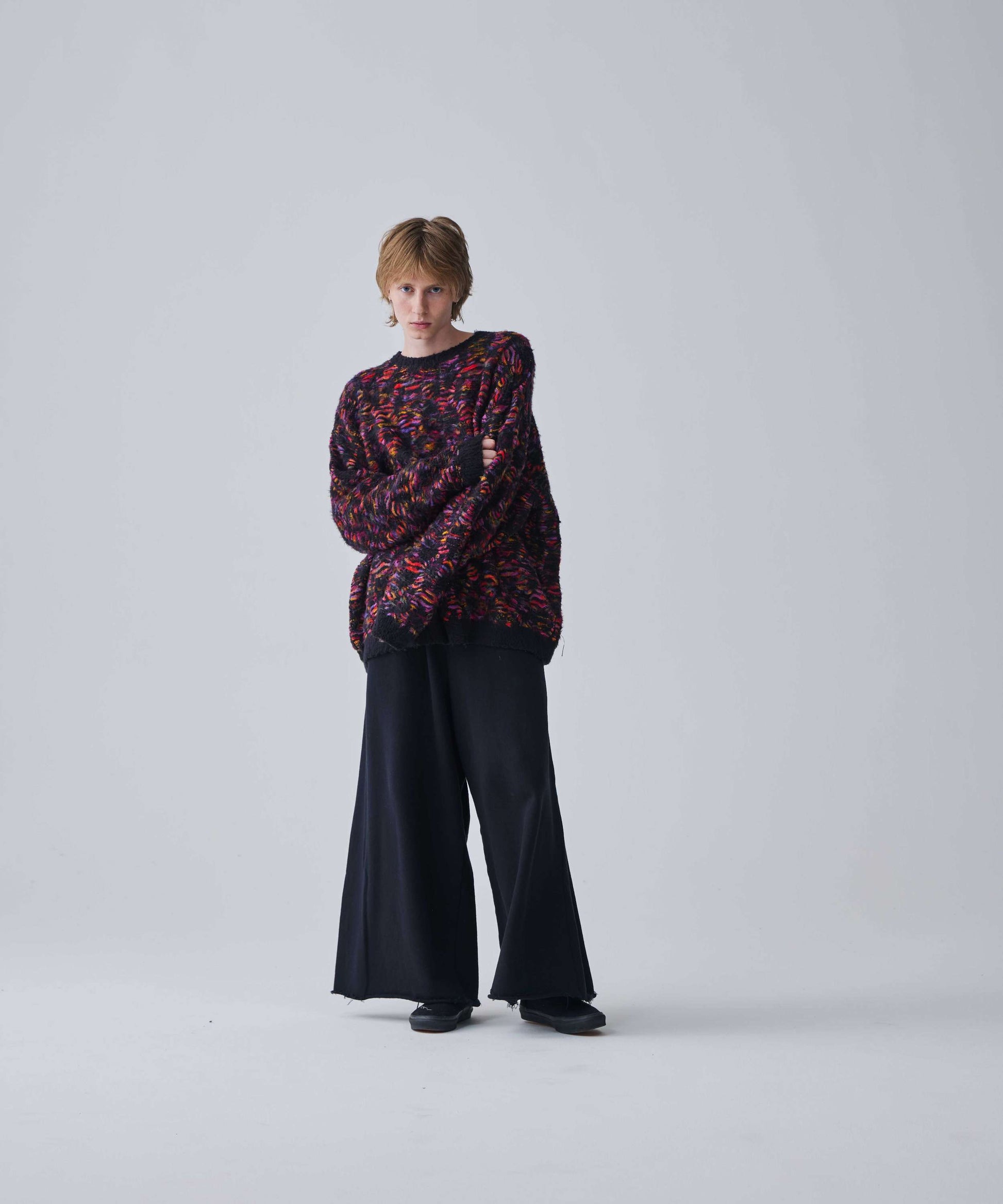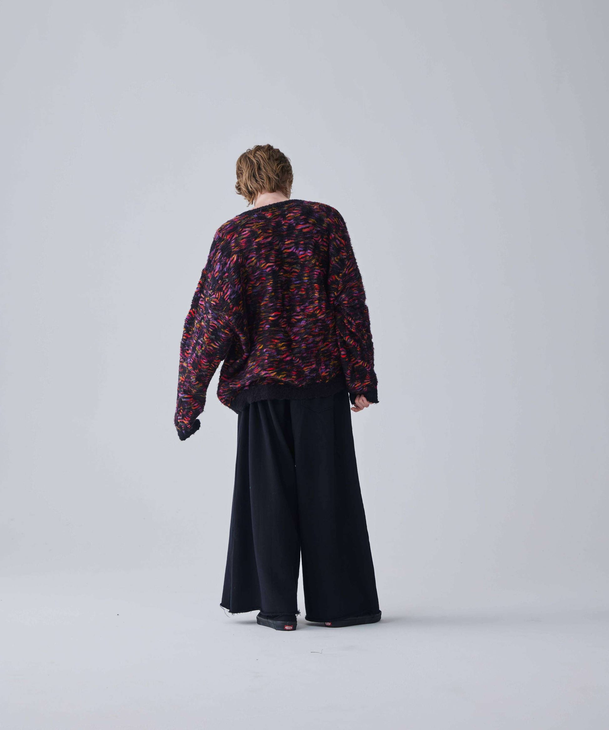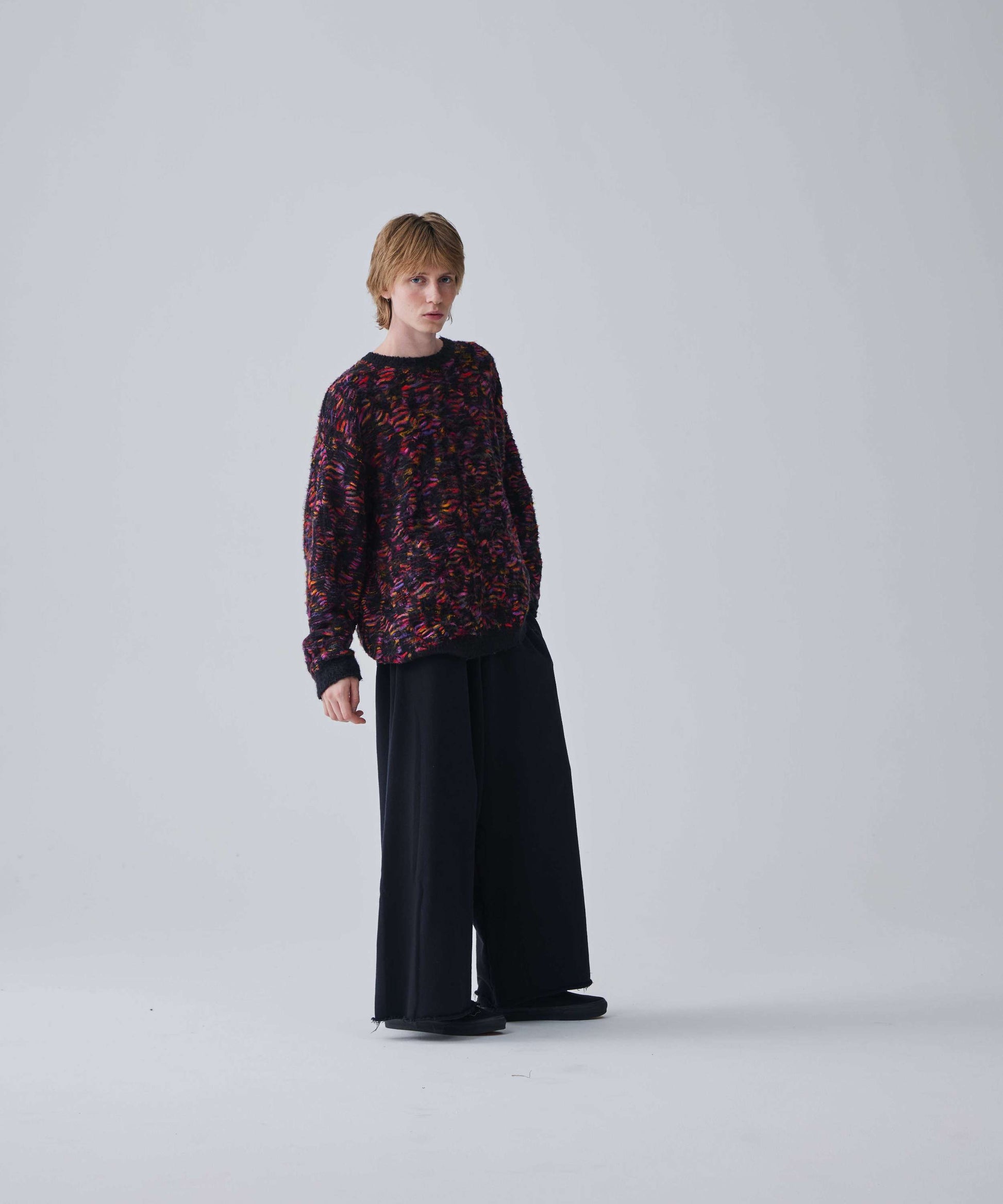 ■Spun loop yarn using only cotton uses ultra-long staple Supima worsted wool yarn and short pitch acrylic yarn dyed with Kasuri dyeing for the loop part. A knit with links knitting and tuck knitting that gives it a three-dimensional feel and a special brushed surface.