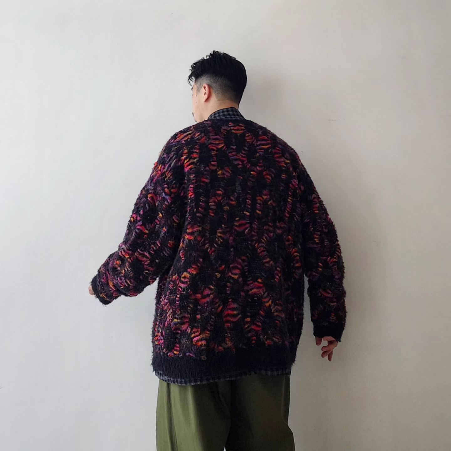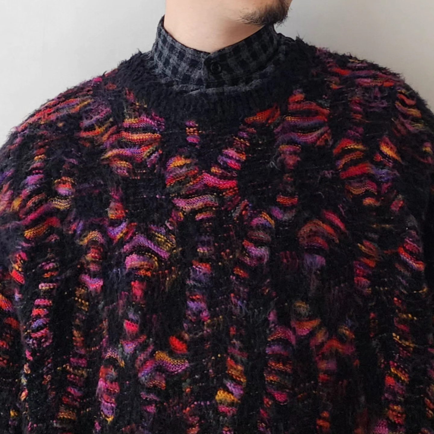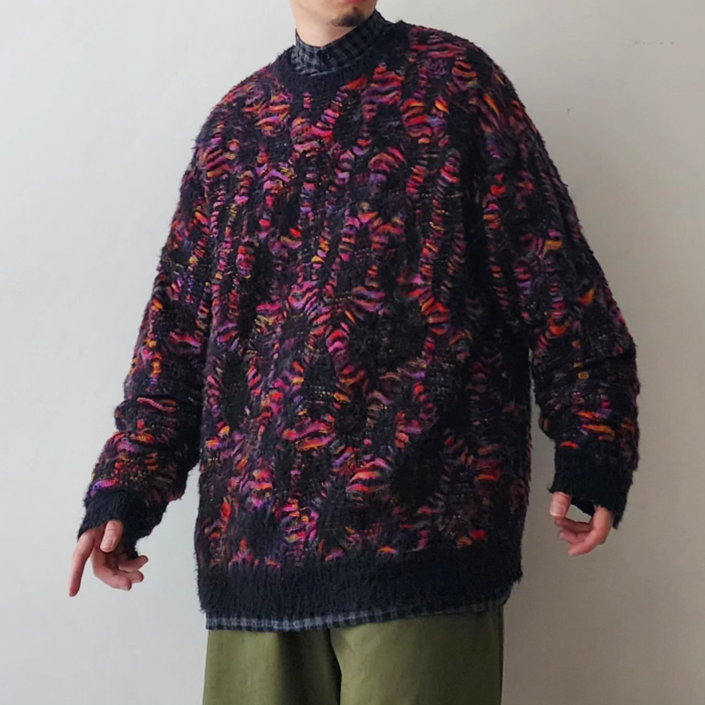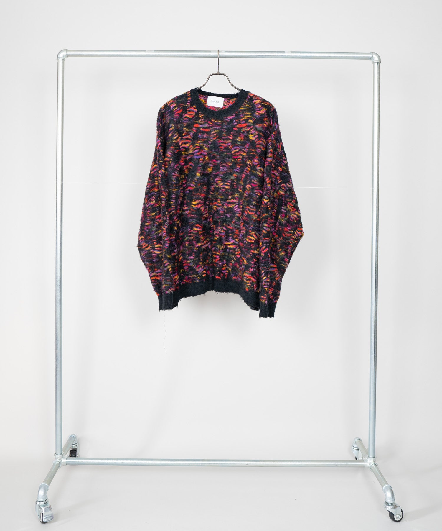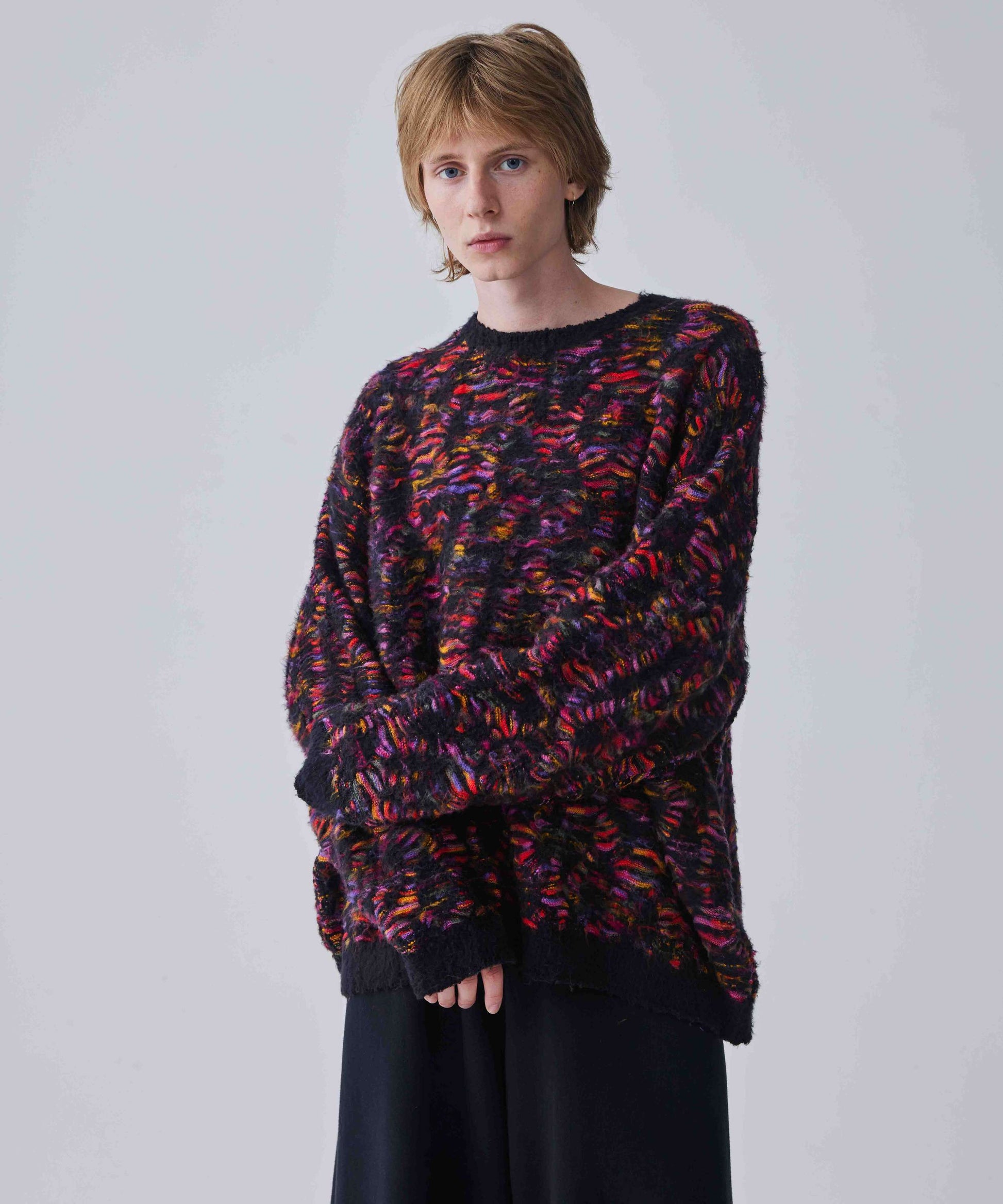 ■Spun loop yarn using only cotton uses ultra-long staple Supima worsted wool yarn and short pitch acrylic yarn dyed with Kasuri dyeing for the loop part. A knit with links knitting and tuck knitting that gives it a three-dimensional feel and a special brushed surface.