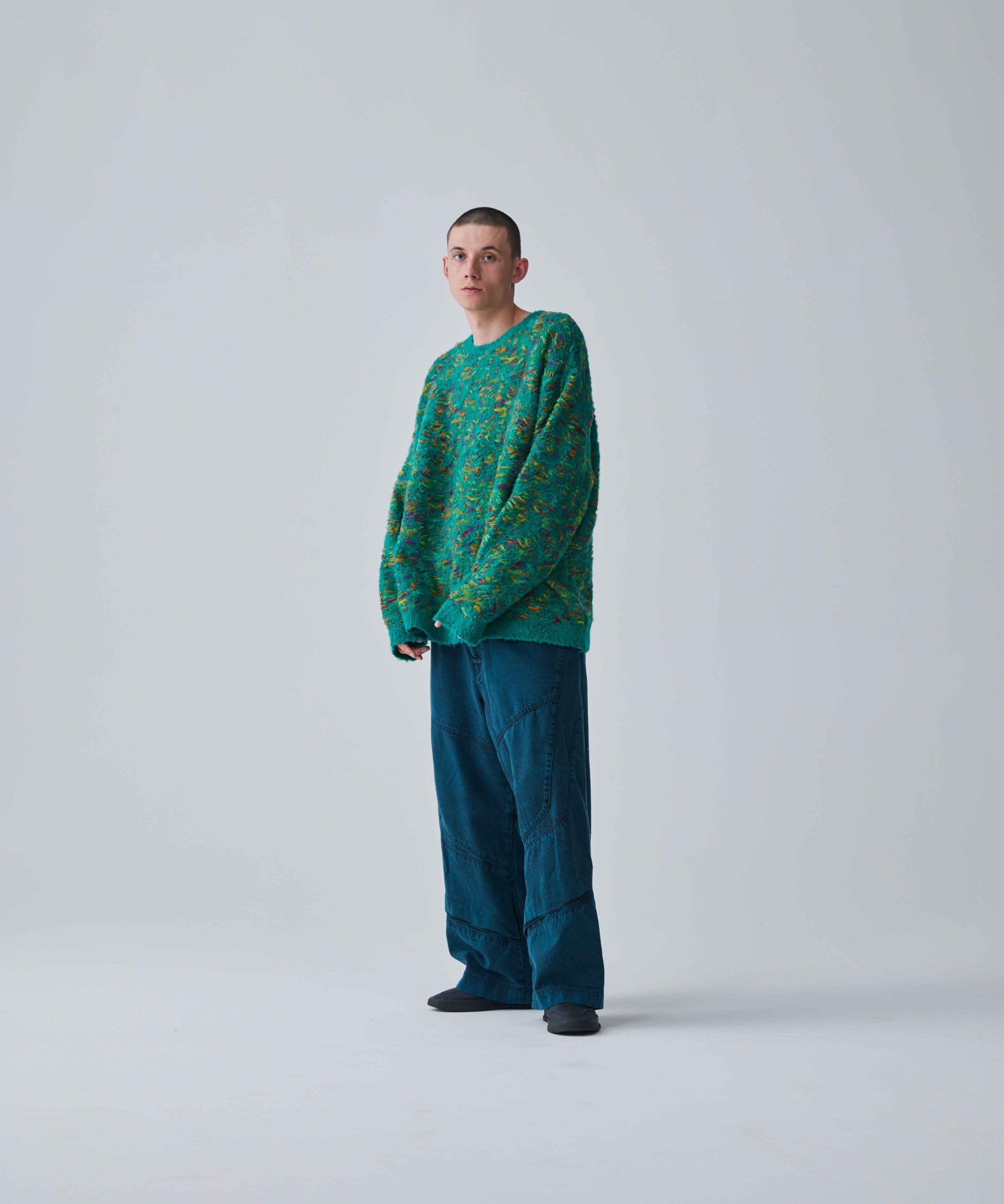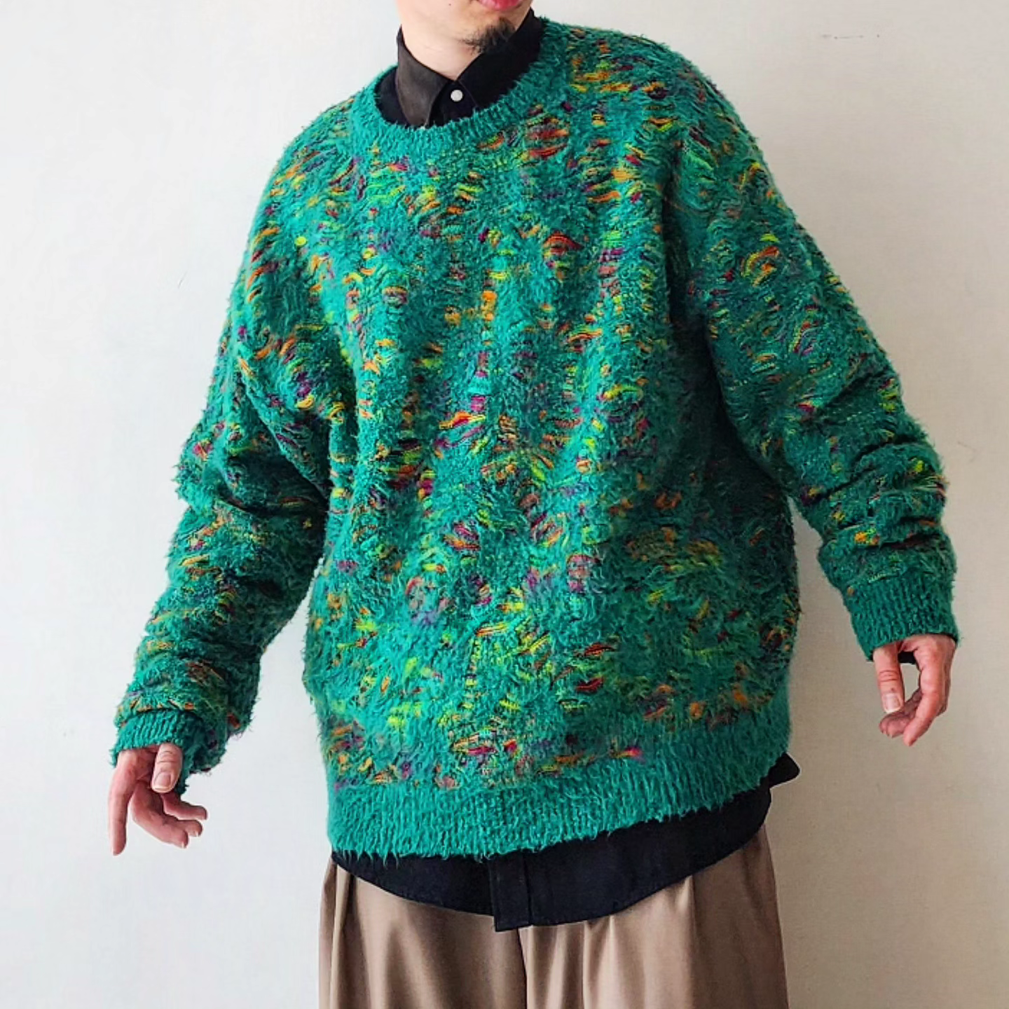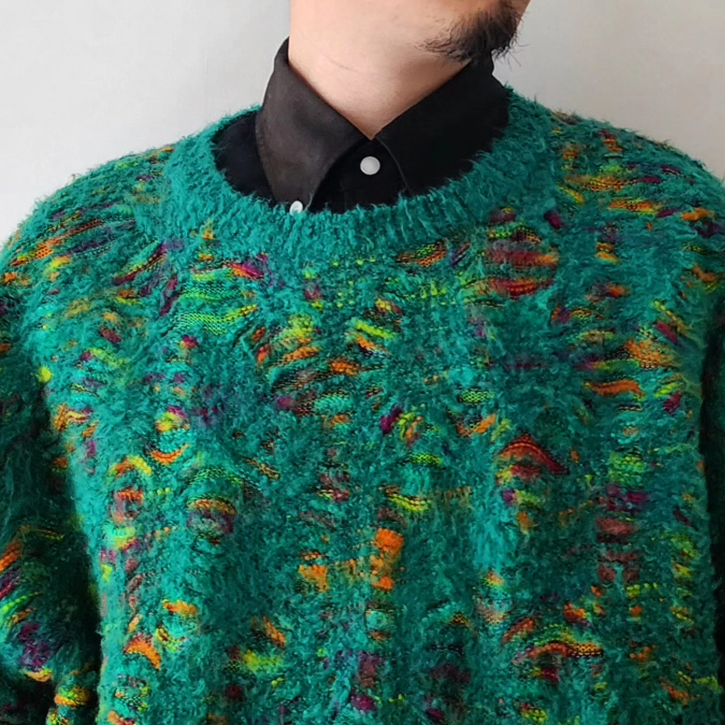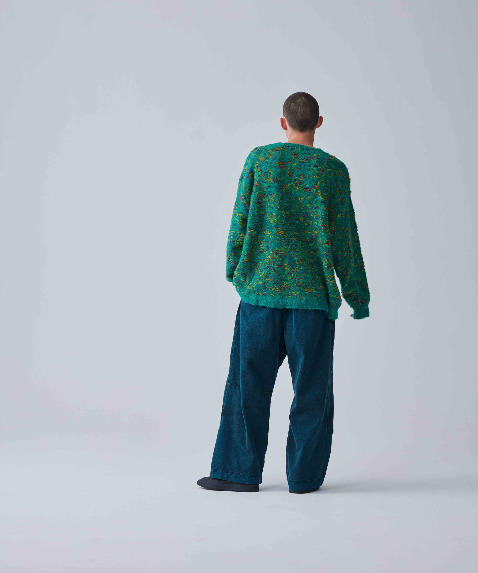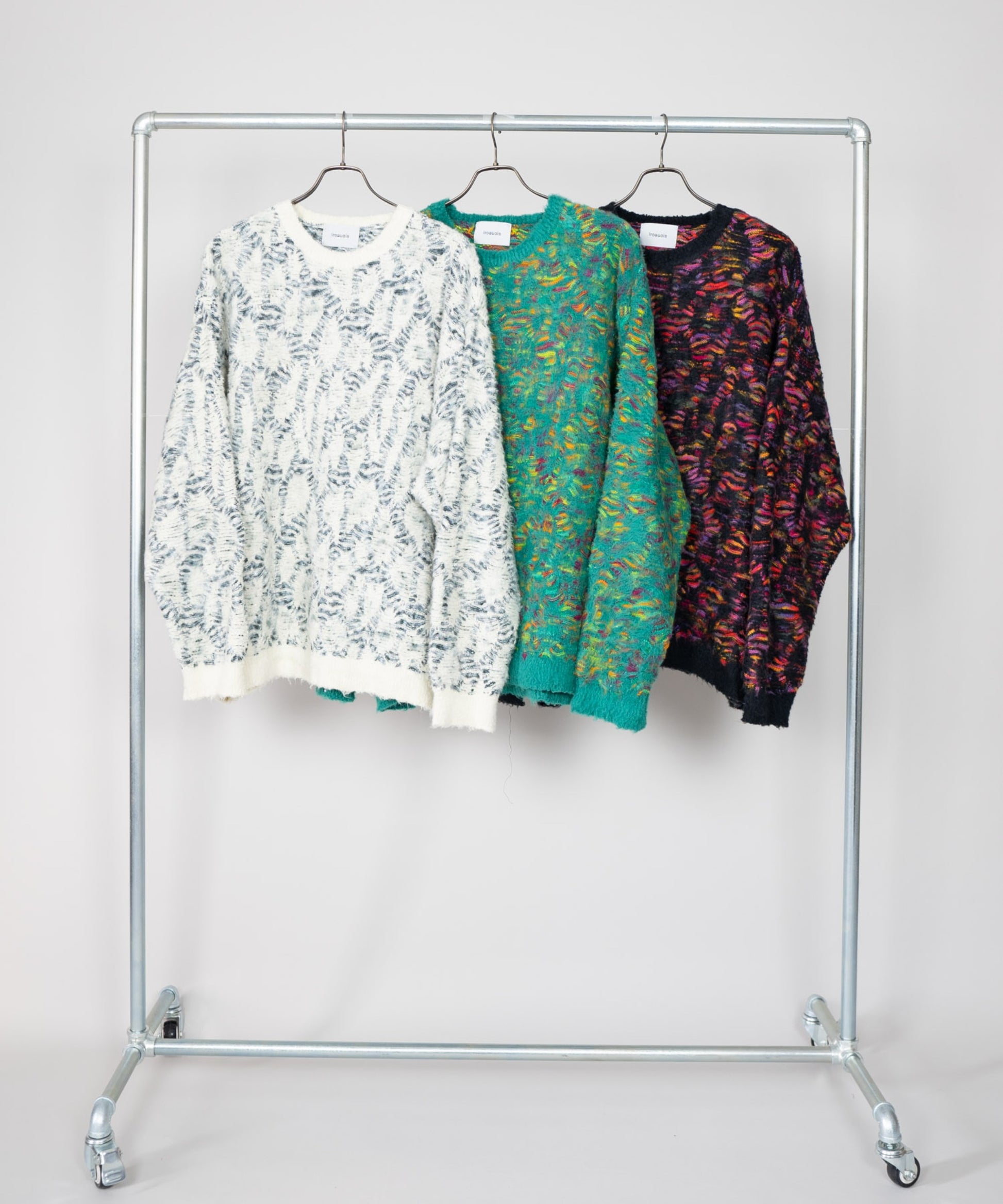 ■Spun loop yarn using only cotton uses ultra-long staple Supima worsted wool yarn and short pitch acrylic yarn dyed with Kasuri dyeing for the loop part. A knit with links knitting and tuck knitting that gives it a three-dimensional feel and a special brushed surface.