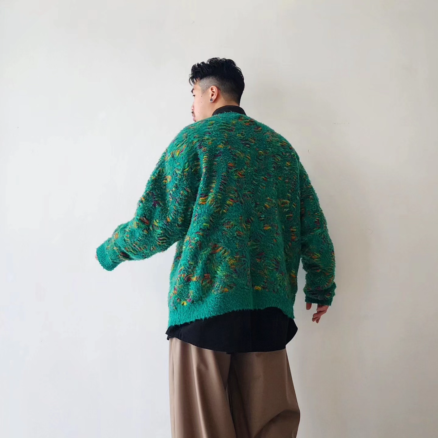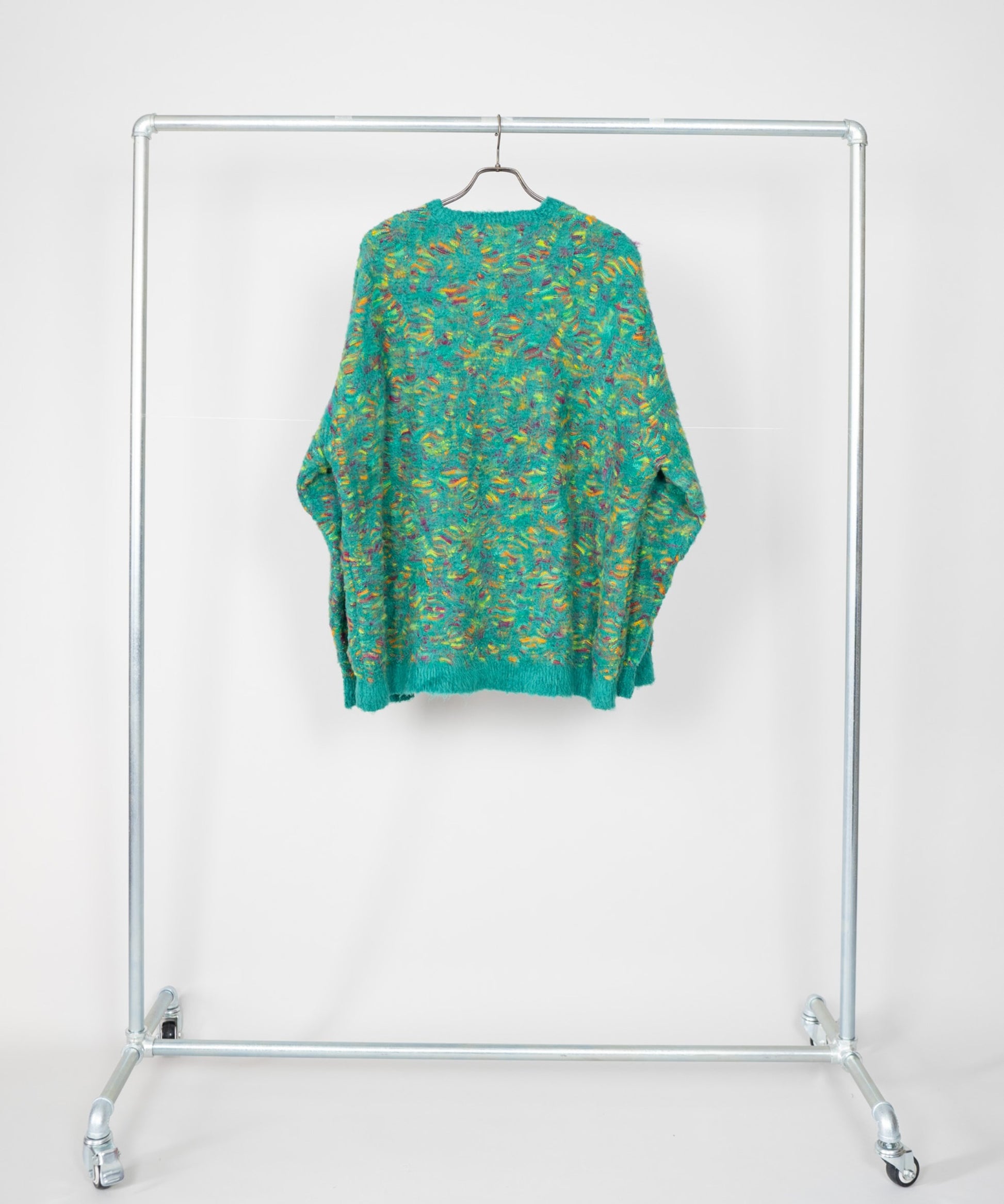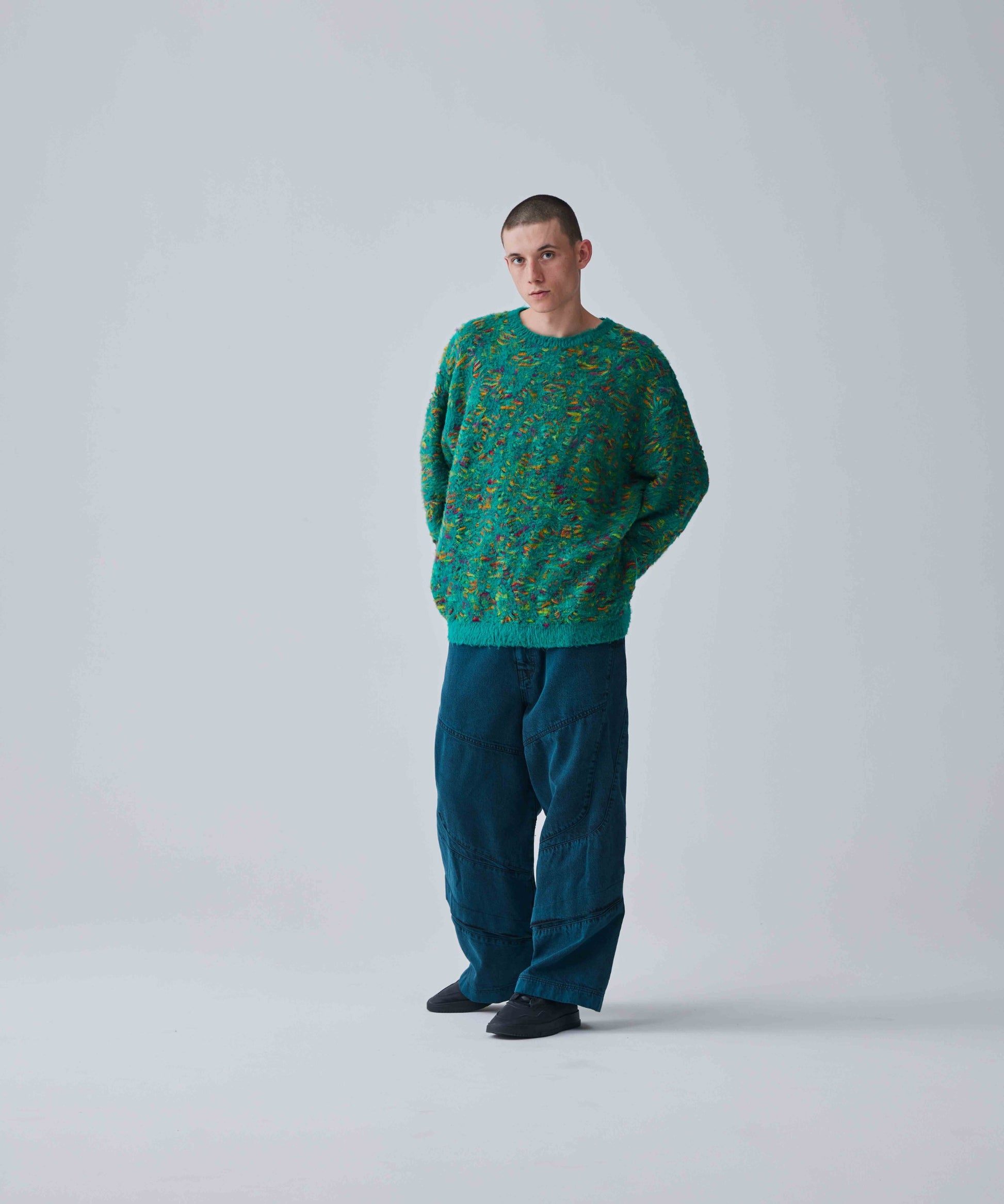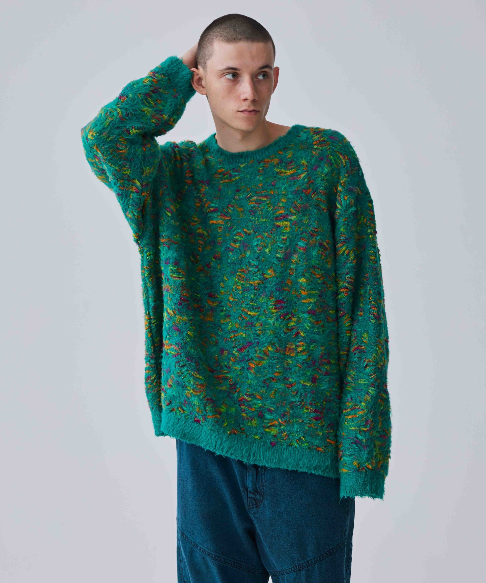 ■Spun loop yarn using only cotton uses ultra-long staple Supima worsted wool yarn and short pitch acrylic yarn dyed with Kasuri dyeing for the loop part. A knit with links knitting and tuck knitting that gives it a three-dimensional feel and a special brushed surface.