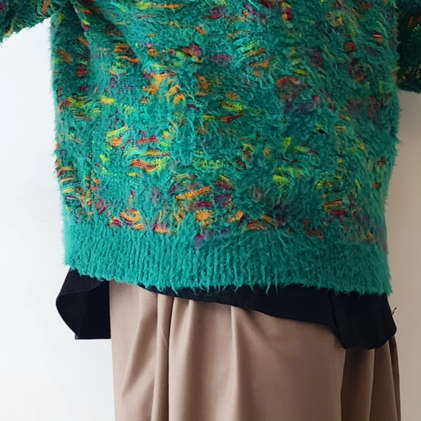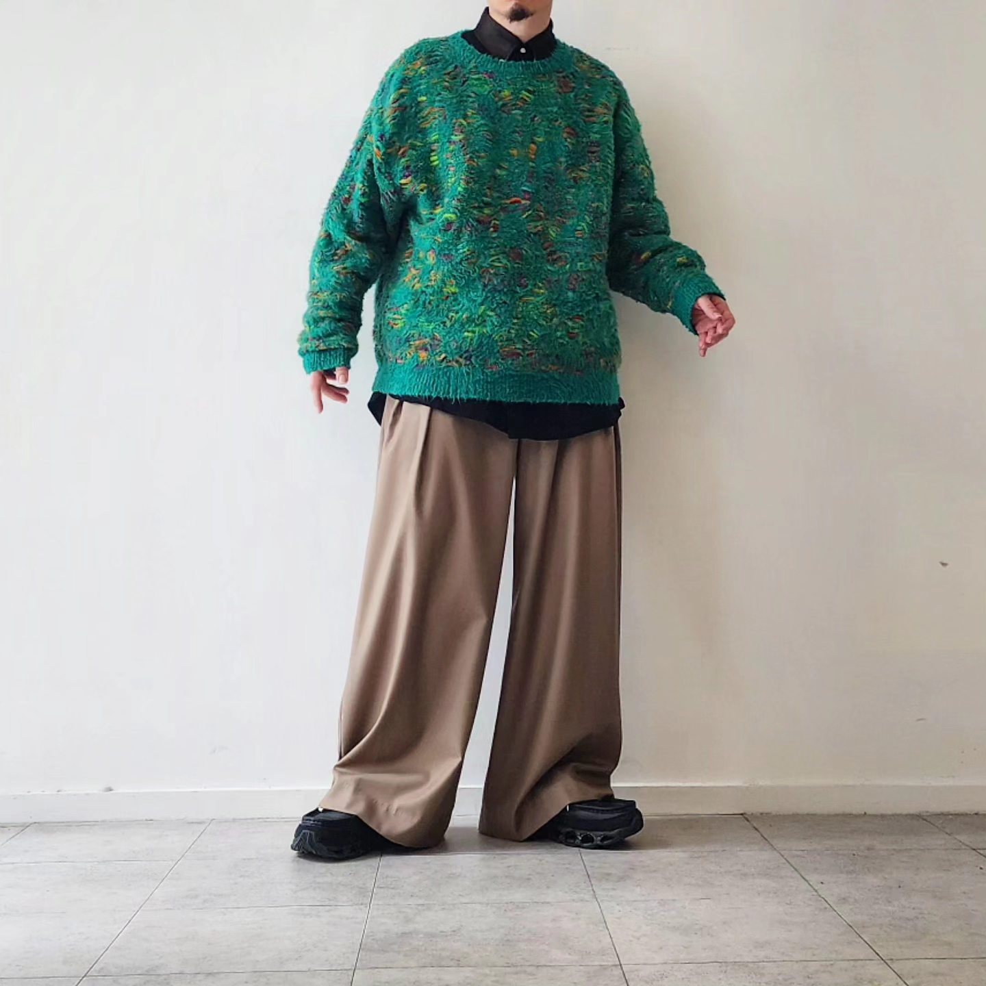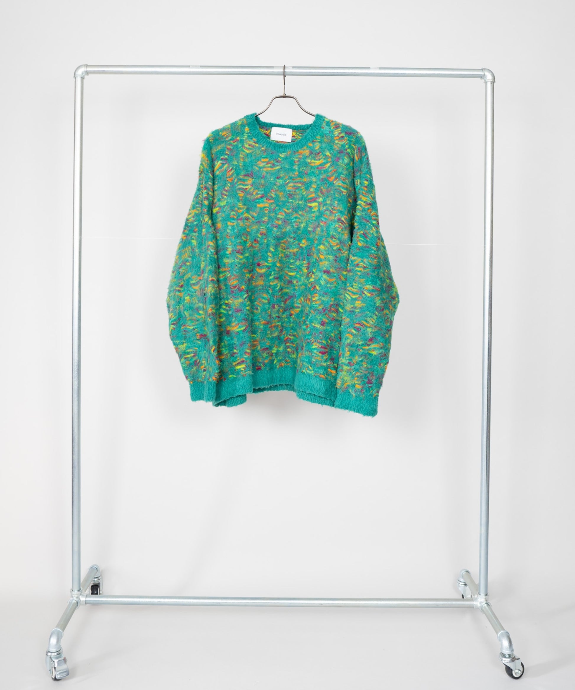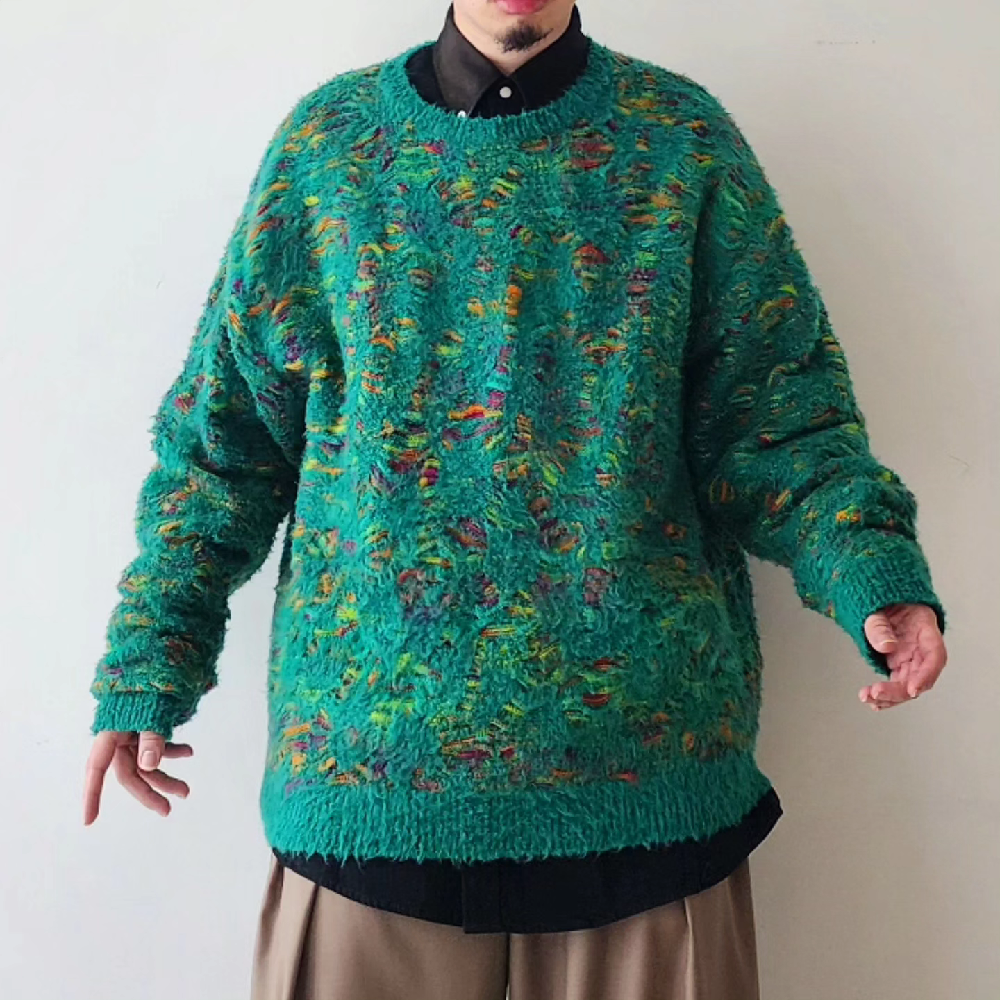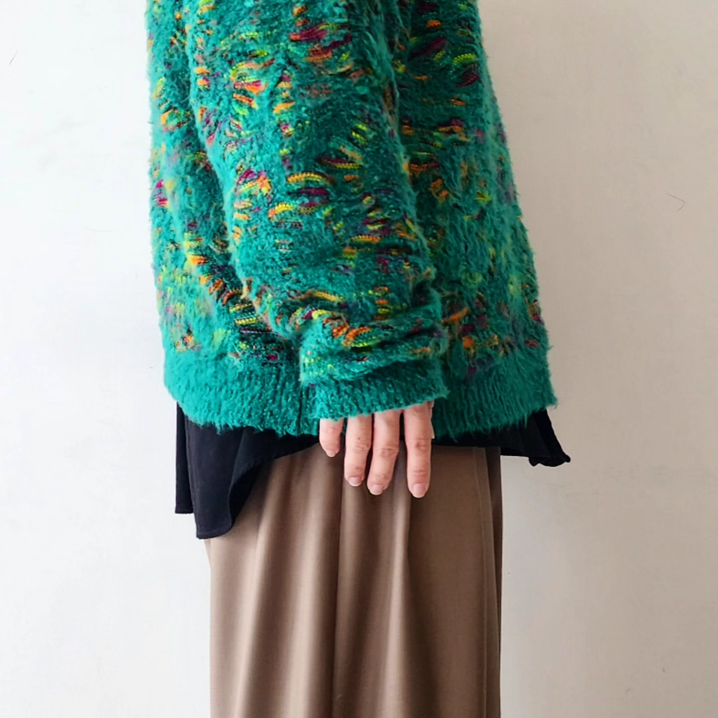 ■Spun loop yarn using only cotton uses ultra-long staple Supima worsted wool yarn and short pitch acrylic yarn dyed with Kasuri dyeing for the loop part. A knit with links knitting and tuck knitting that gives it a three-dimensional feel and a special brushed surface.