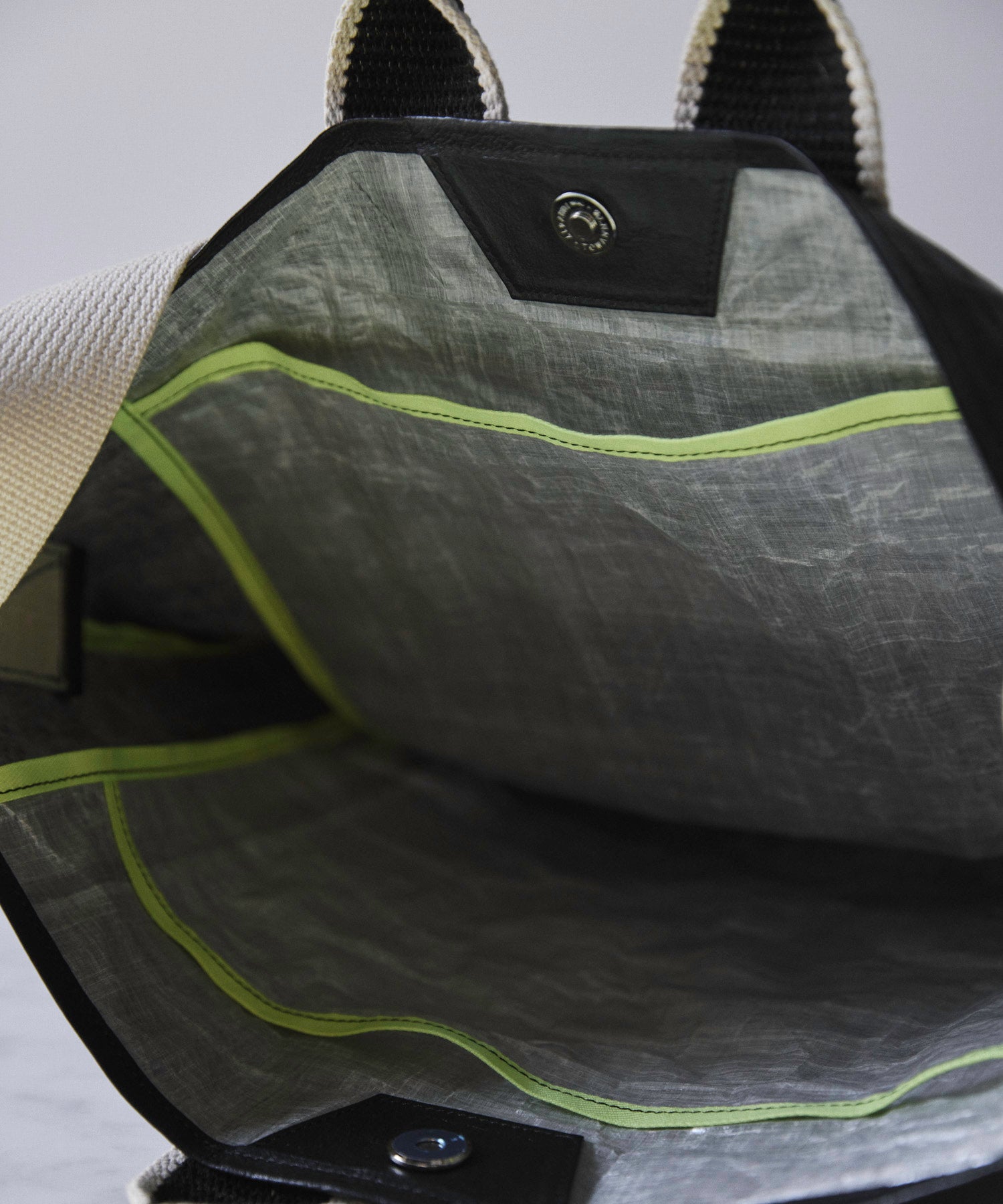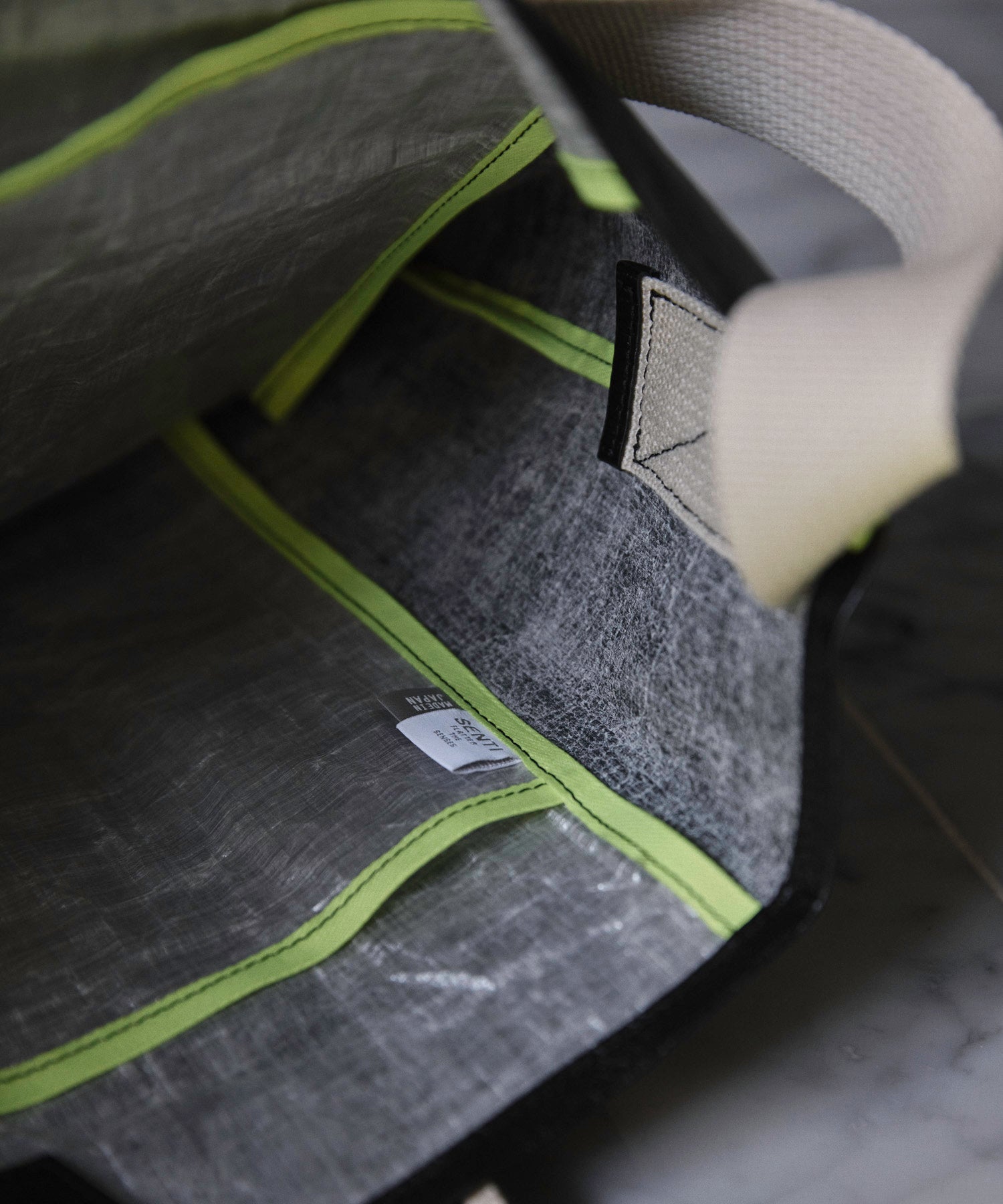 ■Dyneema laminated fabric is used for the inside pockets on both the left and right sides, and fluorescent piping tape that stands out against the translucent white material creates a pop finish that differs from the calm image on the front.