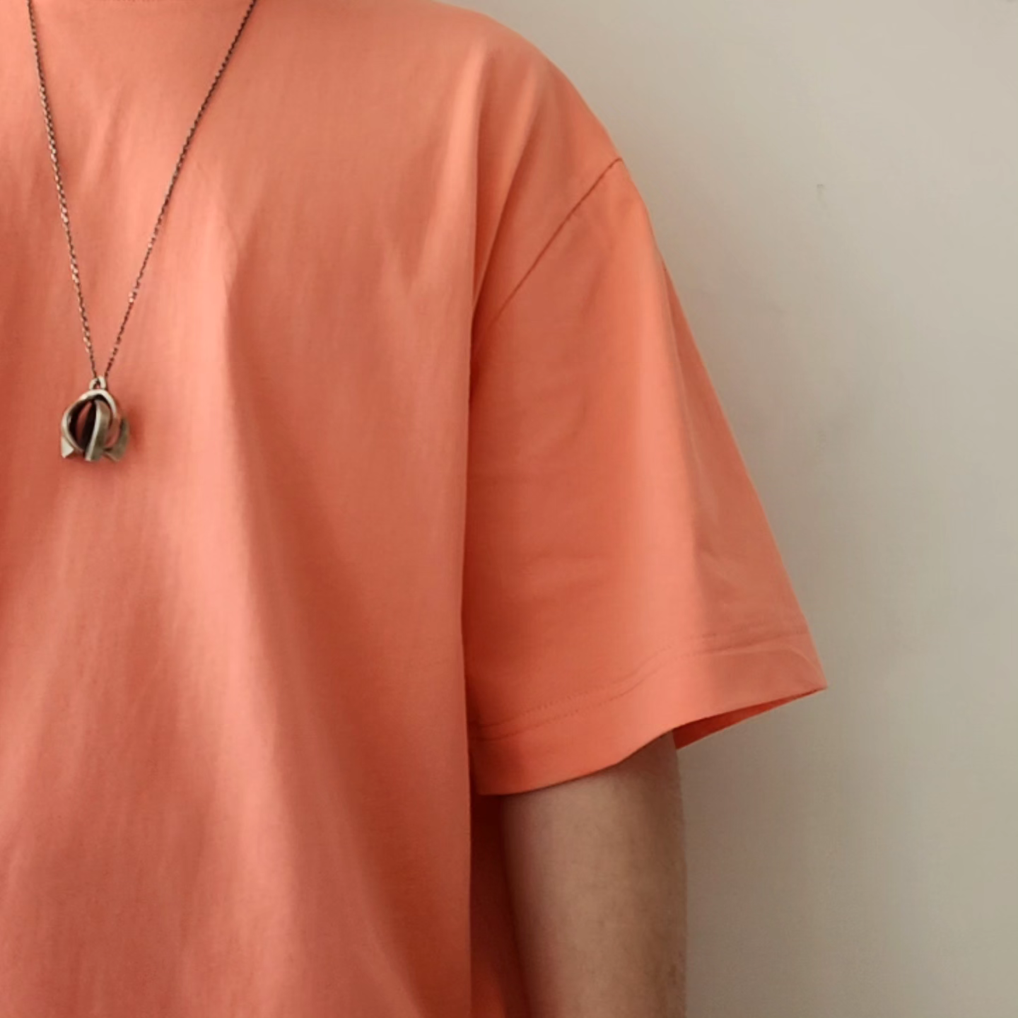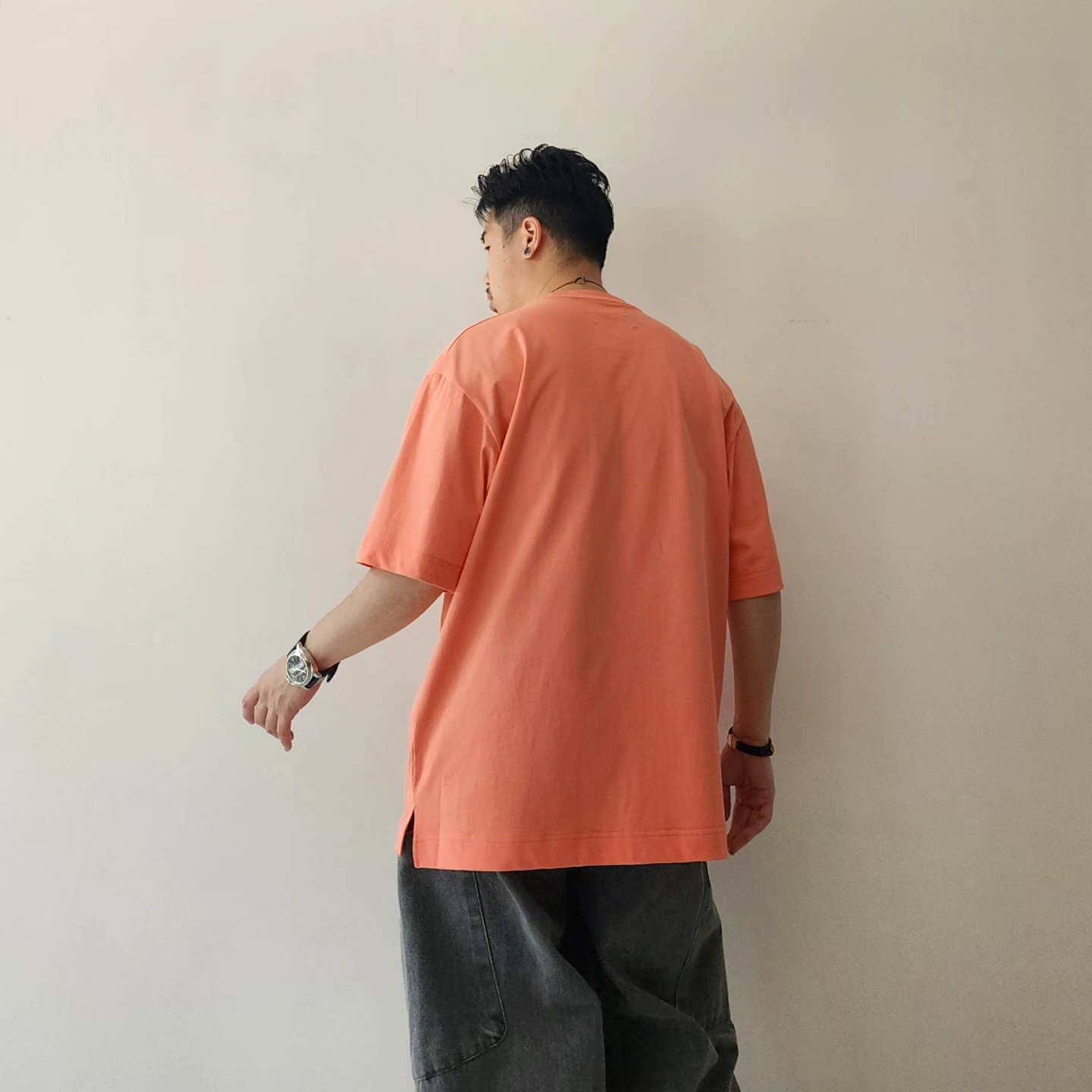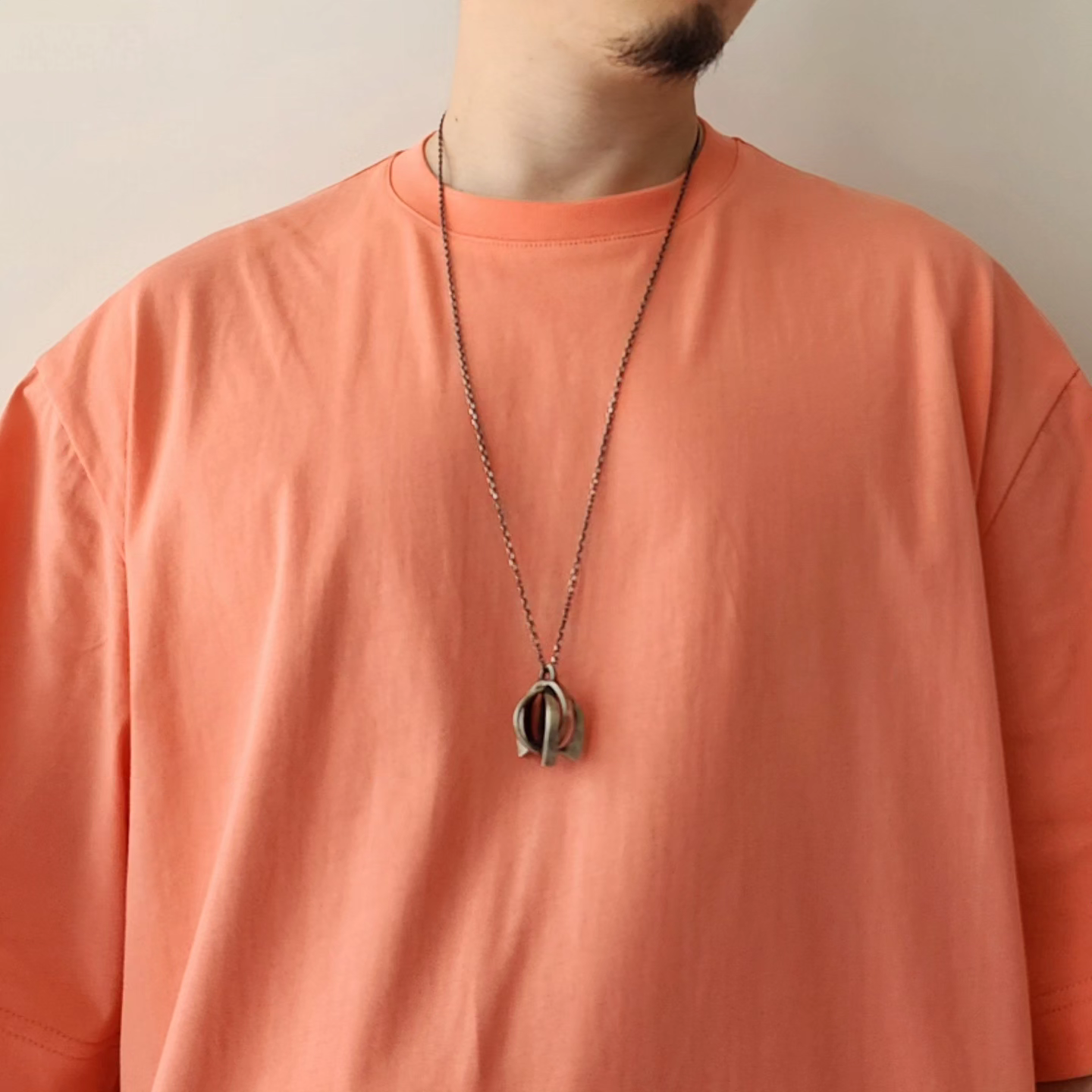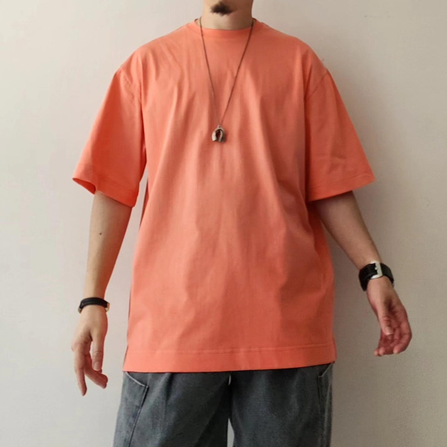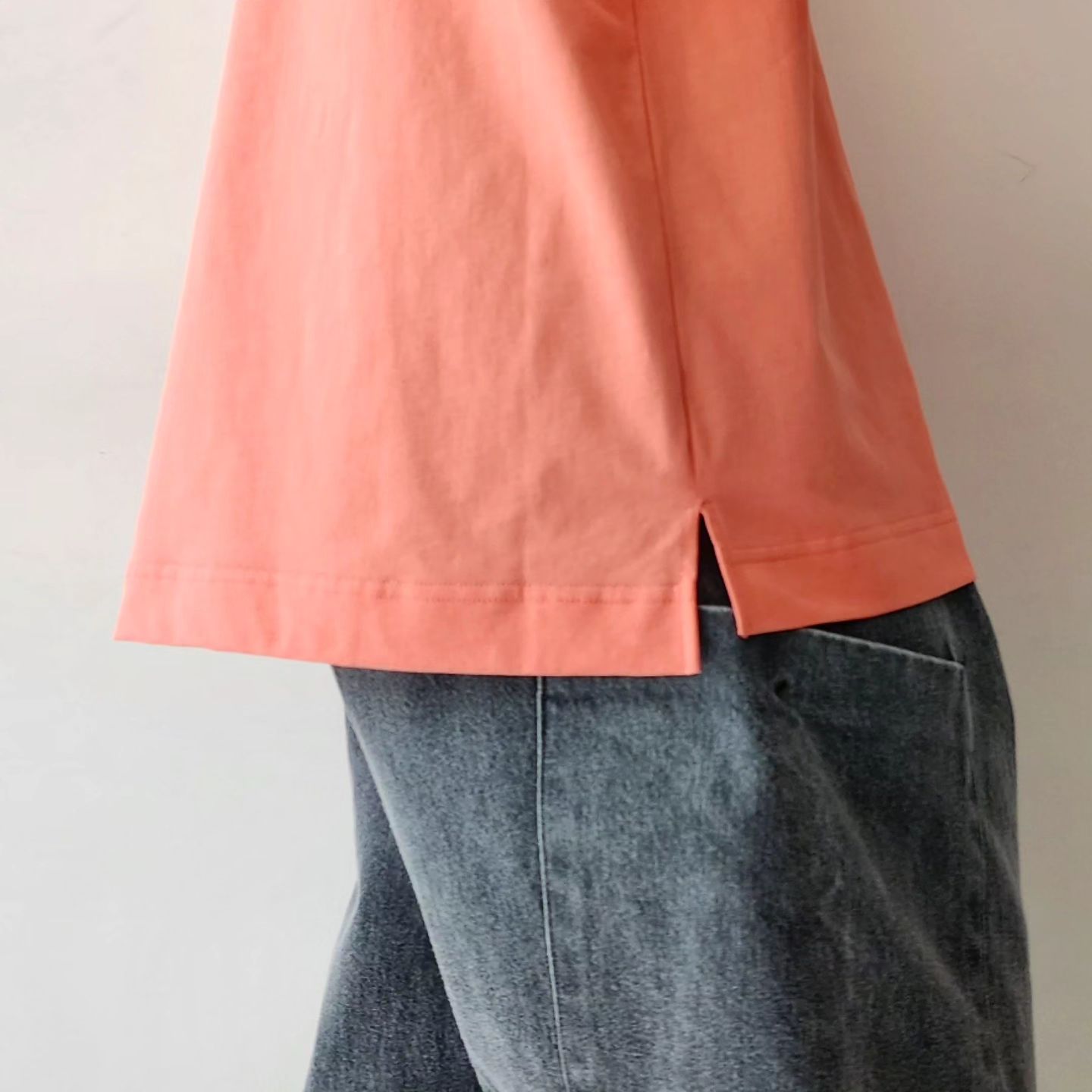 -A custom knitting machine called a 36G jacquard machine uses a tenjiku fabric that has been packed to its limit. By arranging 60/1 recycled bins and knitting them closely together, the material has a nice surface and a unique atmosphere. In addition, we have added a strong twist to the yarn, creating an unprecedented material that combines the dry touch with the sliminess of high-quality yarn. In addition, by applying a special treatment to the fabric, we remove the fuzz and create a unique T-shirt material that is unlike any other. By using extra-long cotton, the color of the dyeing is beautifully finished.