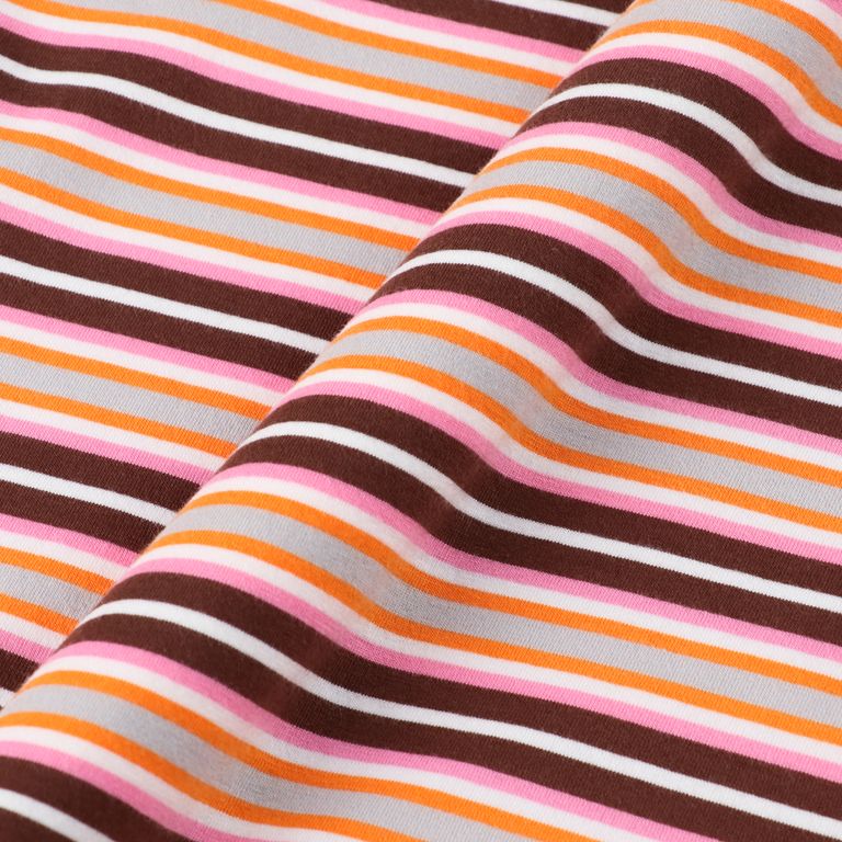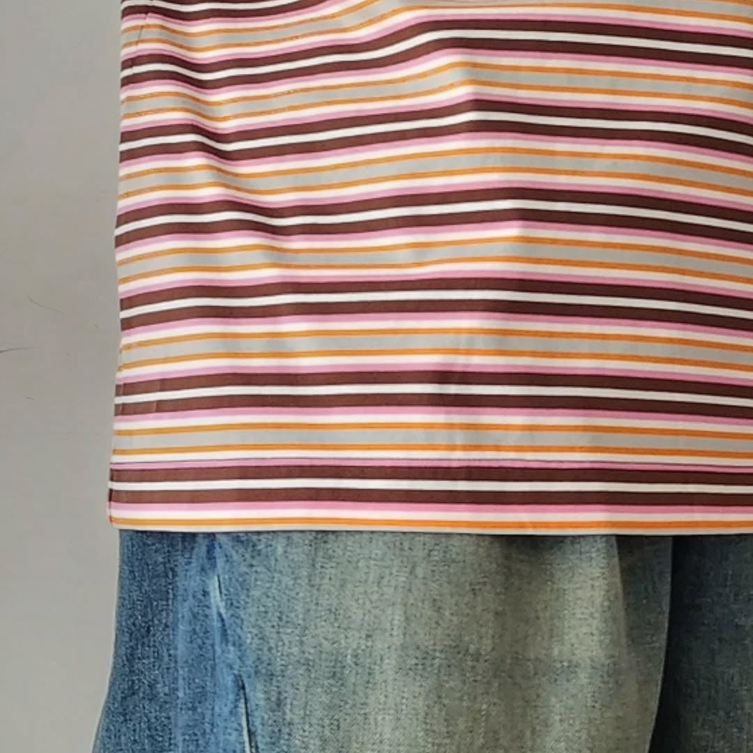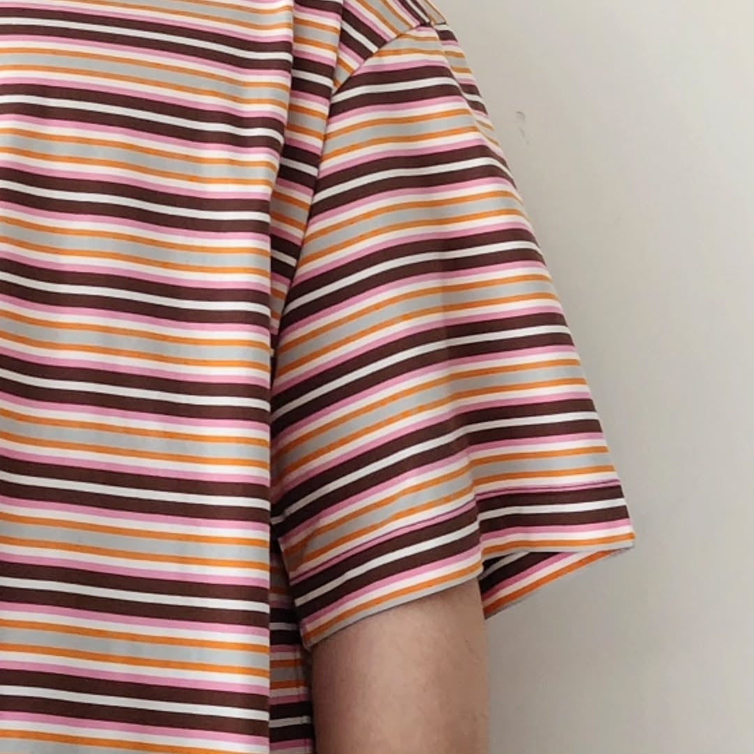 This item was made using organic Suvin cotton. This short-sleeved TEE features a multi-border pattern in vibrant colors.