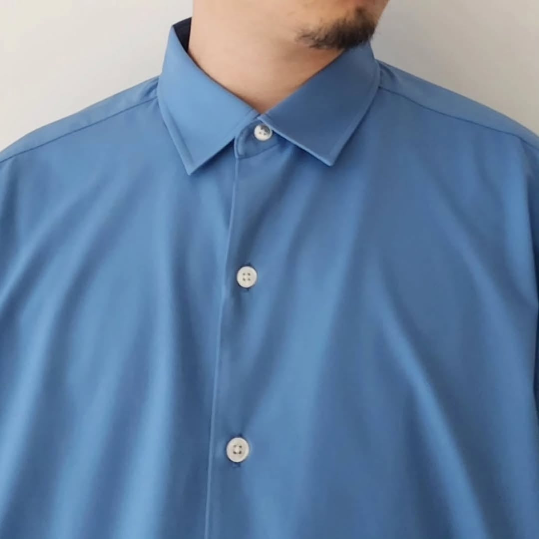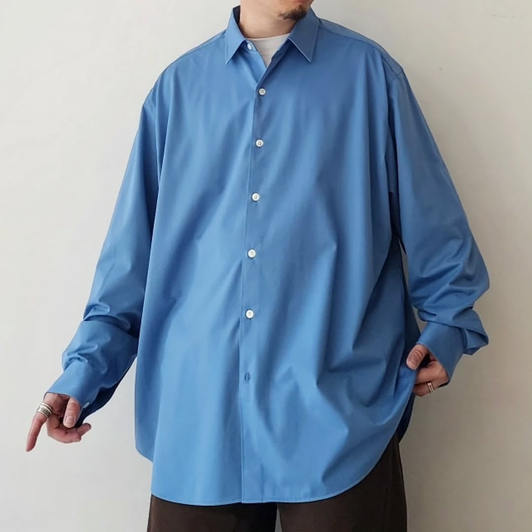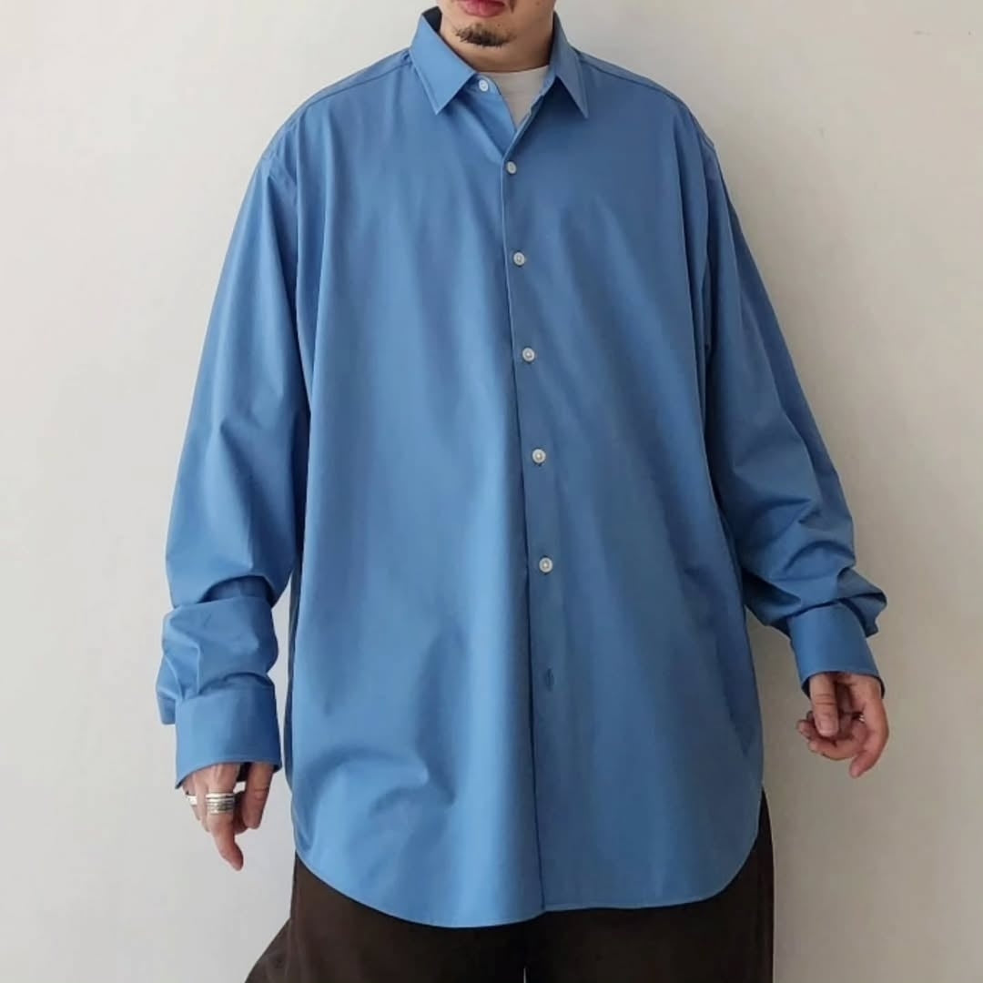 This shirt is made with a super high gauge of 46G, using a high-density plain weave of typewriter fabric. It's a regular collar shirt with a relaxed silhouette that exudes the "atmosphere" vibe.