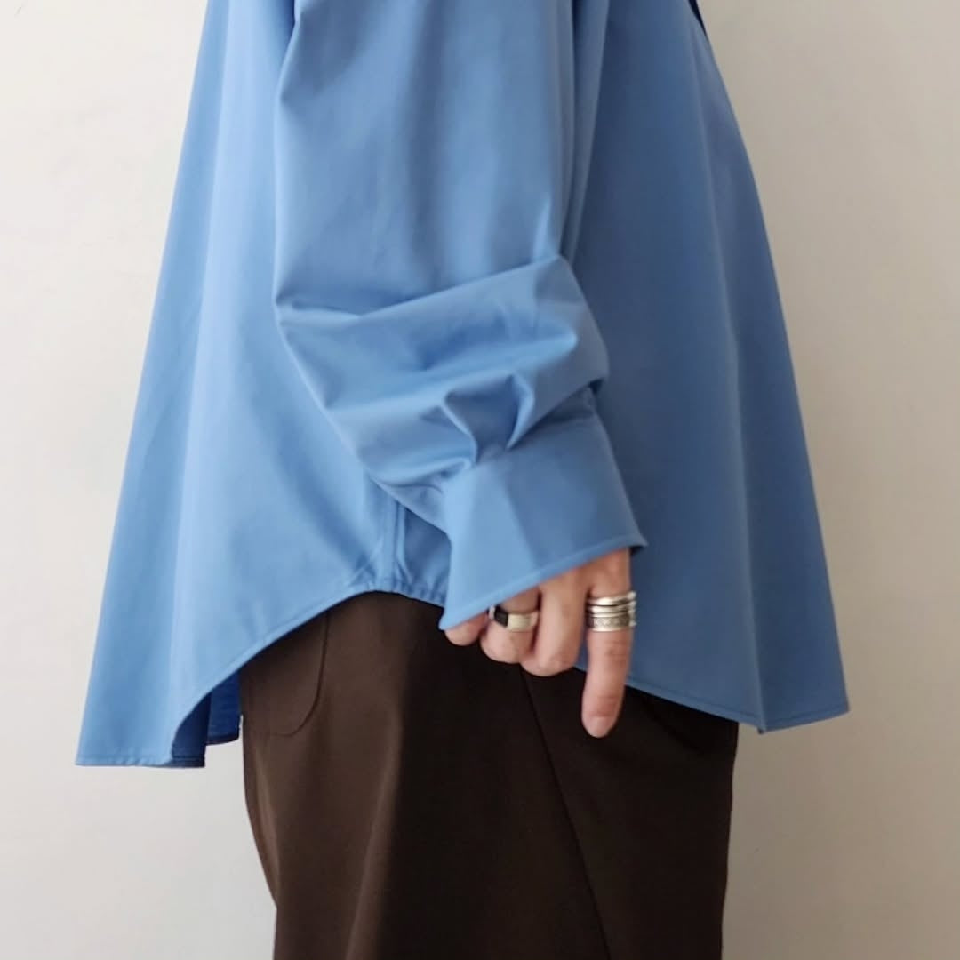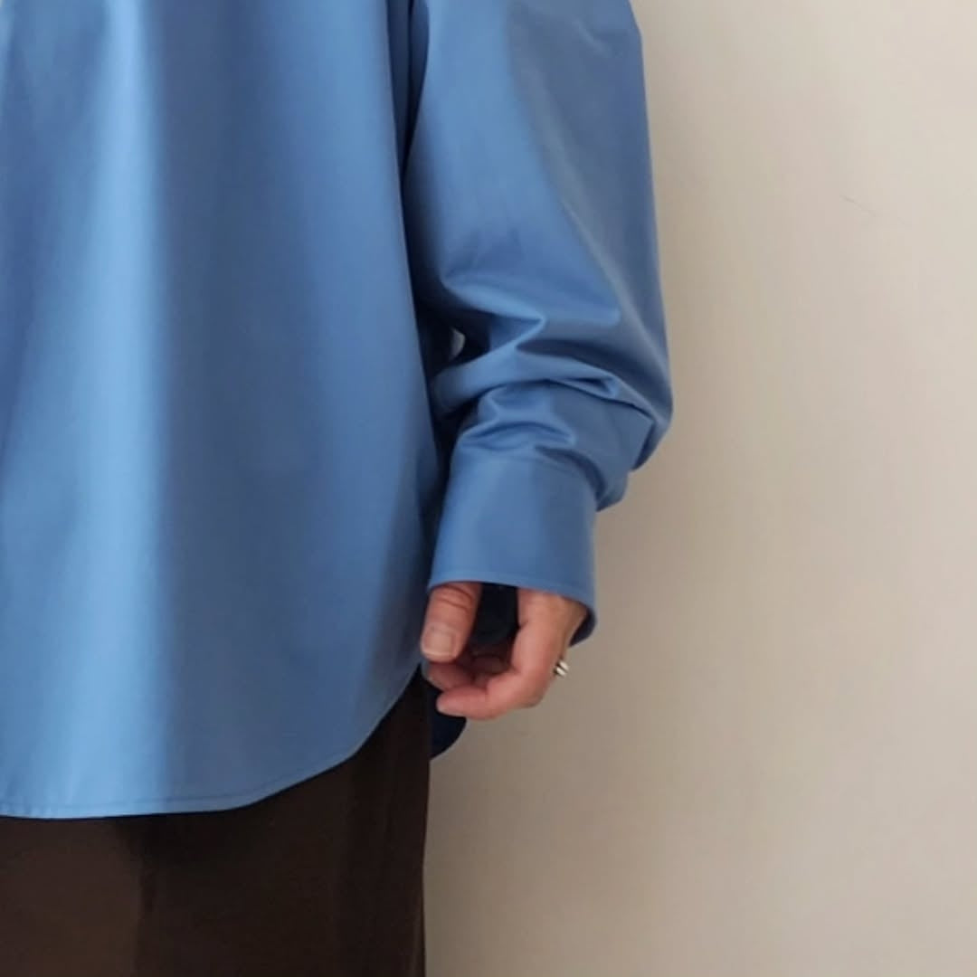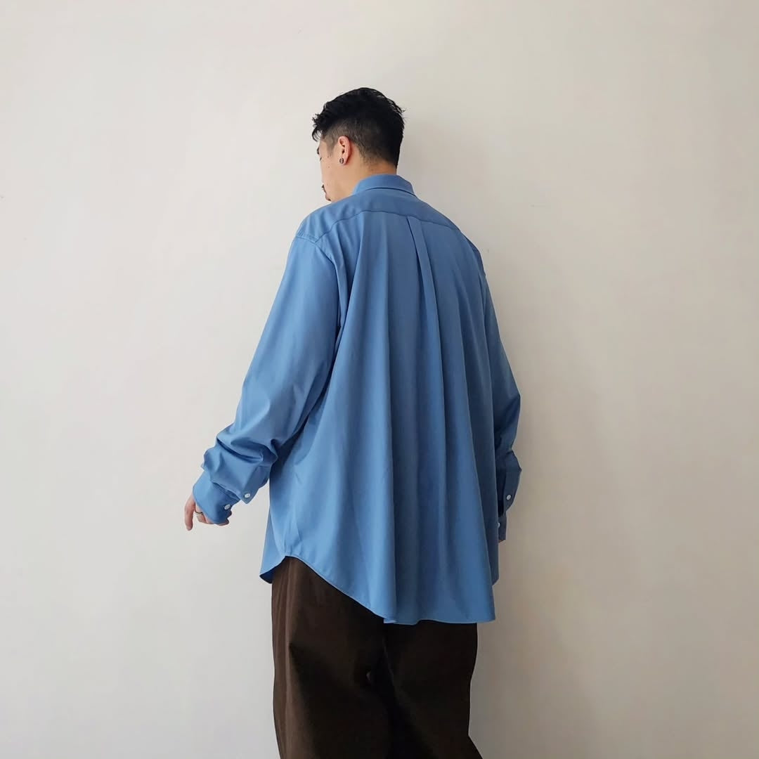 This shirt is made with a super high gauge of 46G, using a high-density plain weave of typewriter fabric. It's a regular collar shirt with a relaxed silhouette that exudes the "atmosphere" vibe.