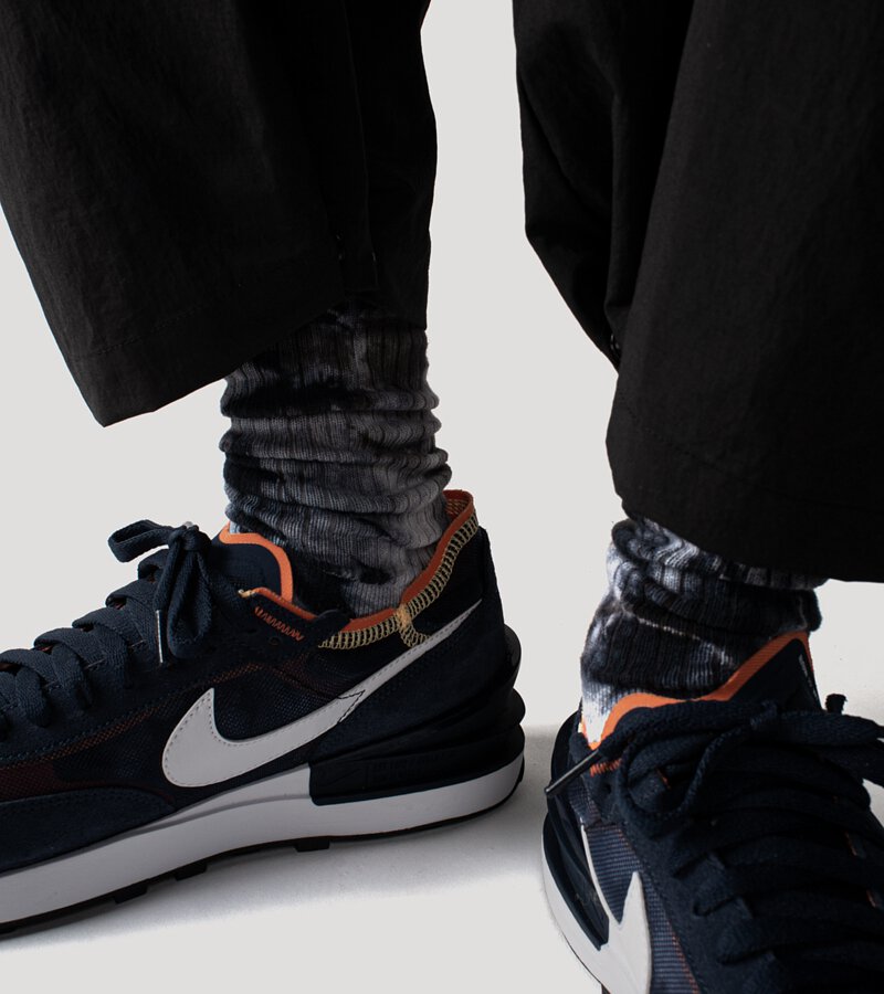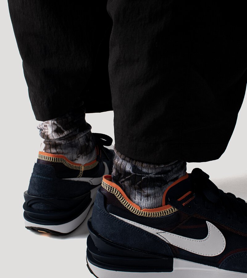 渲染部分同樣與手工染廠研議設計,採用二次綁染與套染的技法,將顏色堆疊交錯於襪身中,切合主題表現紊亂的渲染紋理。而 Layers 系列為 Loose fit 鬆身輪廓,如泡泡襪般的外觀於著用時呈現隨興、自然的搭配風格。製程延續一貫使用的高品質專利材質, Skinlife® 專利銀纖維抗菌紗線、 Lycra® 專利彈性纖維加強包覆性等機能紗線,提供與城市共存所需的機能襪履。