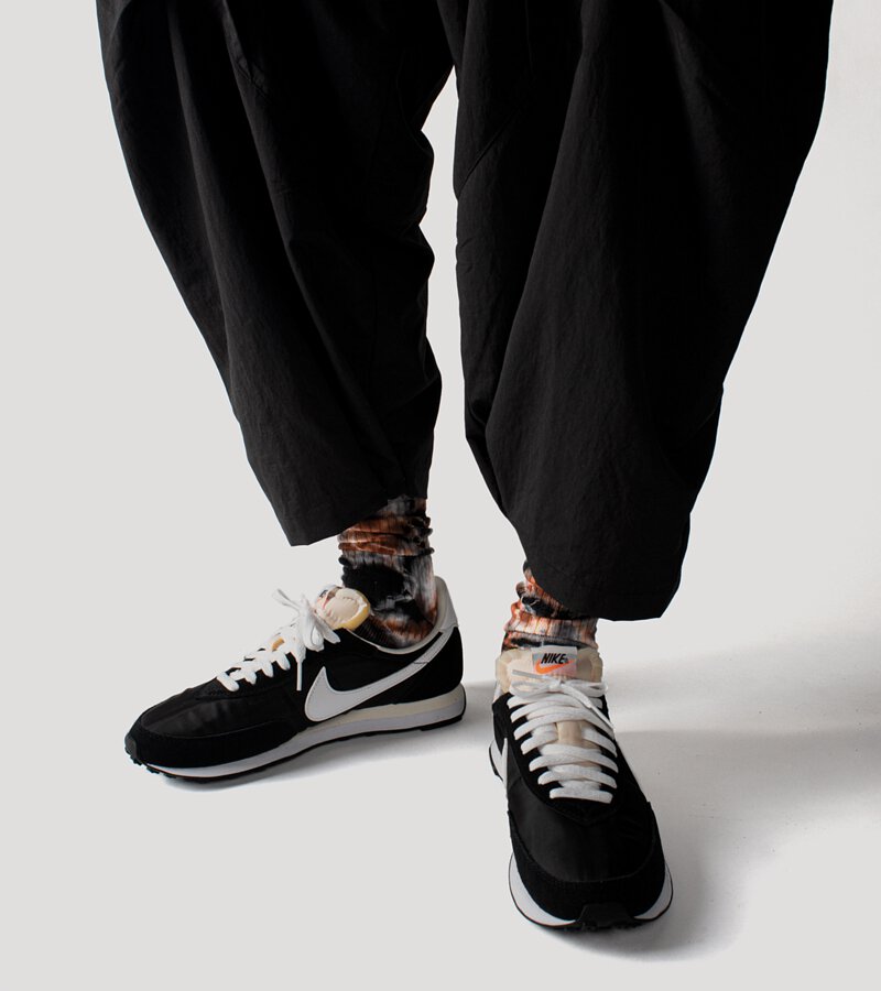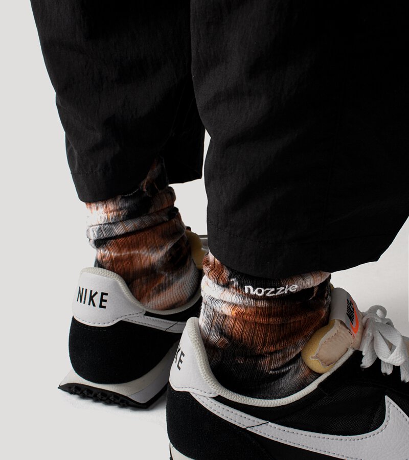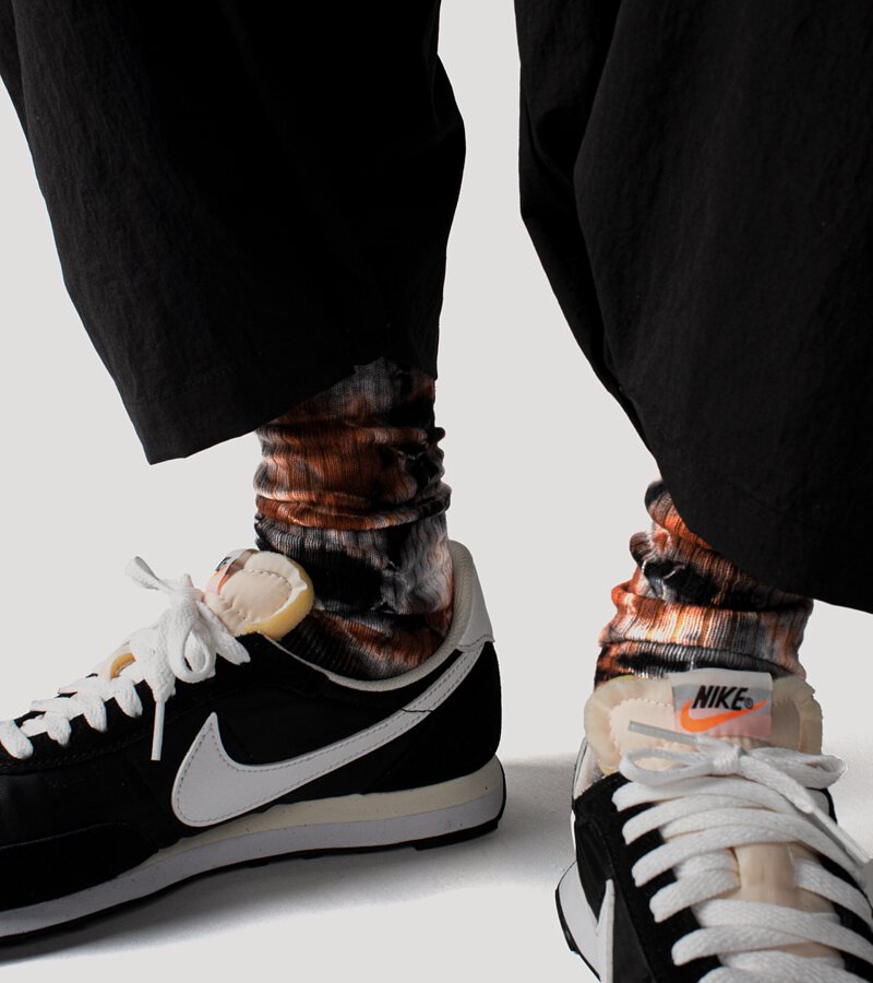 渲染部分同樣與手工染廠研議設計,採用二次綁染與套染的技法,將顏色堆疊交錯於襪身中,切合主題表現紊亂的渲染紋理。而 Layers 系列為 Loose fit 鬆身輪廓,如泡泡襪般的外觀於著用時呈現隨興、自然的搭配風格。製程延續一貫使用的高品質專利材質, Skinlife® 專利銀纖維抗菌紗線、 Lycra® 專利彈性纖維加強包覆性等機能紗線,提供與城市共存所需的機能襪履。