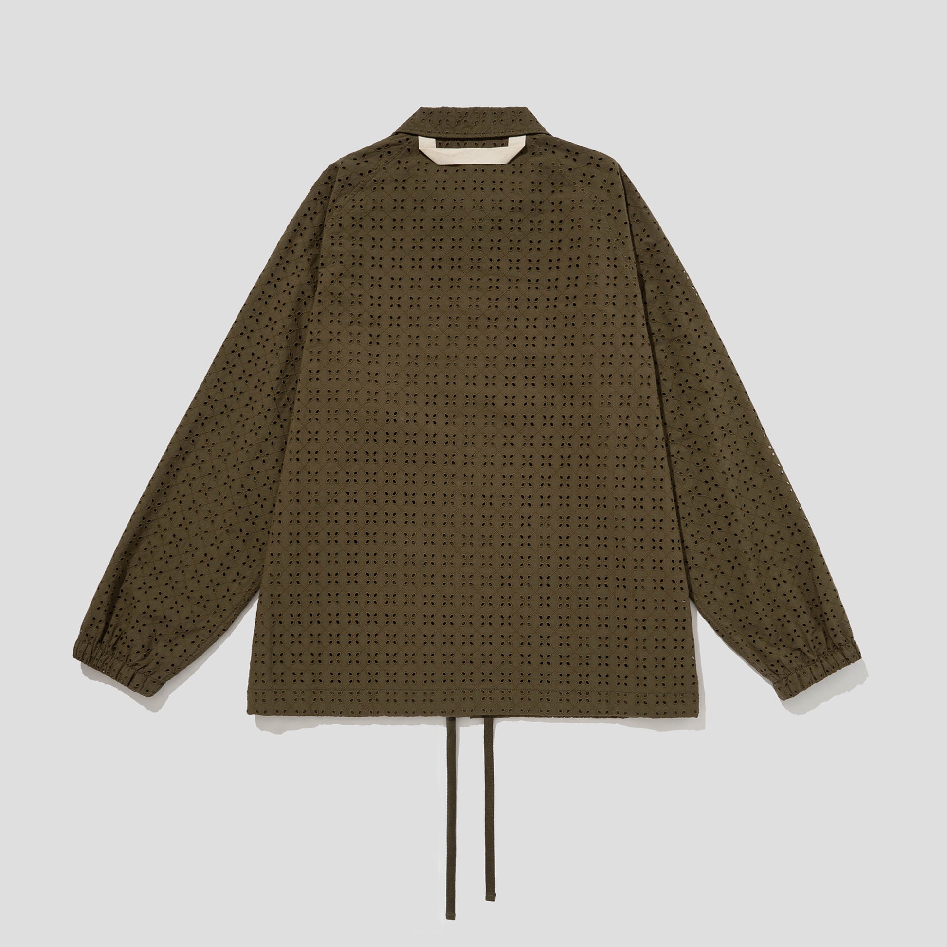 -The 'PREMIUM FLOWER LACE COACH JACKET' is made of a compact yet lightweight 40'S cotton fabric, featuring a clover-shaped embroidered lace. Its refreshing mesh fabric lining, raglan sleeves, and attention to detail make for a timeless piece.