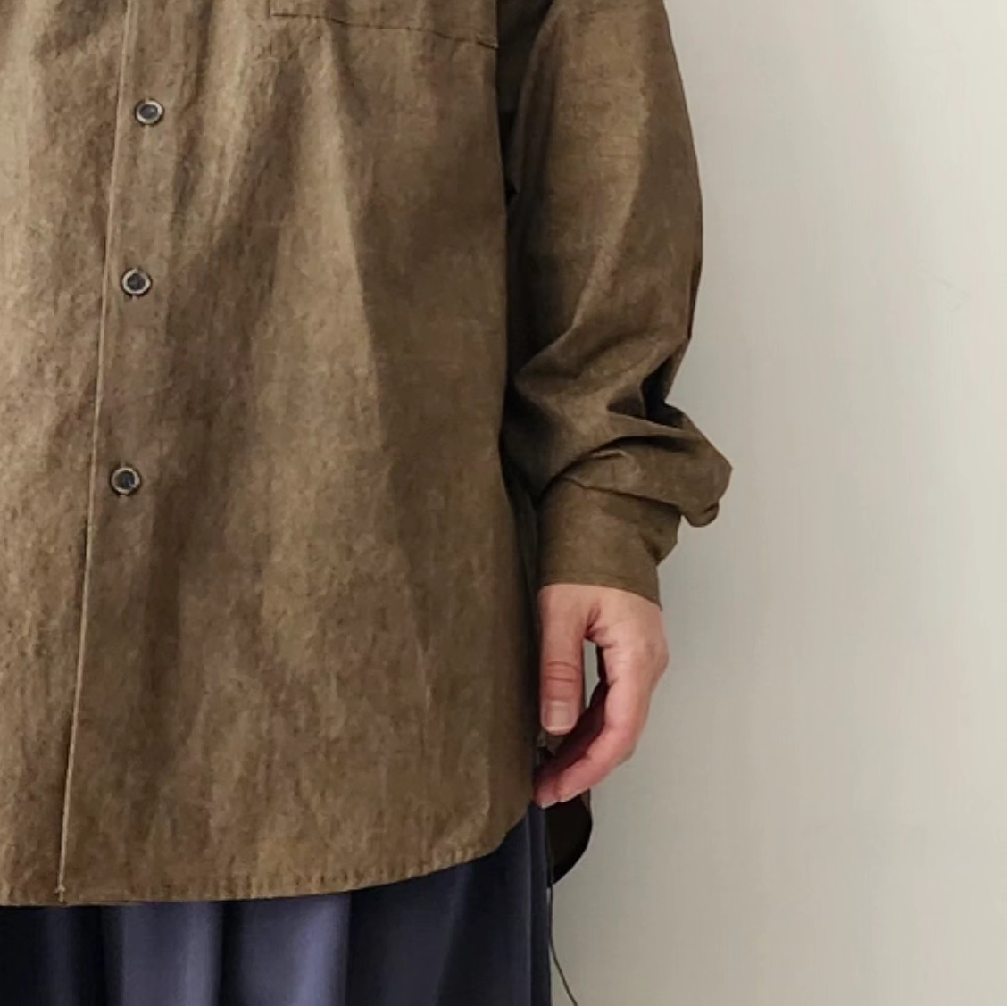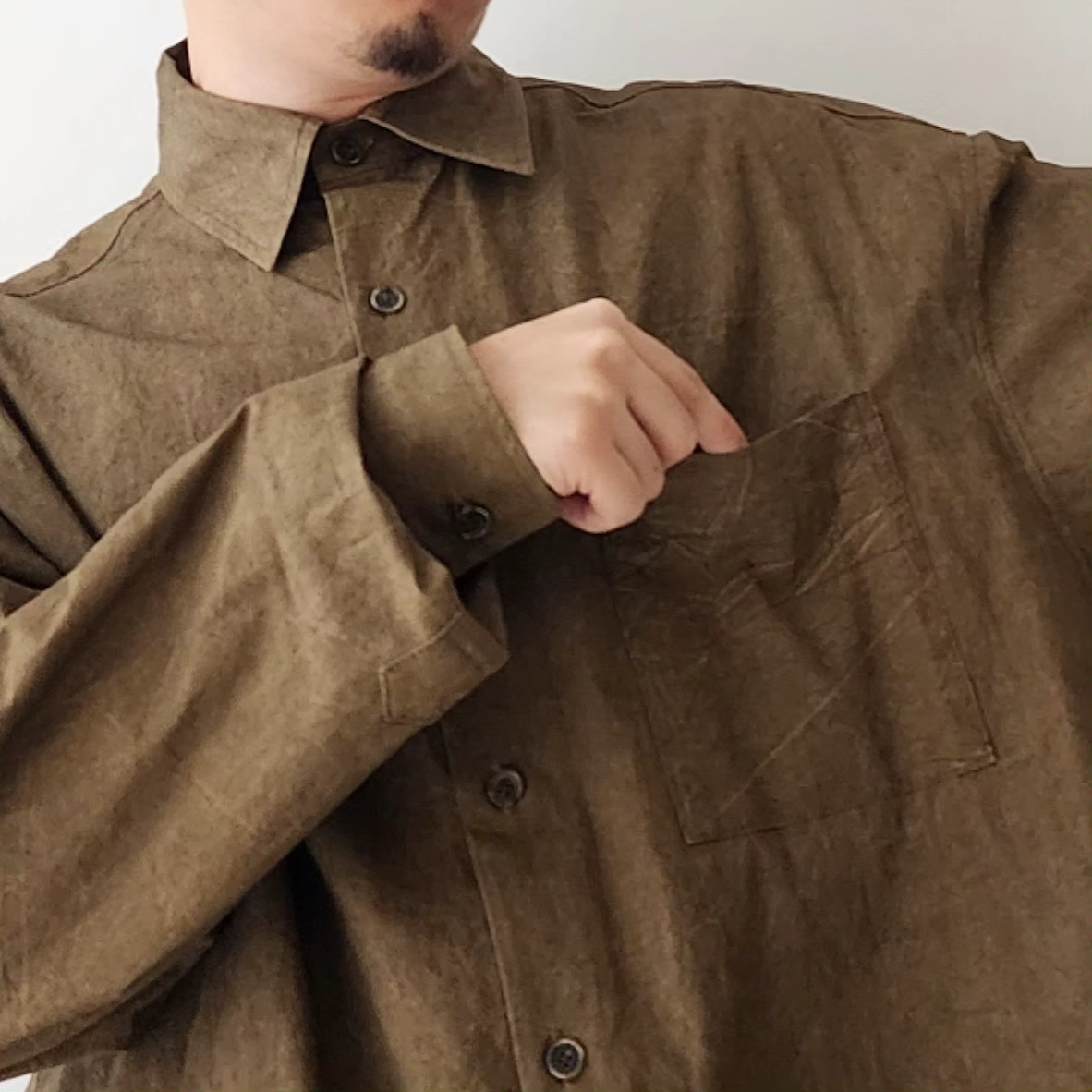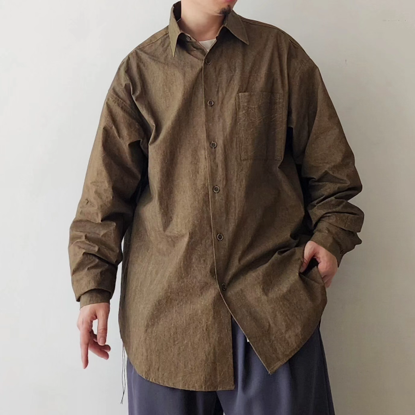 -Crafted from fabric dyed by hand using natural pigments, the 'NATURAL DYED LAZY OVER SHIRTS' offers an oversized silhouette and a luxurious structure.