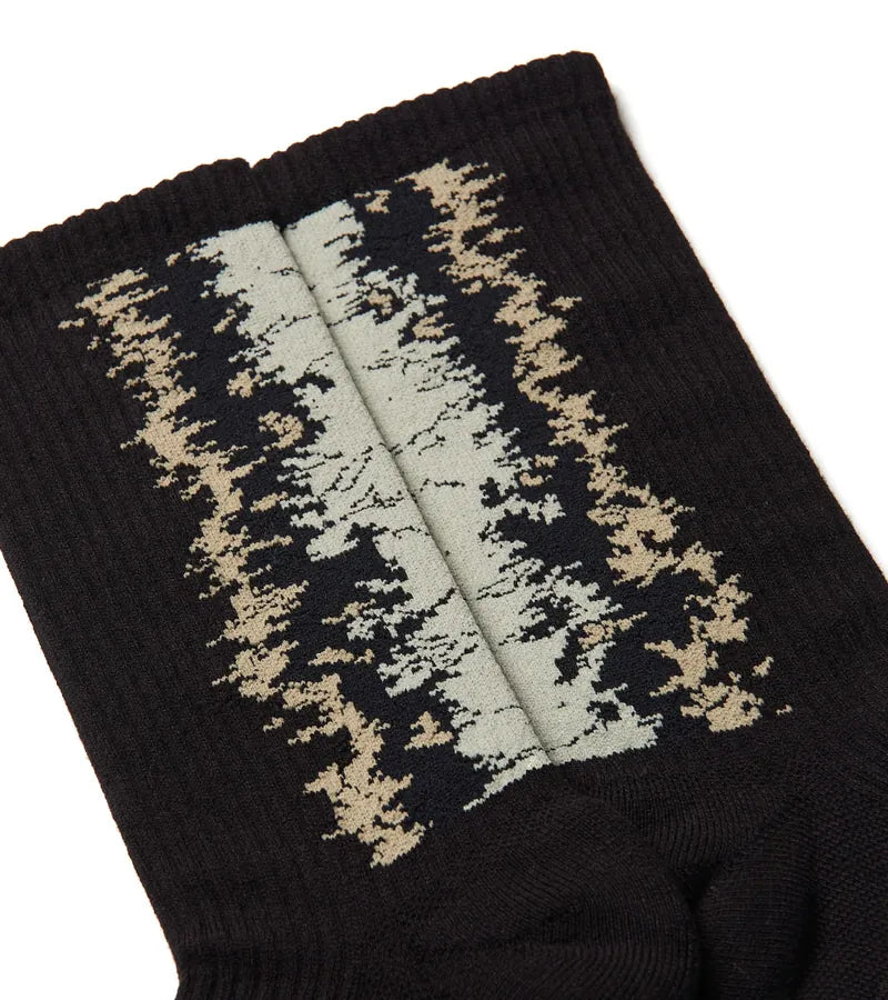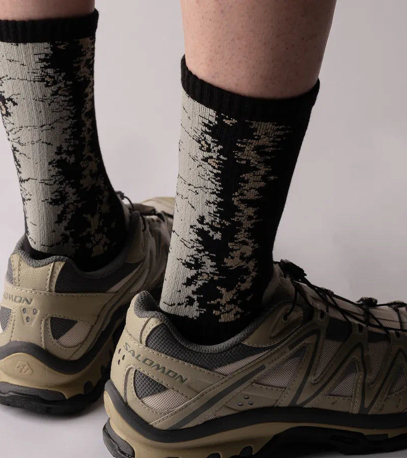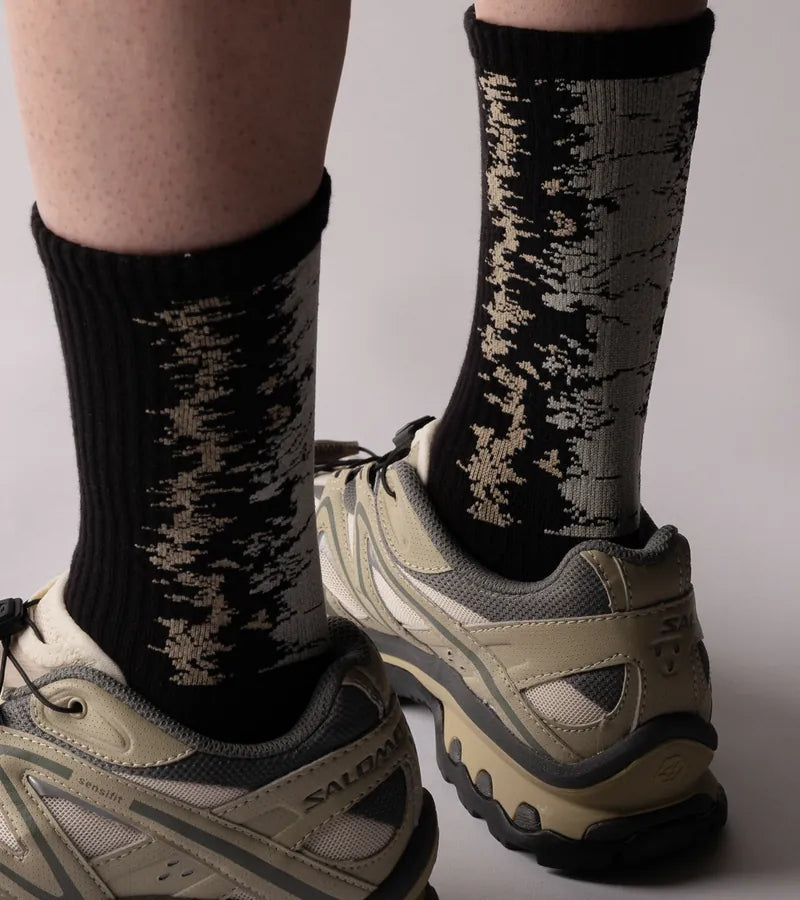 -The LANDING series continues the gradient design and introduces three different geographical images: wheat fields, coastlines, and sandbars. -These patterns blend together, intertwining colors, while hidden slogans are incorporated inside the sock cuff. The wearers, like the floating sand, flow with the air in environments of varying temperatures and diverse ecosystems, exploring every corner of the world.