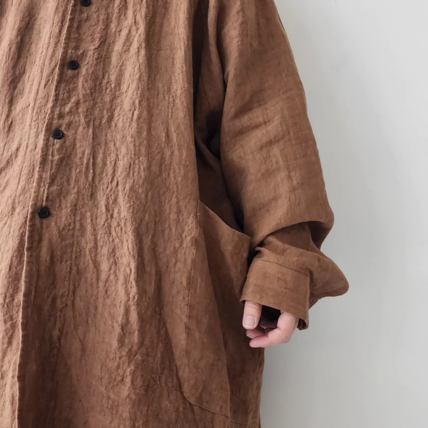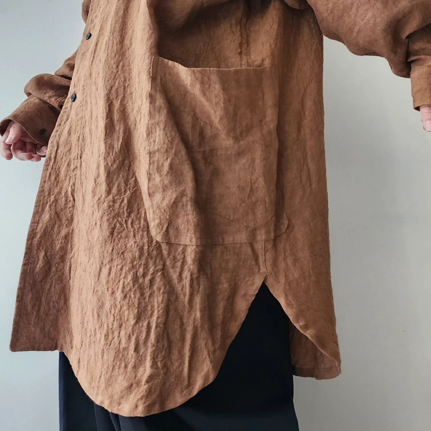-The reddish-brown color, which gives a sense of simplicity in the vividness characteristic of Sumi dye, gives the shirt a rough, Japanese look.
