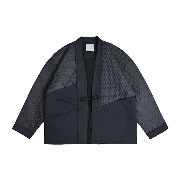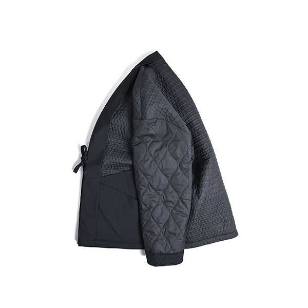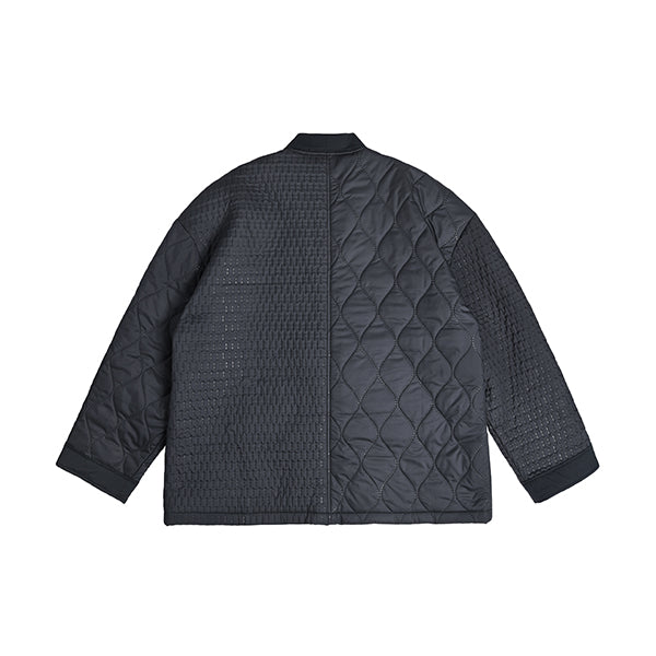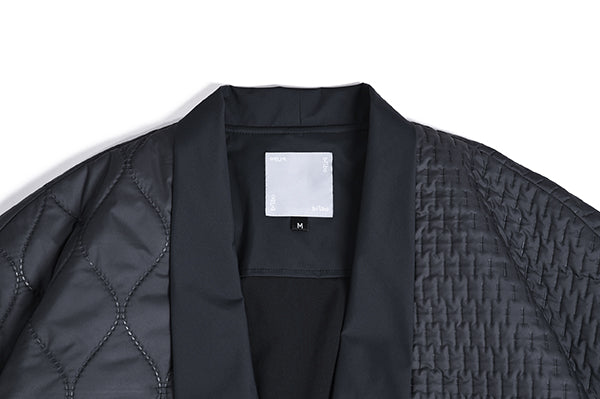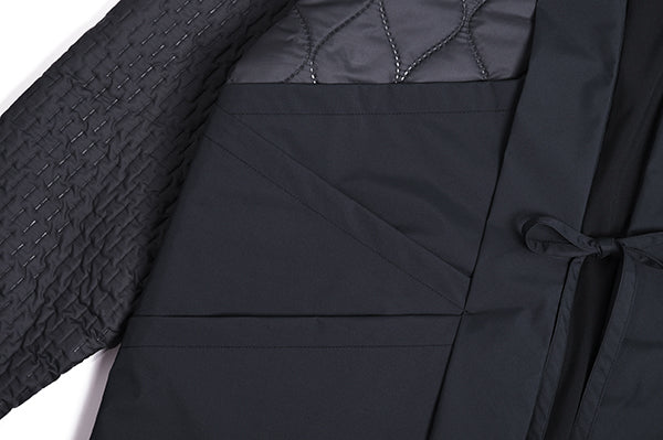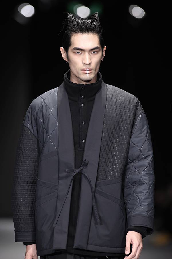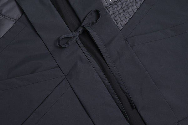 - 門襟、口袋及袖後飾片以風衣布料製作, 與衣身鋪棉的壓紋,呈現出材質對比。在整體的色調比例中,壓低了鋪棉所帶來的視覺膨脹感。