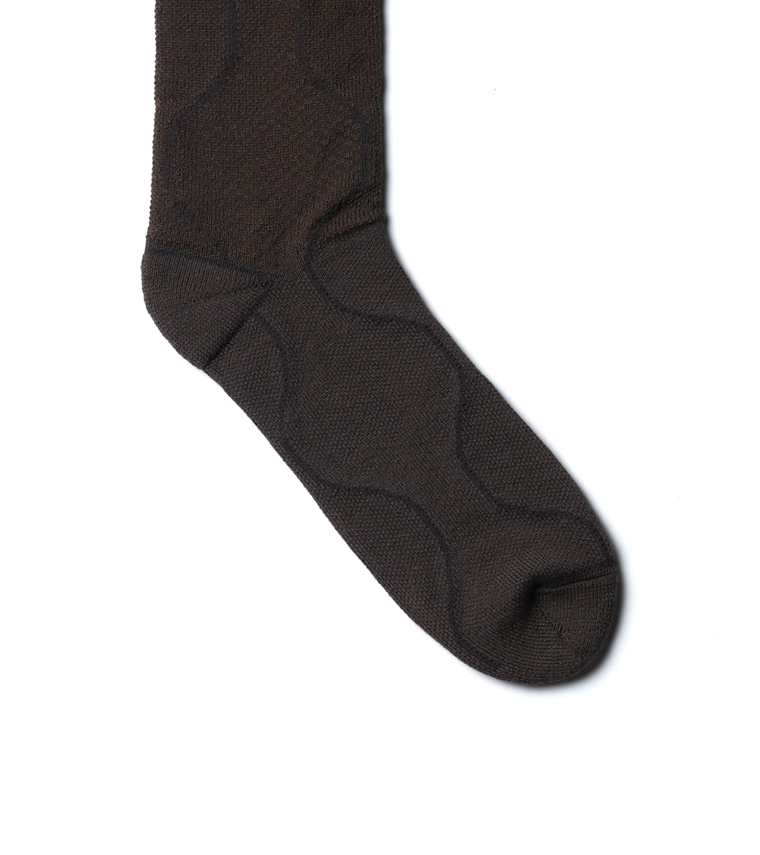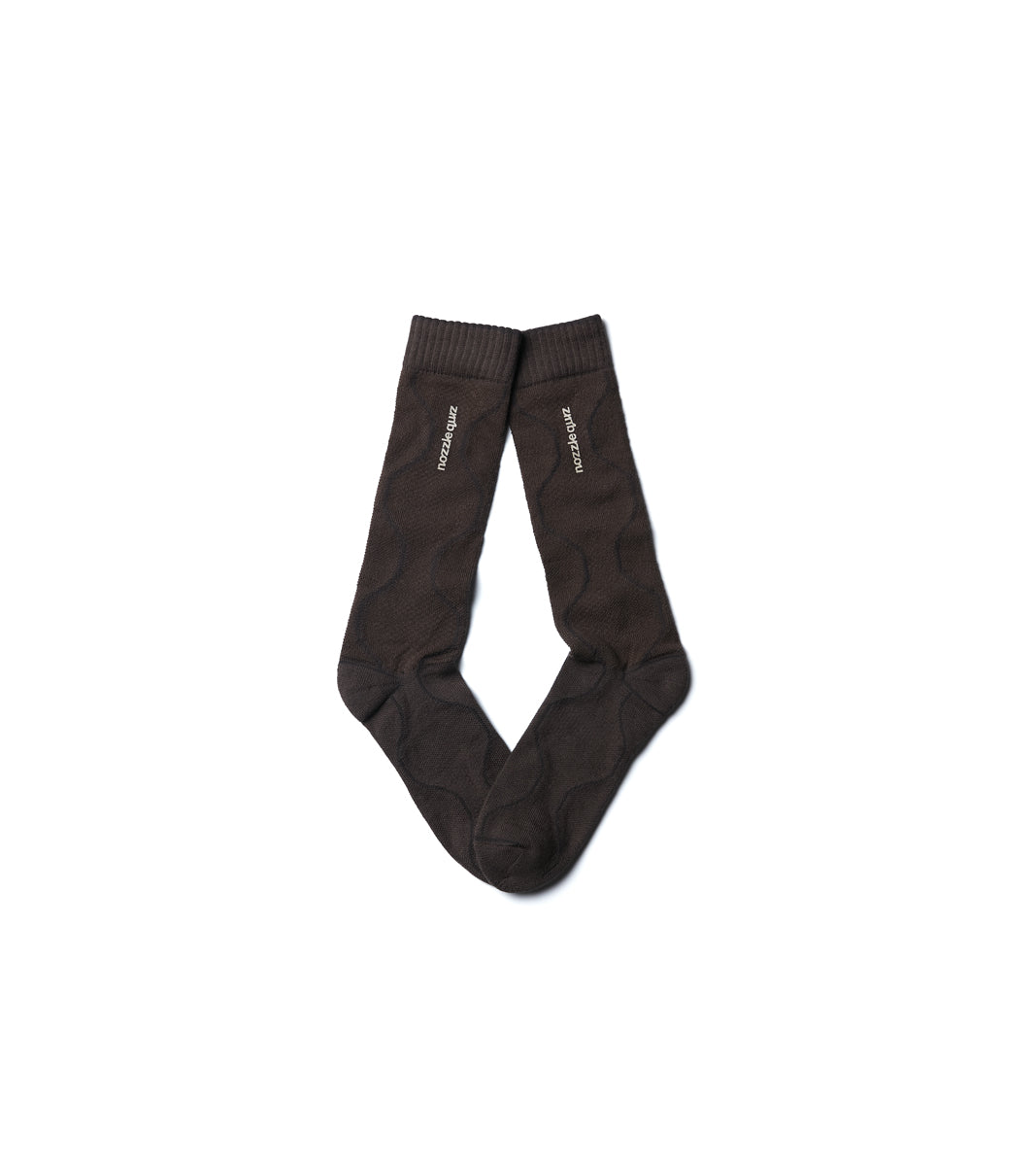 The third and final design of the Digit No. collection transforms the quilted layer of standard military winter jackets into patterns for the sock and uses thick yarn for a more rustic, unruly look that, when observed in detail, presents camouflage textures. The socks are available in three different colors that will blend perfectly into any fall/winter outfit. Inspired by the epic world in 1917, the Digit No. collection adopts elements from military uniforms to deliver three drastically different silhouettes.