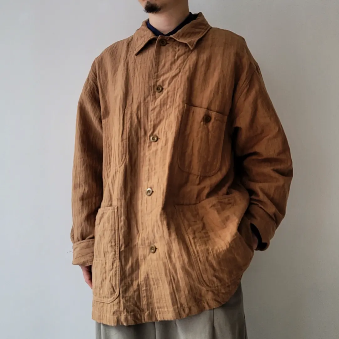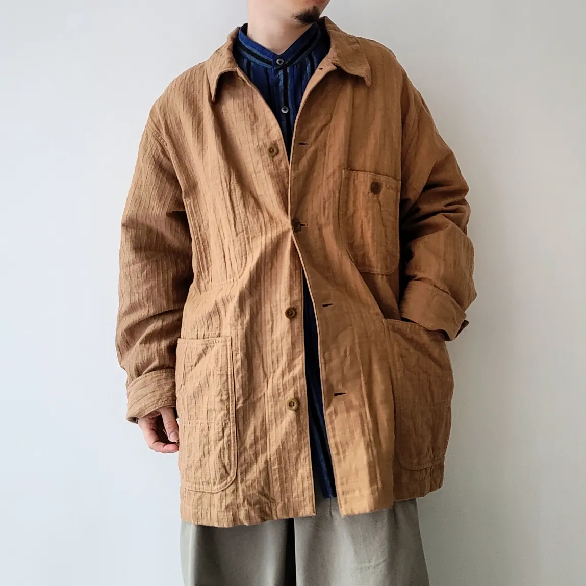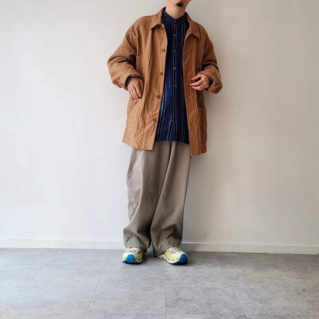 At first glance, it looks like a hard herringbone fabric like work wear, but it is finished in a supple fabric of cotton*linen