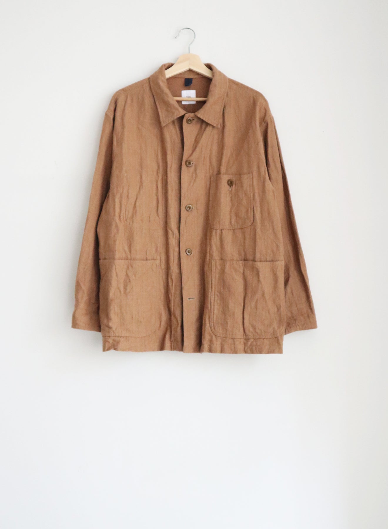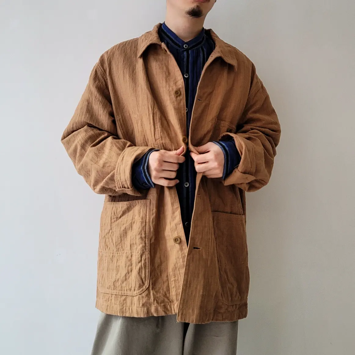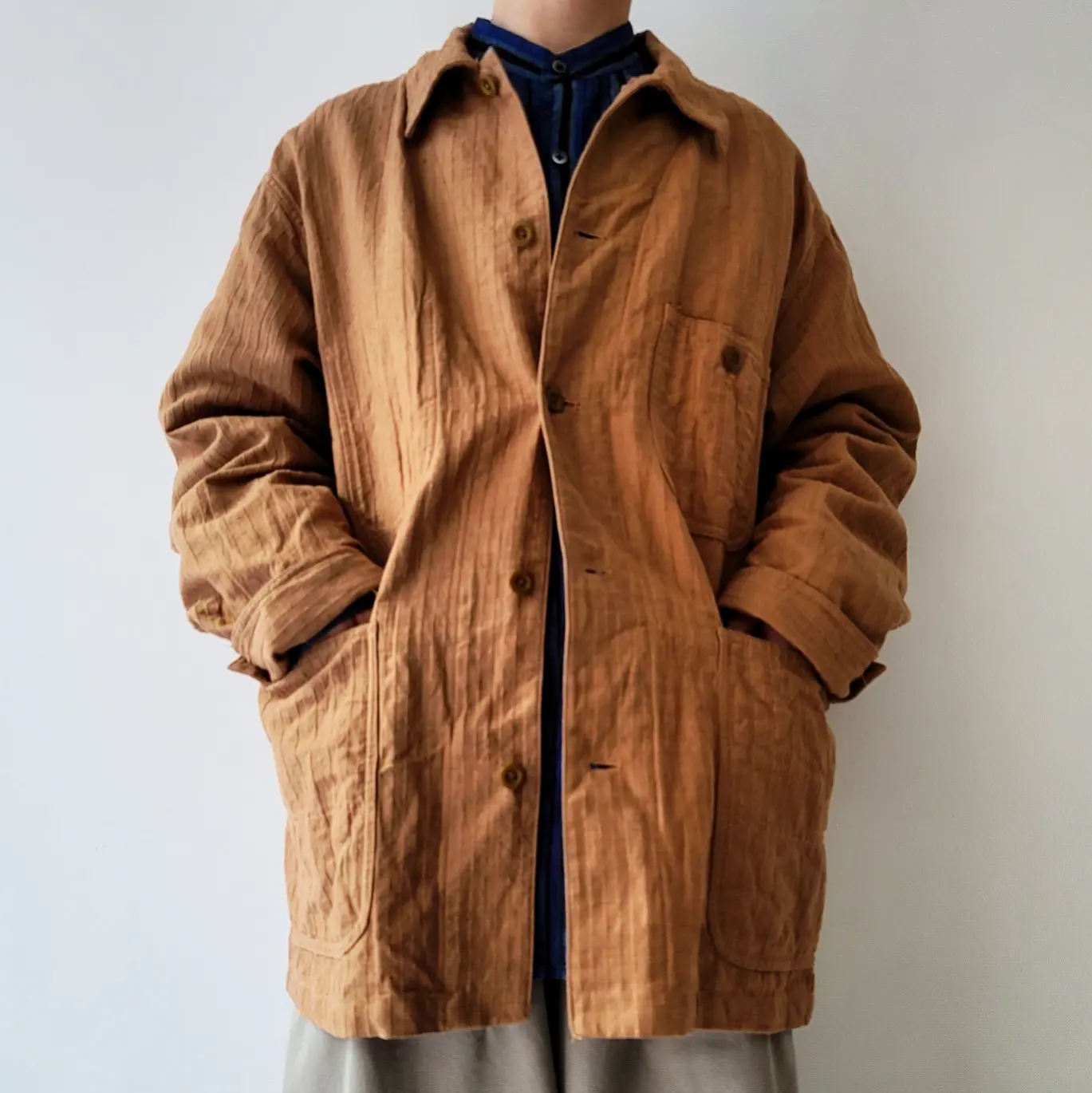 At first glance, it looks like a hard herringbone fabric like work wear, but it is finished in a supple fabric of cotton*linen