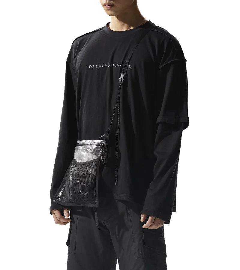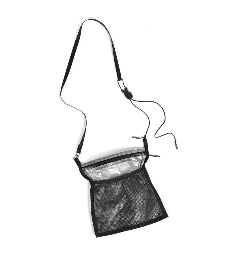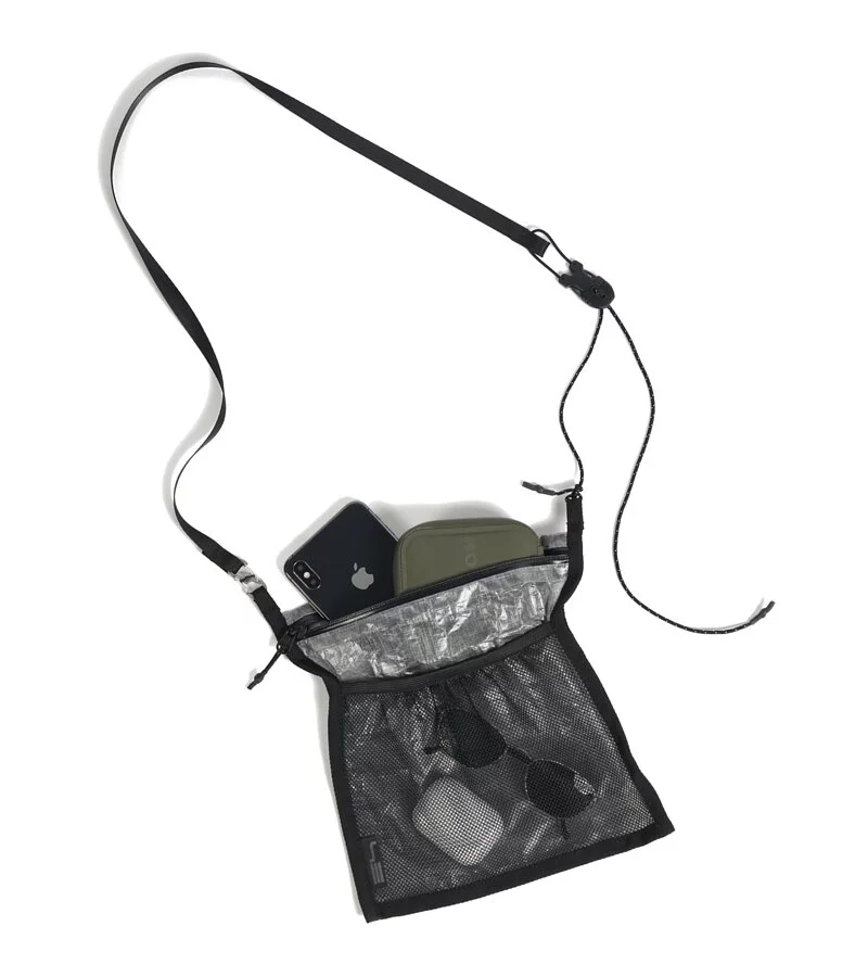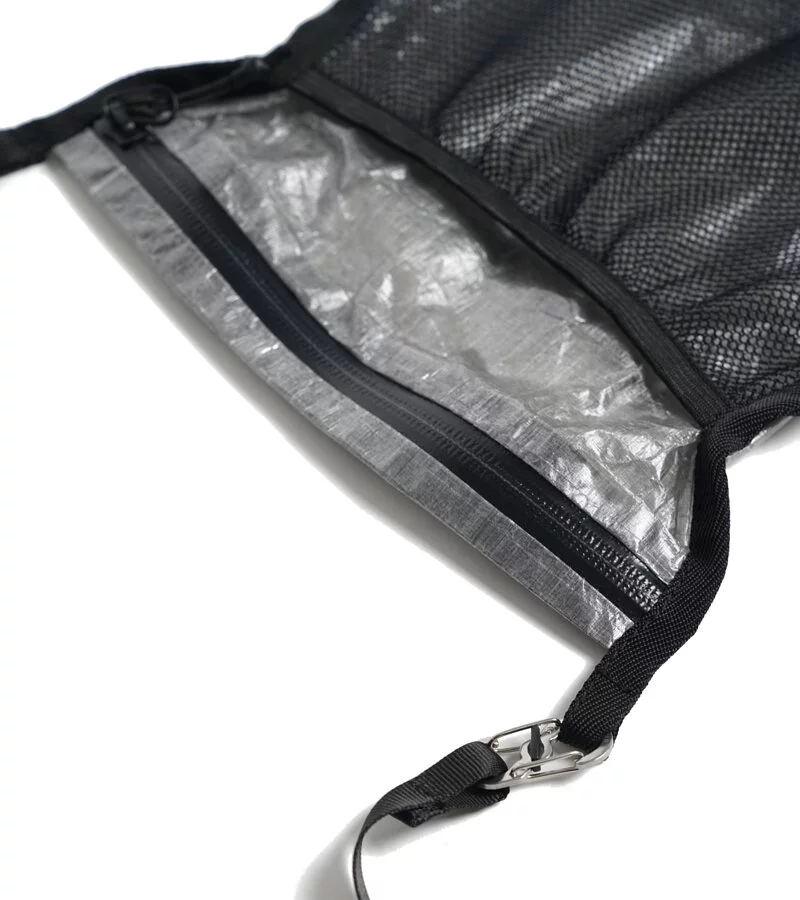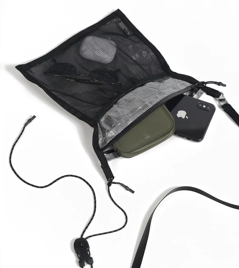 SA|SACOCHE BAG DYNEEMA 是一款輕便外出的包款,面料使用超輕量Dyneema 複合纖維面料,含一個前開拉鍊袋與前網袋,網袋也可以用來攜帶水壺及輕便小物。