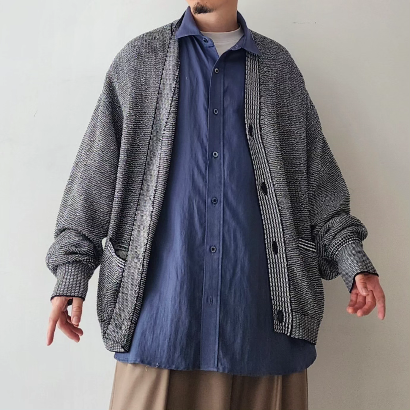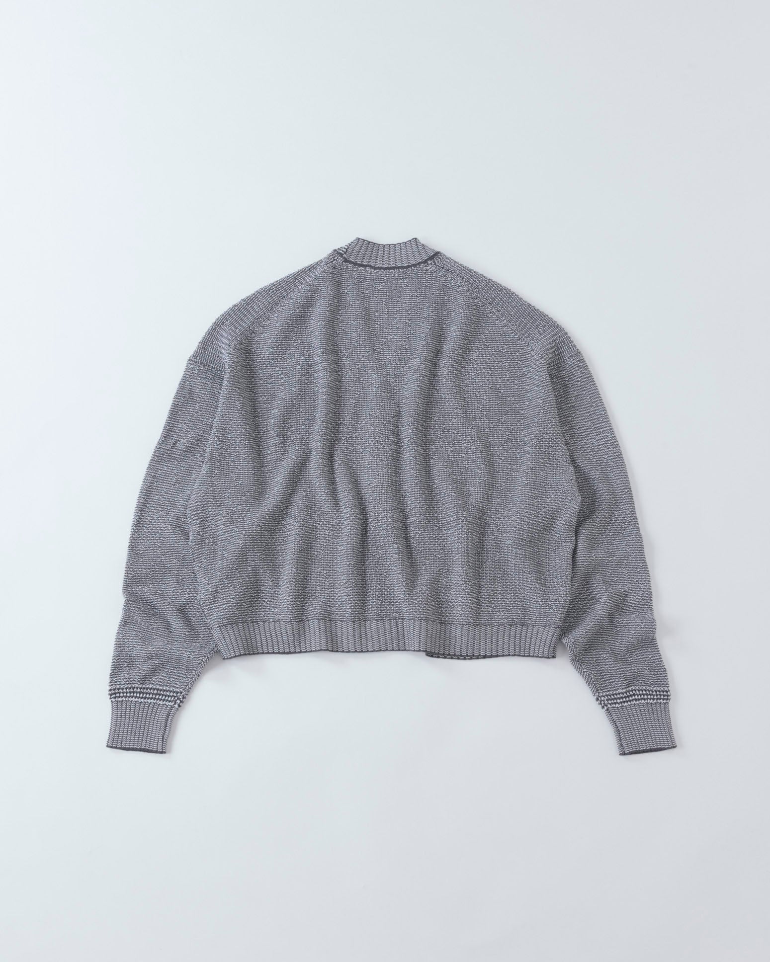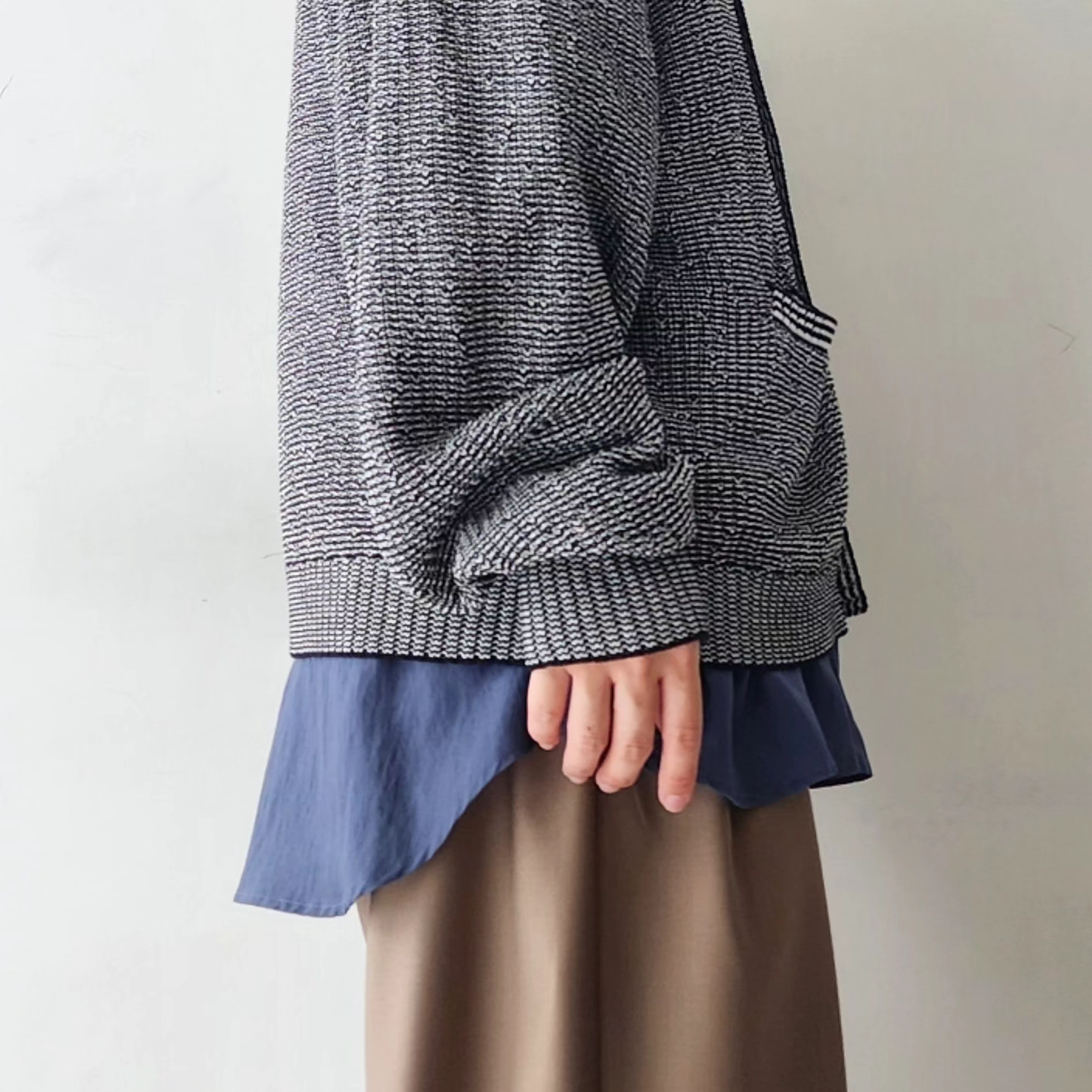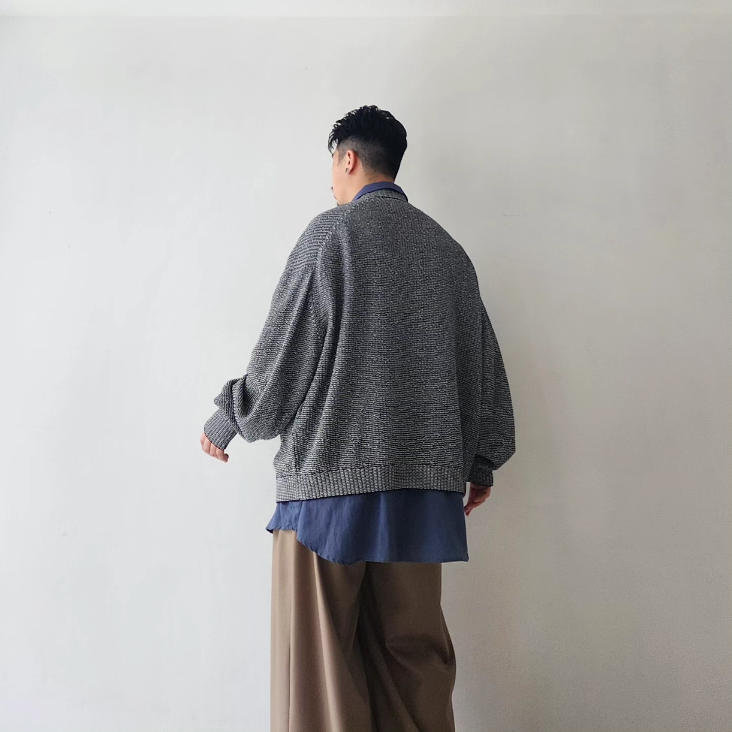 -It will be an item knitted with a 7-gauge deformed Lynx structure. Two types of Japanese paper are used for the material, and threads with different color differences and quality are used to express a deep color and texture. In addition, the links pattern has been modified to create a sheer knitting structure (pattern) that is extremely light and comfortable to wear. The placket rib part is also designed with a border pattern at an irregular pitch and finished with very elaborate specifications. The silhouette with the shoulders removed and the bottom of the kettle lowered to create a loose silhouette,