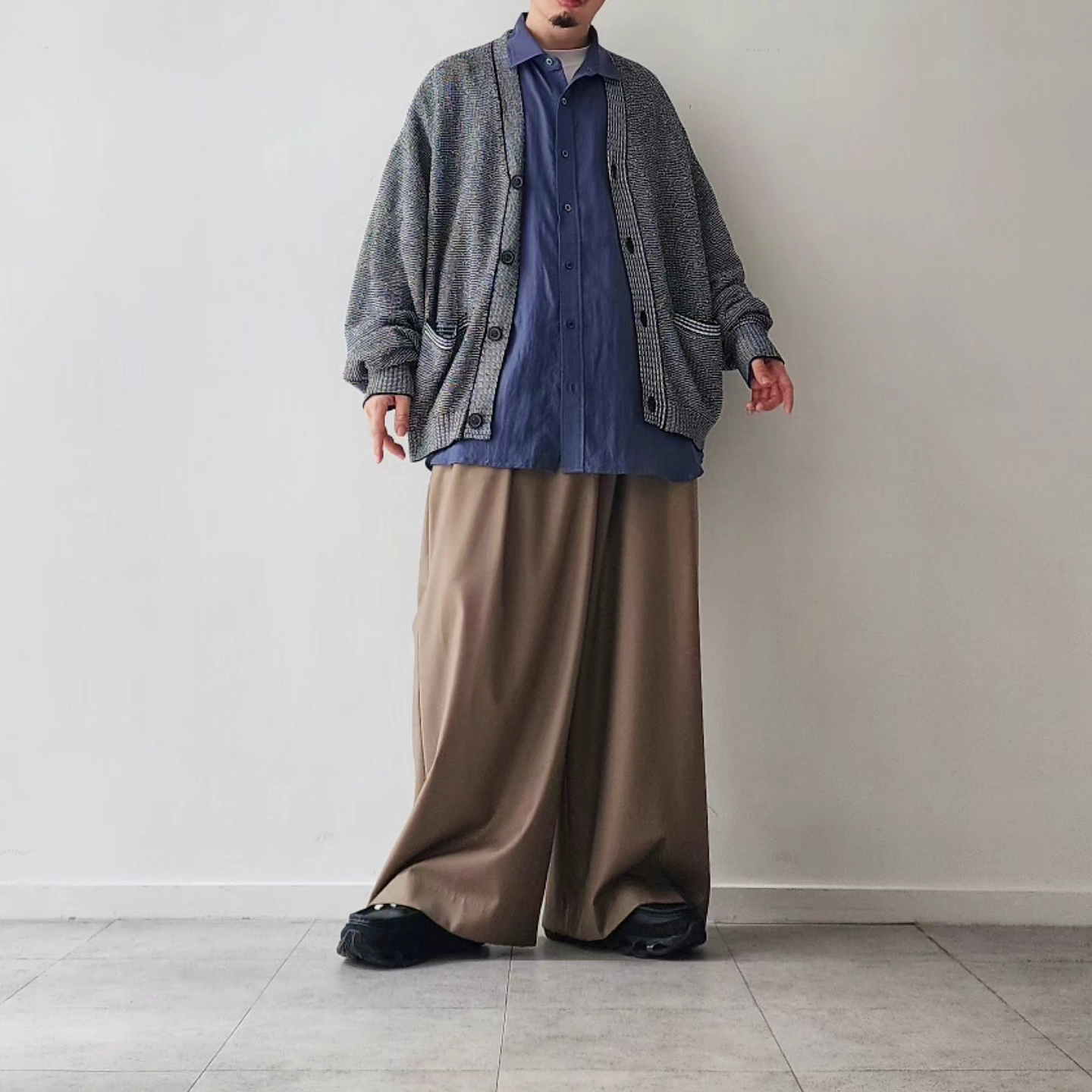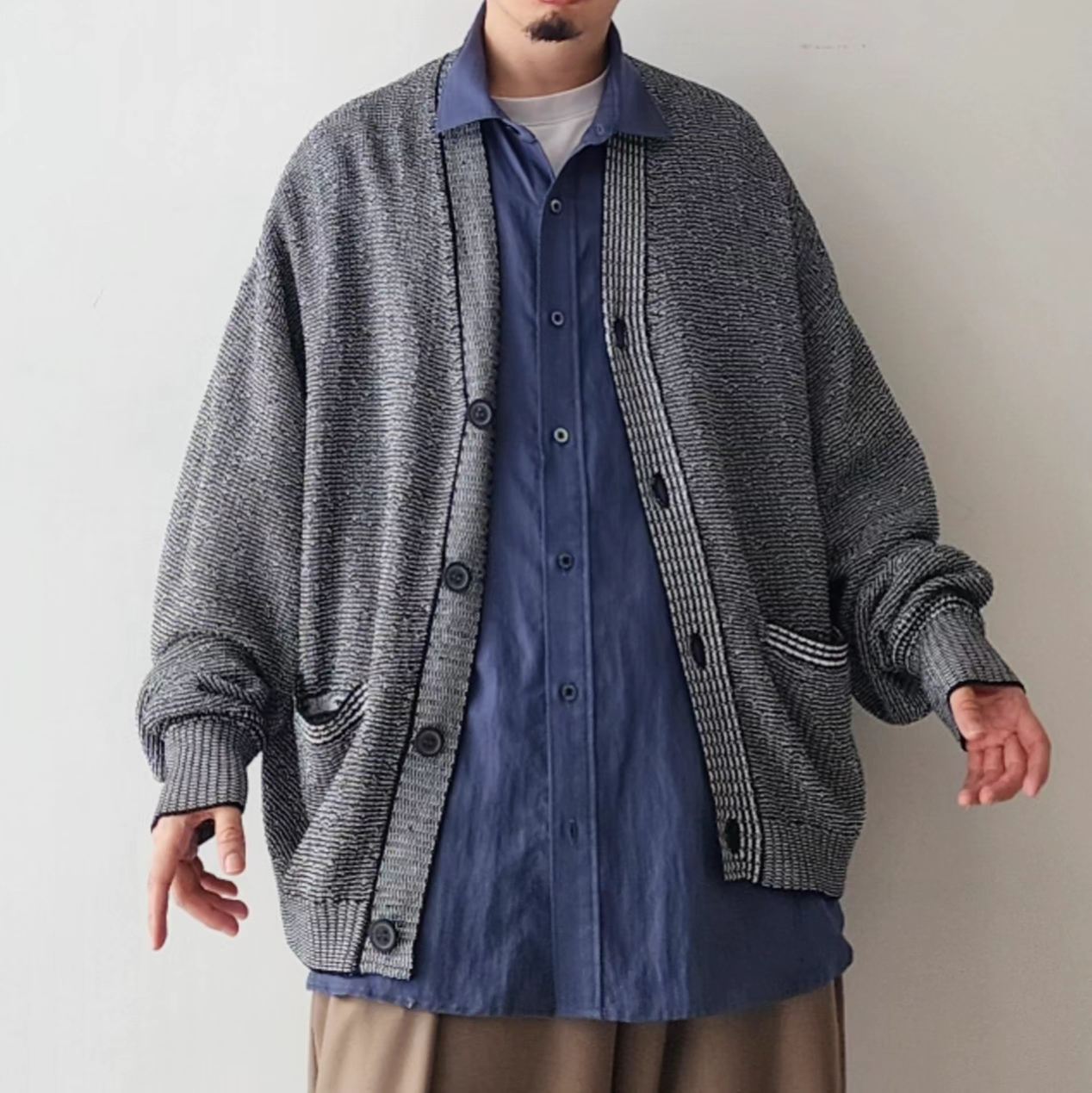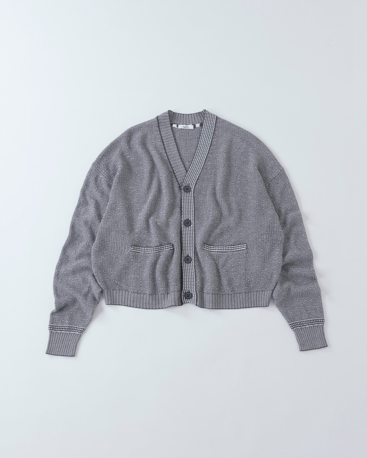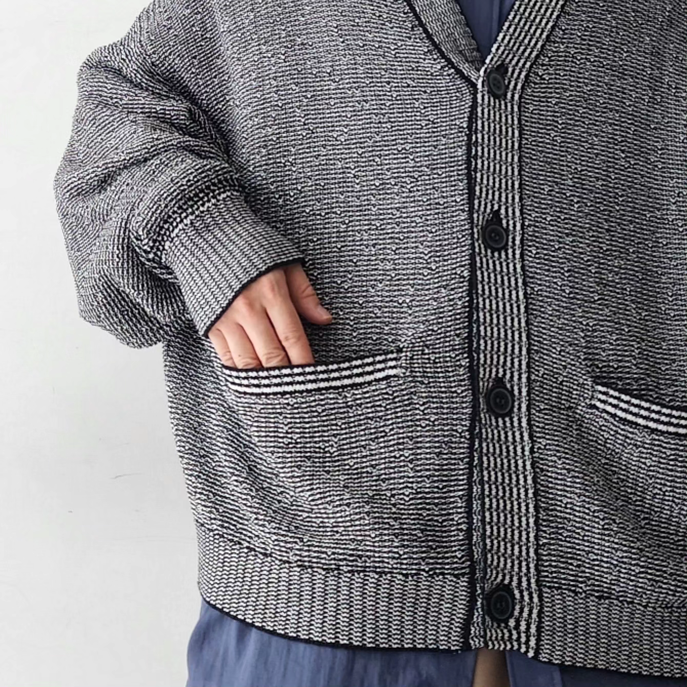 -It will be an item knitted with a 7-gauge deformed Lynx structure. Two types of Japanese paper are used for the material, and threads with different color differences and quality are used to express a deep color and texture. In addition, the links pattern has been modified to create a sheer knitting structure (pattern) that is extremely light and comfortable to wear. The placket rib part is also designed with a border pattern at an irregular pitch and finished with very elaborate specifications. The silhouette with the shoulders removed and the bottom of the kettle lowered to create a loose silhouette,