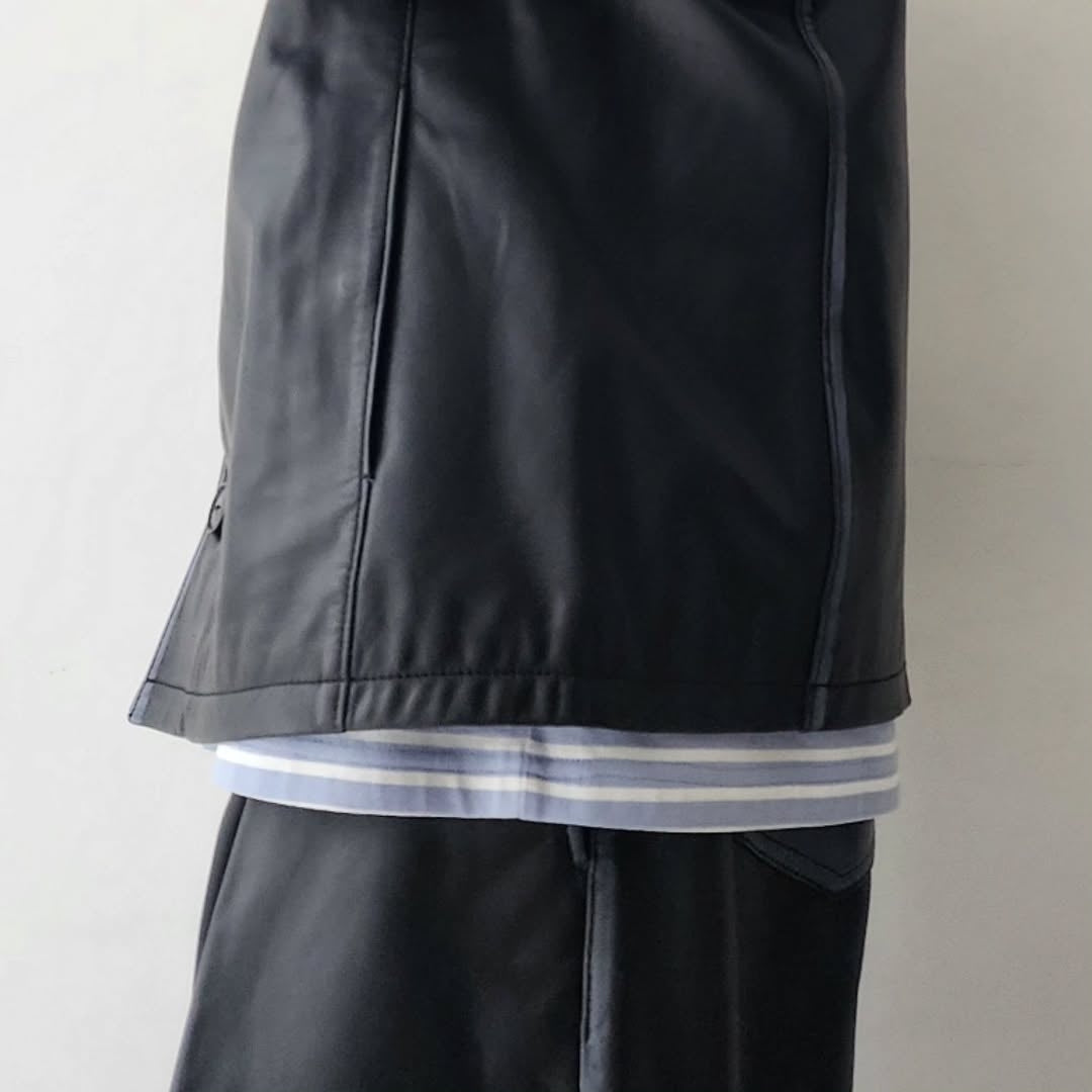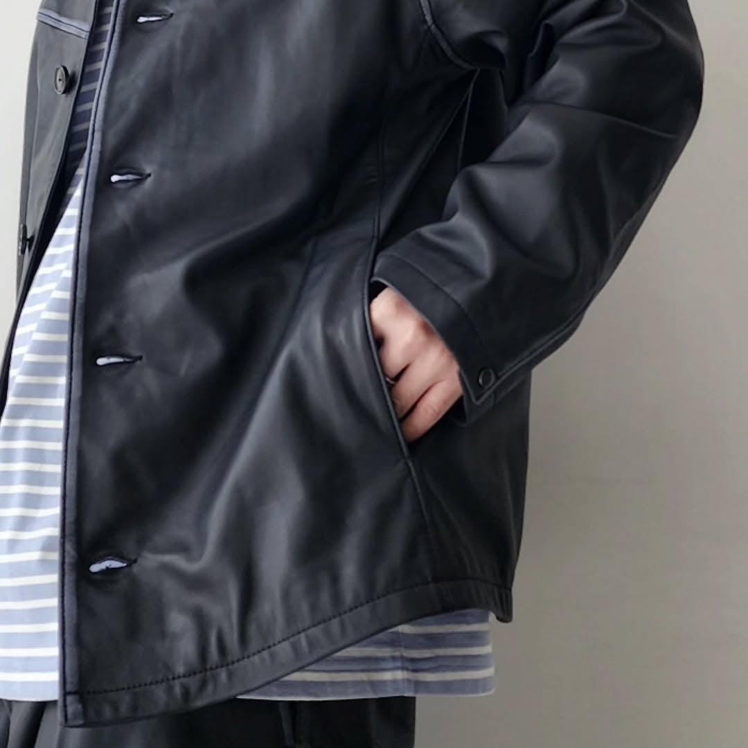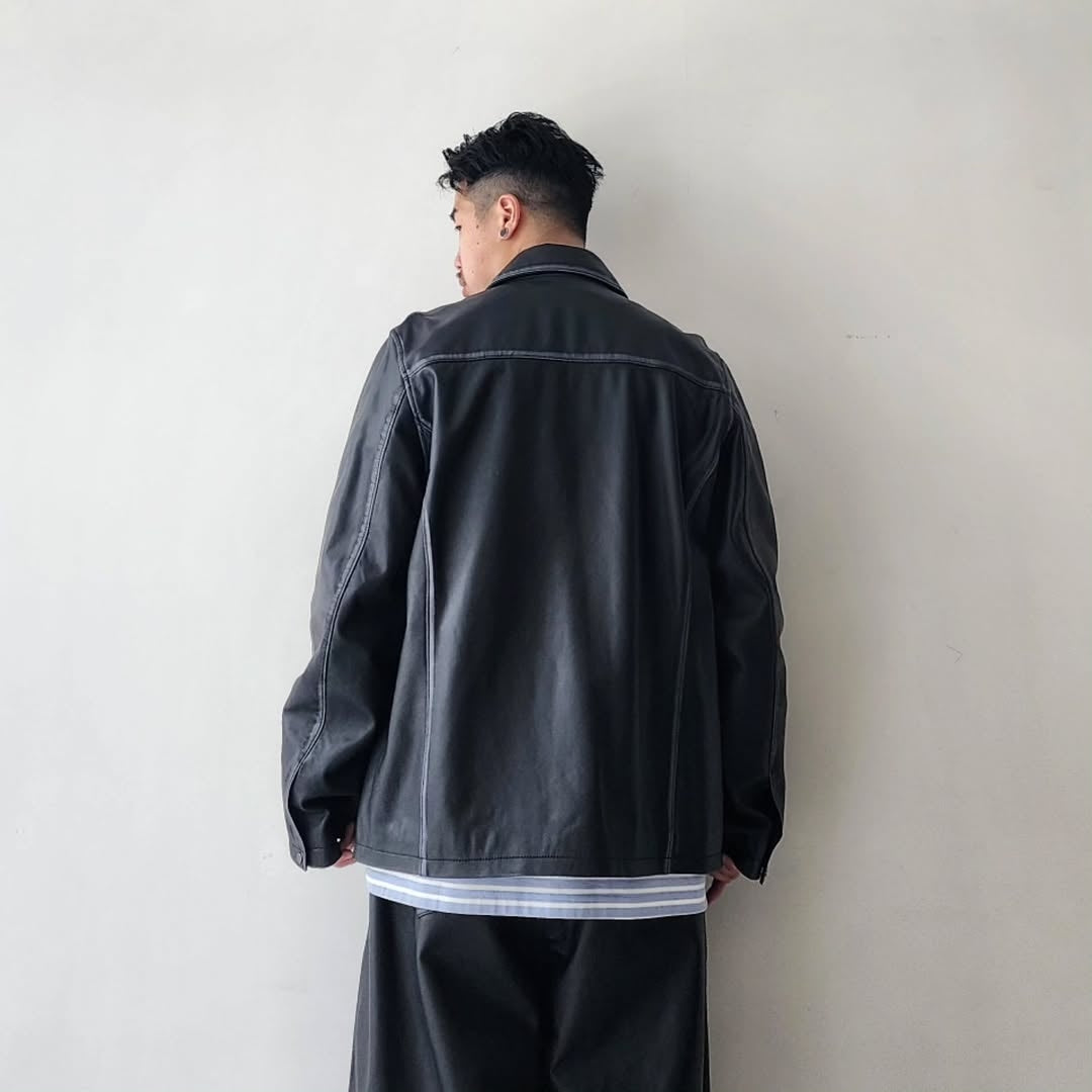 This is a new shirt jacket made of Indian lamb leather. The thickness of the leather is reduced to the limit (approximately 0.5 mm thick) and the material is adjusted to a texture that is easy to wear. The leather with brown and gray cores is dyed uniquely and used for the items, and the color of the core is partially removed by hand by craftsmen one by one.