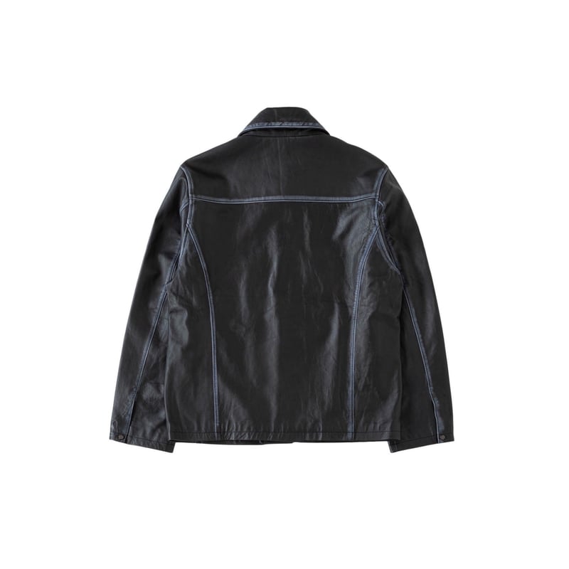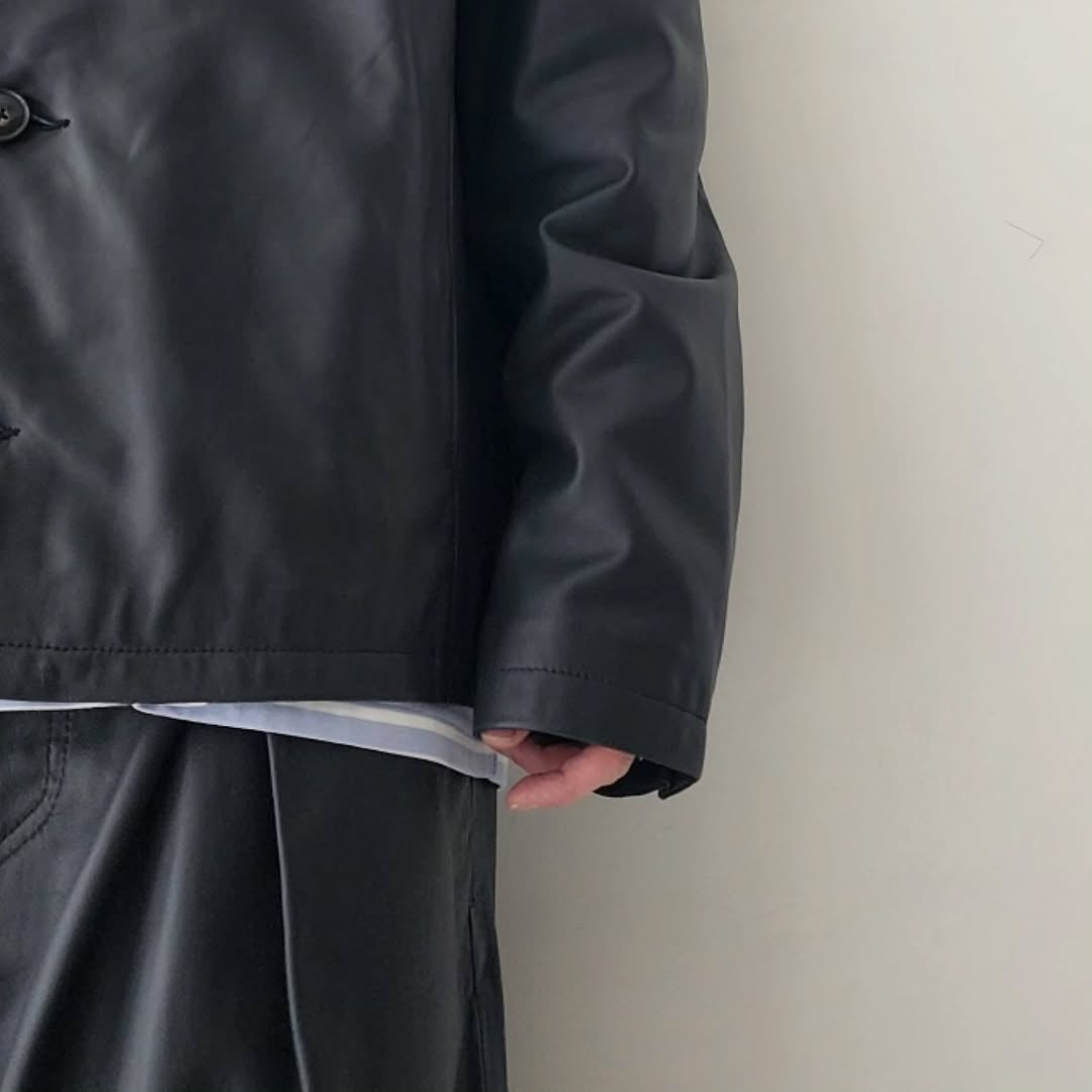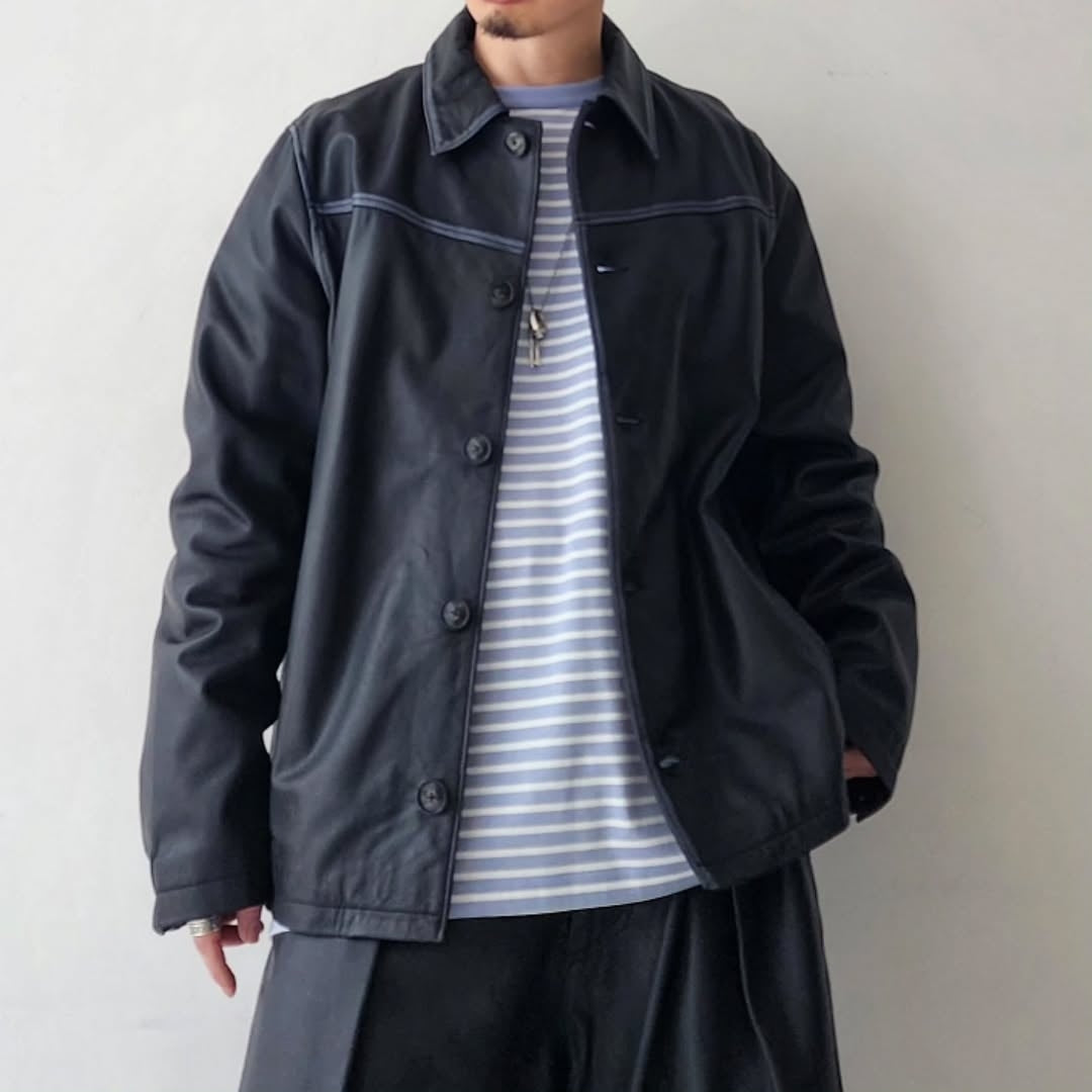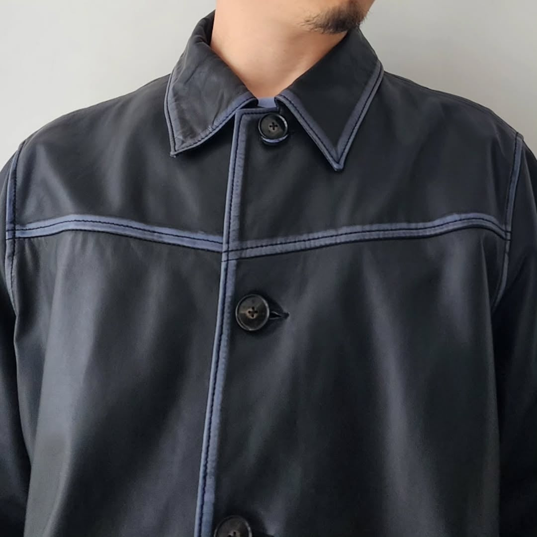 This is a new shirt jacket made of Indian lamb leather. The thickness of the leather is reduced to the limit (approximately 0.5 mm thick) and the material is adjusted to a texture that is easy to wear. The leather with brown and gray cores is dyed uniquely and used for the items, and the color of the core is partially removed by hand by craftsmen one by one.