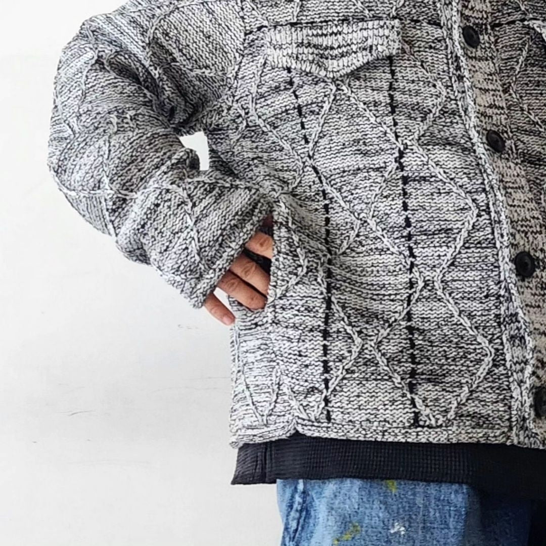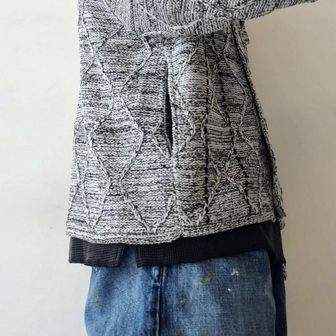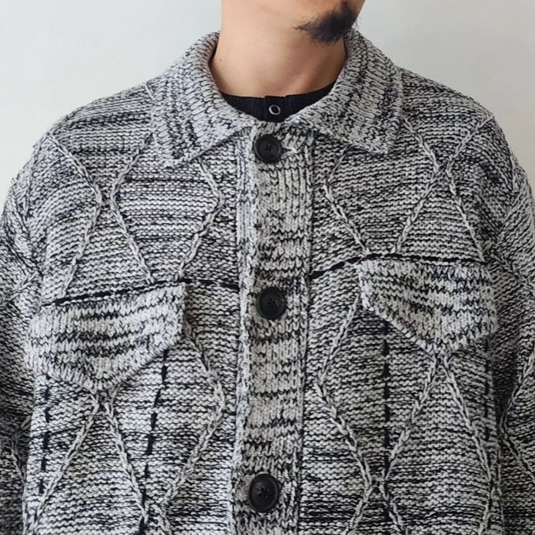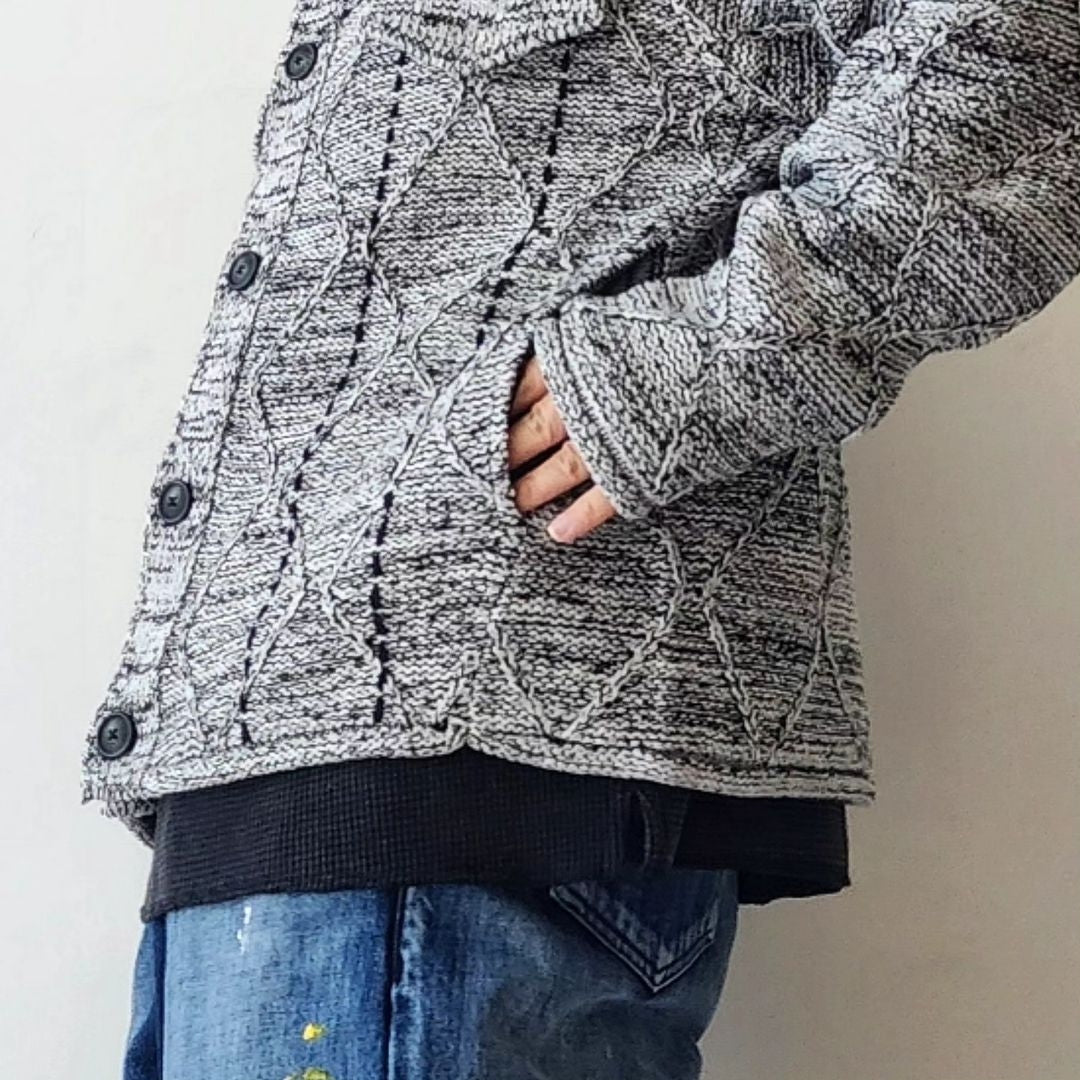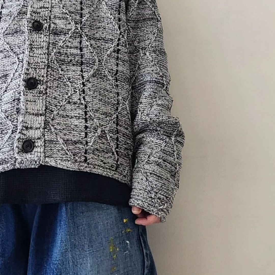 -We have created a knitted item based on the G BLOUSON model that is occasionally released. The item is based on a cable pattern and knitted on a 3-gauge knitting machine, using three different types of yarn: washi paper, slub yarn, and ring yarn.