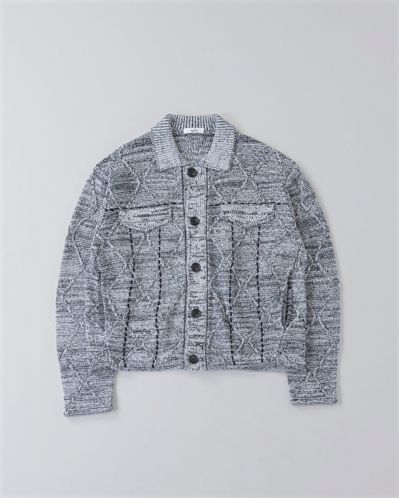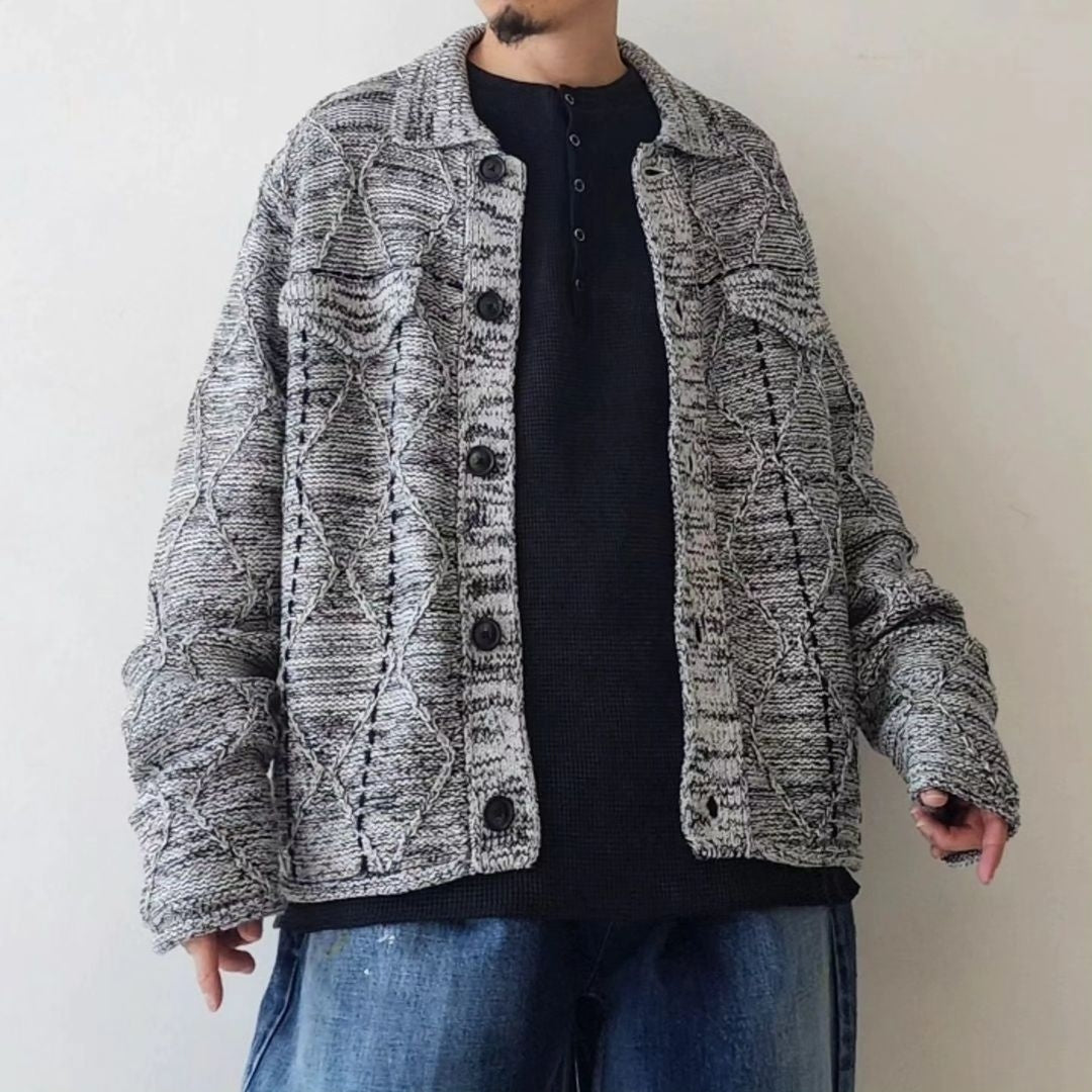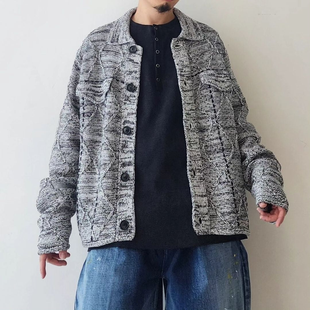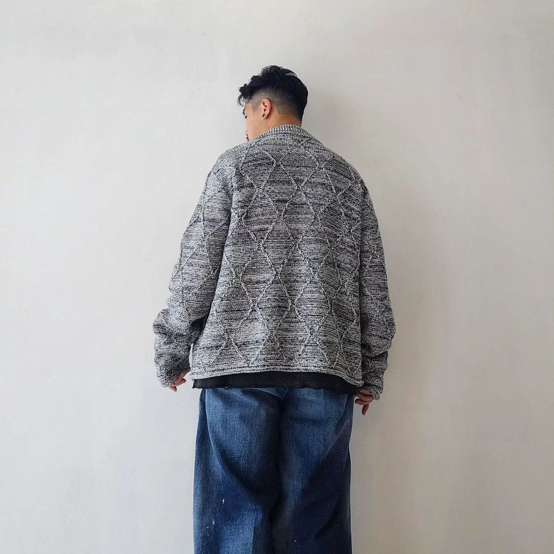 -We have created a knitted item based on the G BLOUSON model that is occasionally released. The item is based on a cable pattern and knitted on a 3-gauge knitting machine, using three different types of yarn: washi paper, slub yarn, and ring yarn.