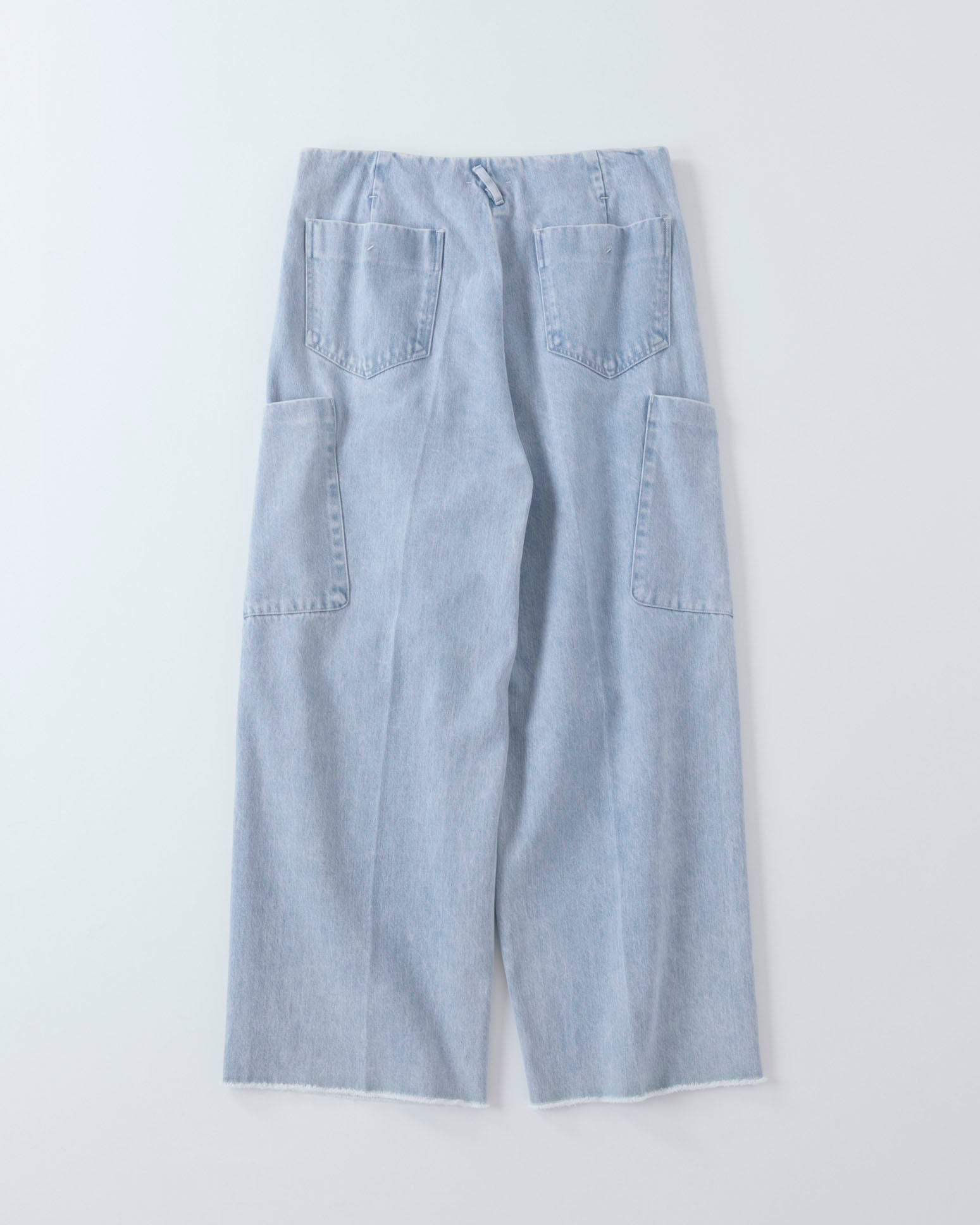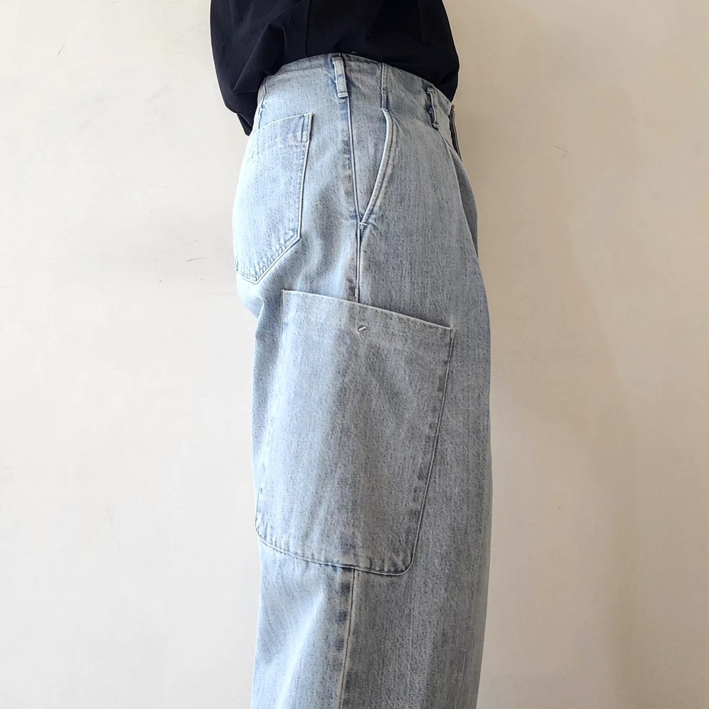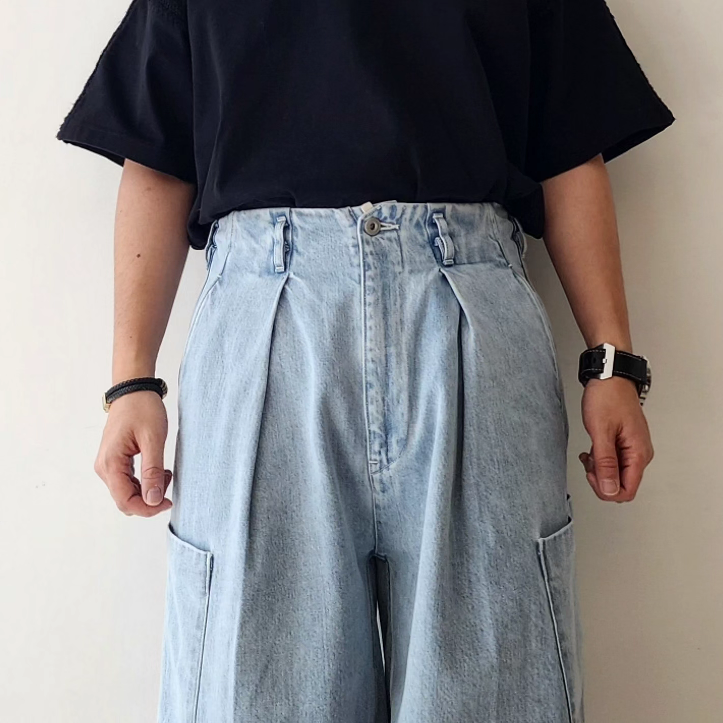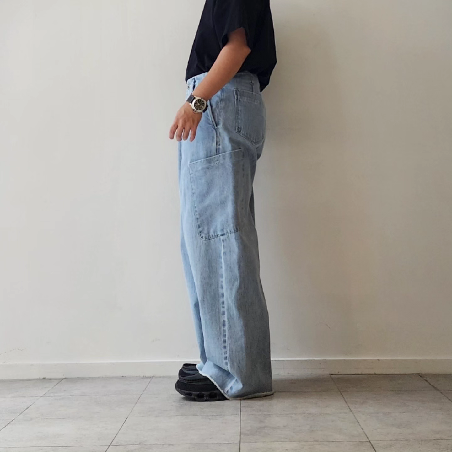 -Based on the standard model tuck buggy, the side patch PKT has been placed and dropped into a cargo style. The fabric uses 11 ounces of uneven yarn denim and has been processed with a chemical wash. Unlike common chemical washes, we created a unique recipe with craftsmen to soften and fade. Please enjoy the soft and greatly faded texture, not the finely processed feeling.