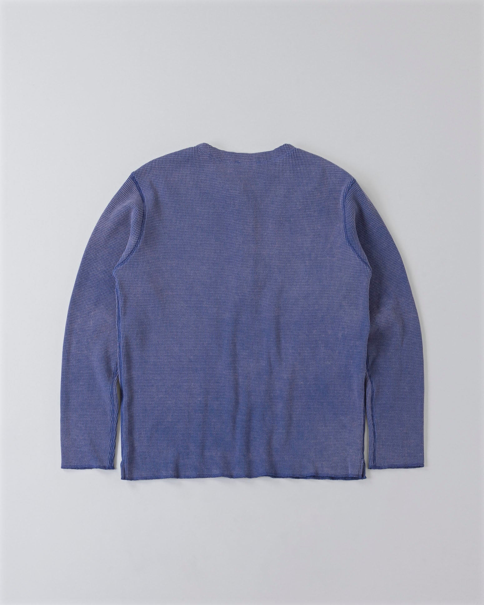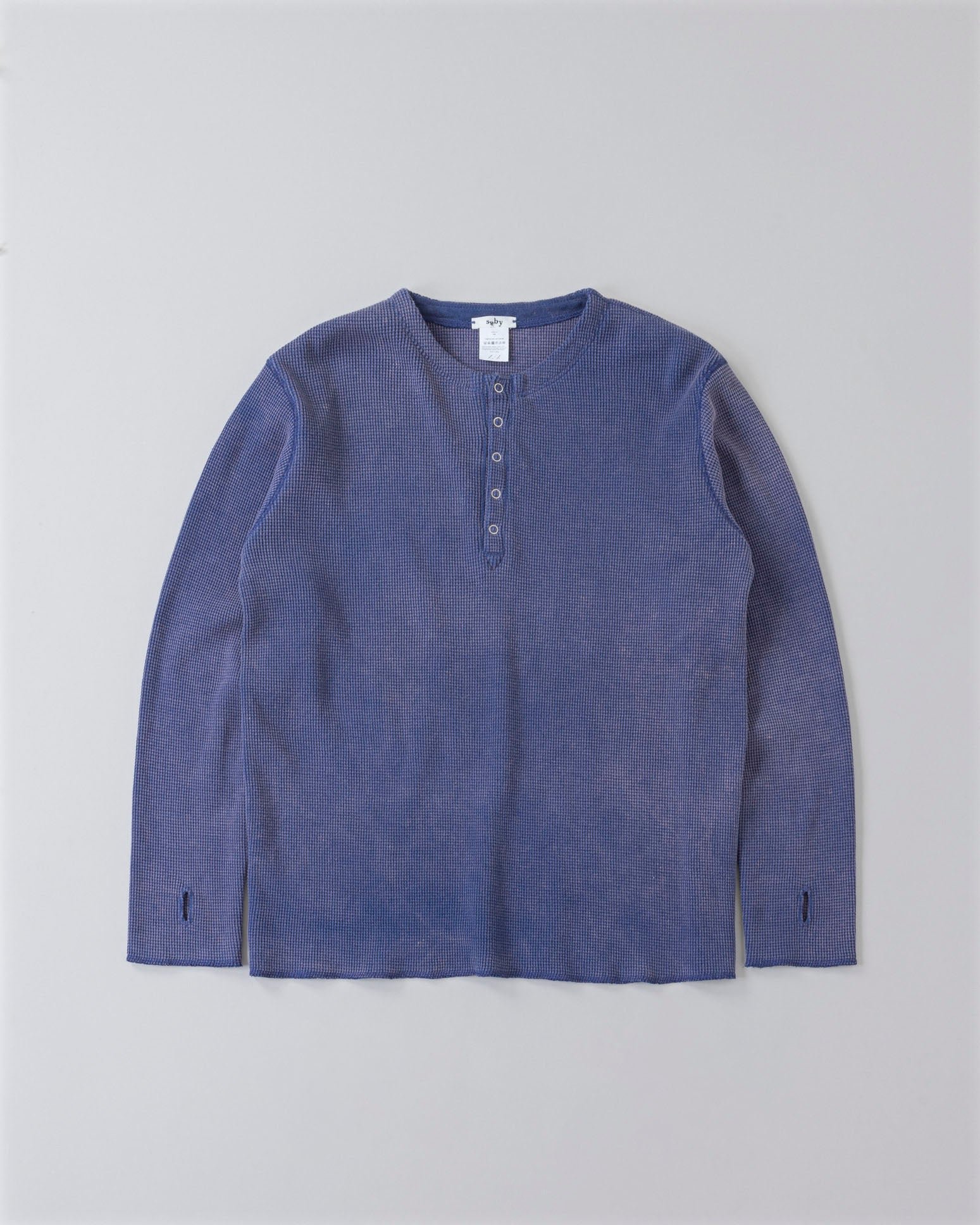 -A henley neck cut and sew made of big waffle fabric. Made of 100% cotton big waffle fabric with large bumps. The fabric is pigment dyed and then stone bio applied to create a strong fade. The collar has a boat neck style with no seams. The slightly deep placket is fastened with snap buttons. The slightly long sleeves have thumb holes in comparison to the slightly sleek width. This is a very versatile item that can be worn on its own or as an inner layer.