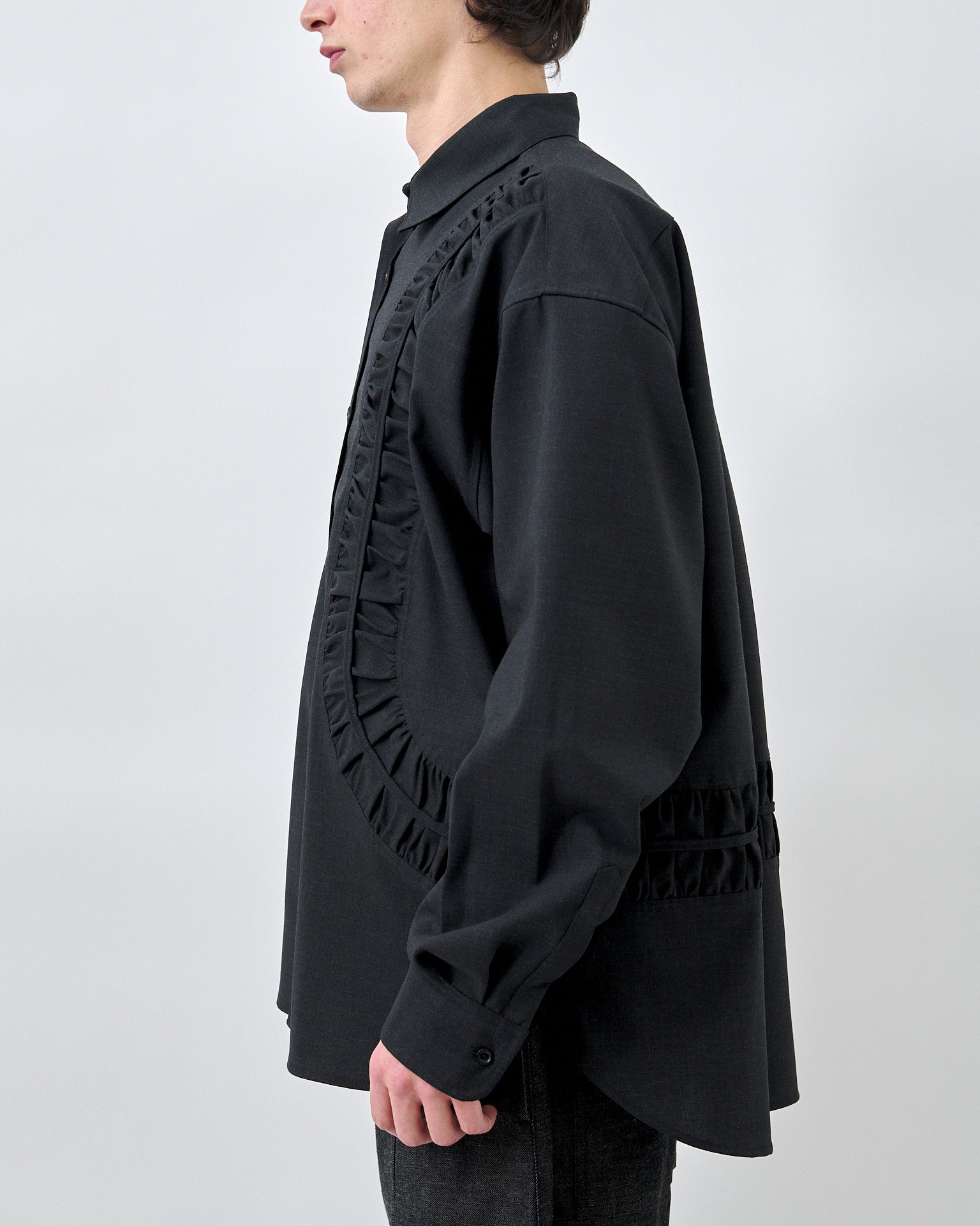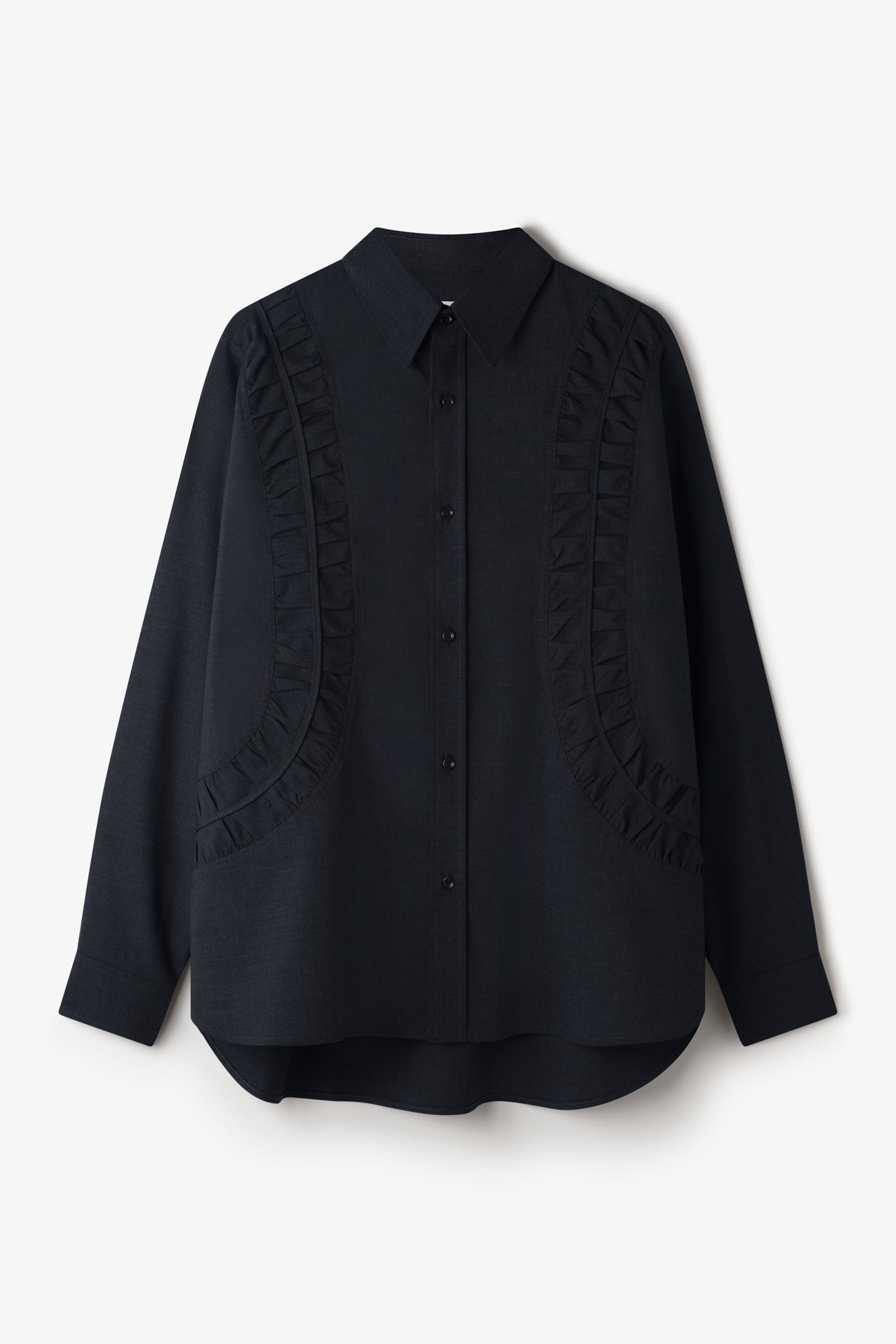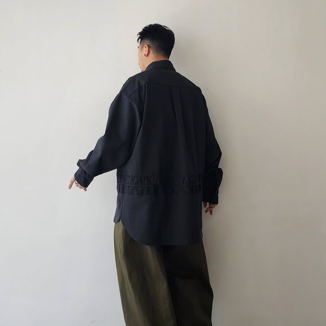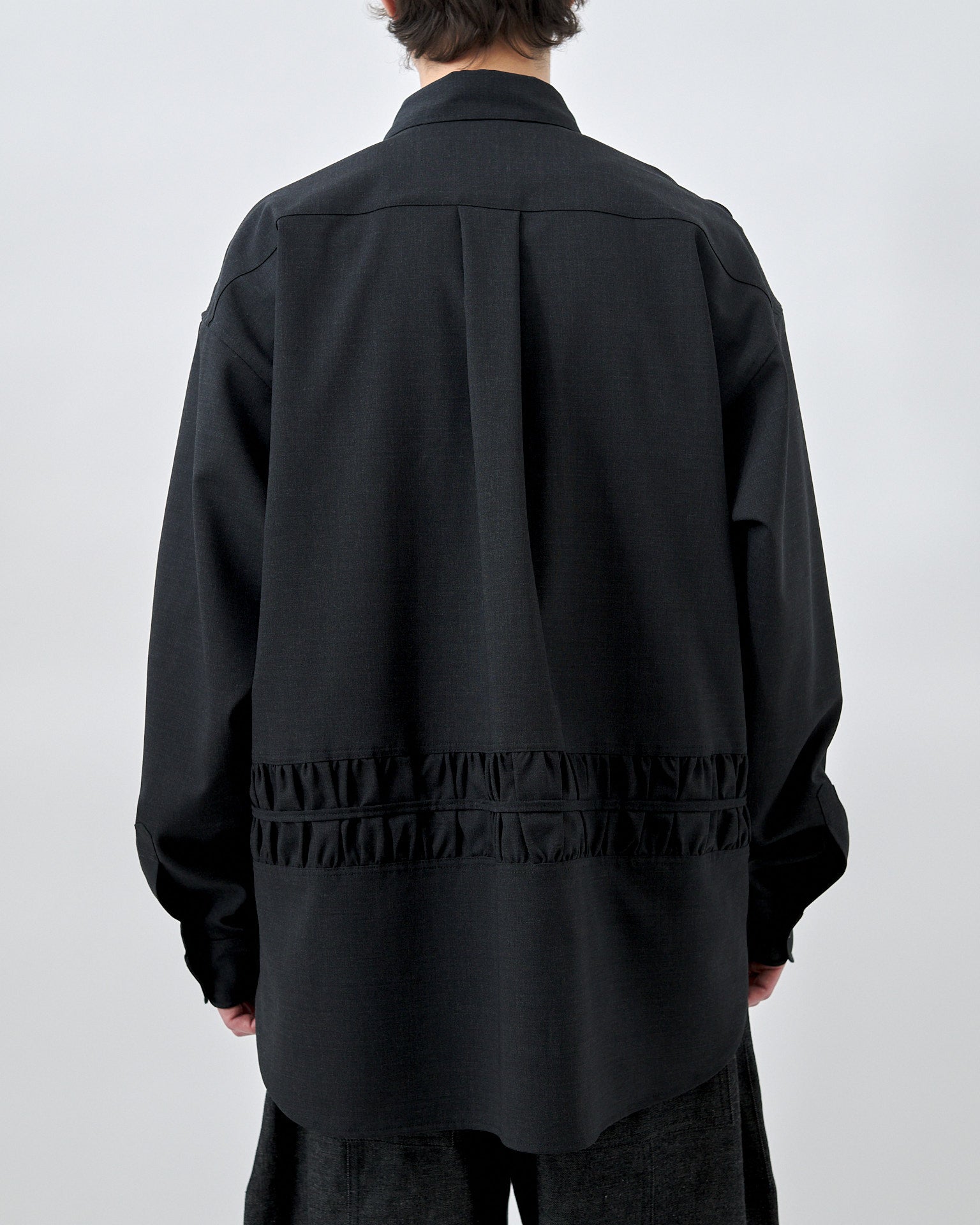 The Fossil Shirt is an oversized sartorial piece, crafted from a tropical wool blend and defined by its distinctive ruched panel detailing.