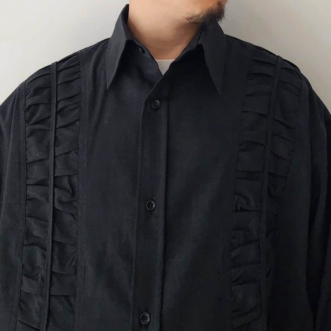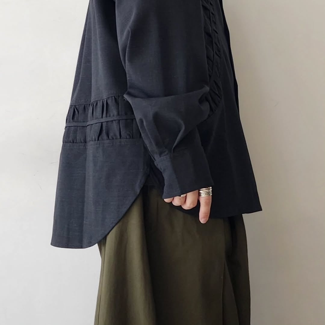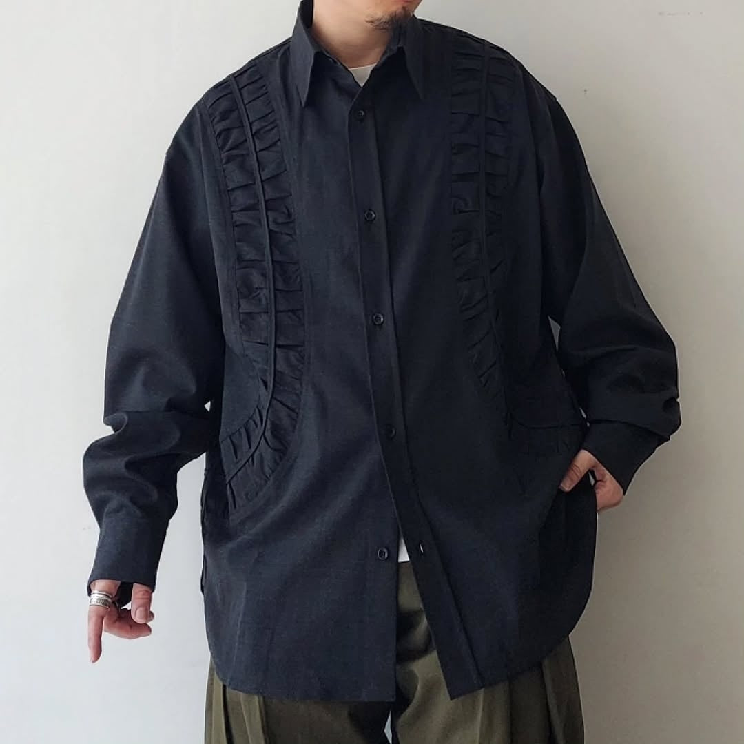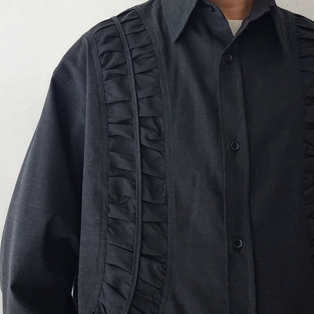 The Fossil Shirt is an oversized sartorial piece, crafted from a tropical wool blend and defined by its distinctive ruched panel detailing.