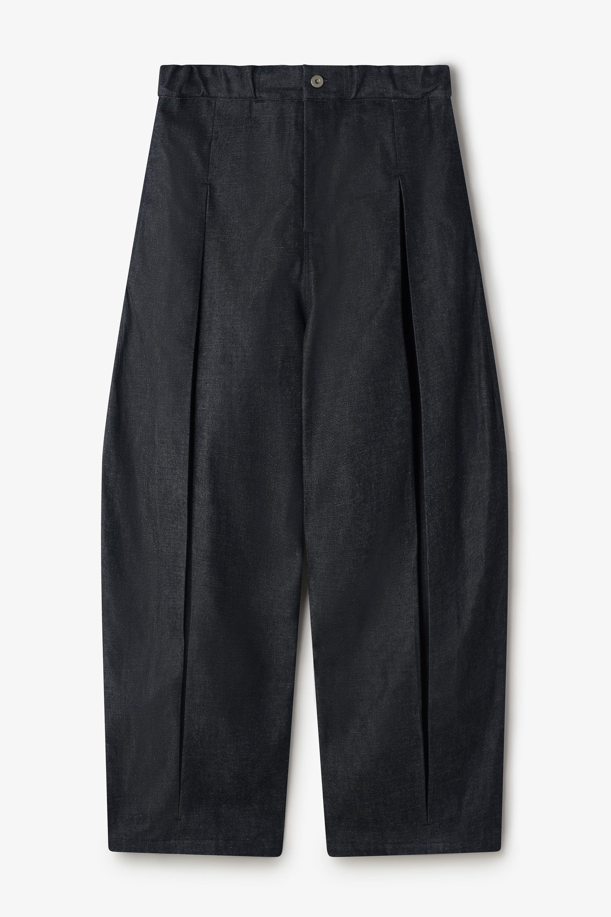 -A wide silhouette denim trouser with a three-dimensional effect created by pleats on the front.