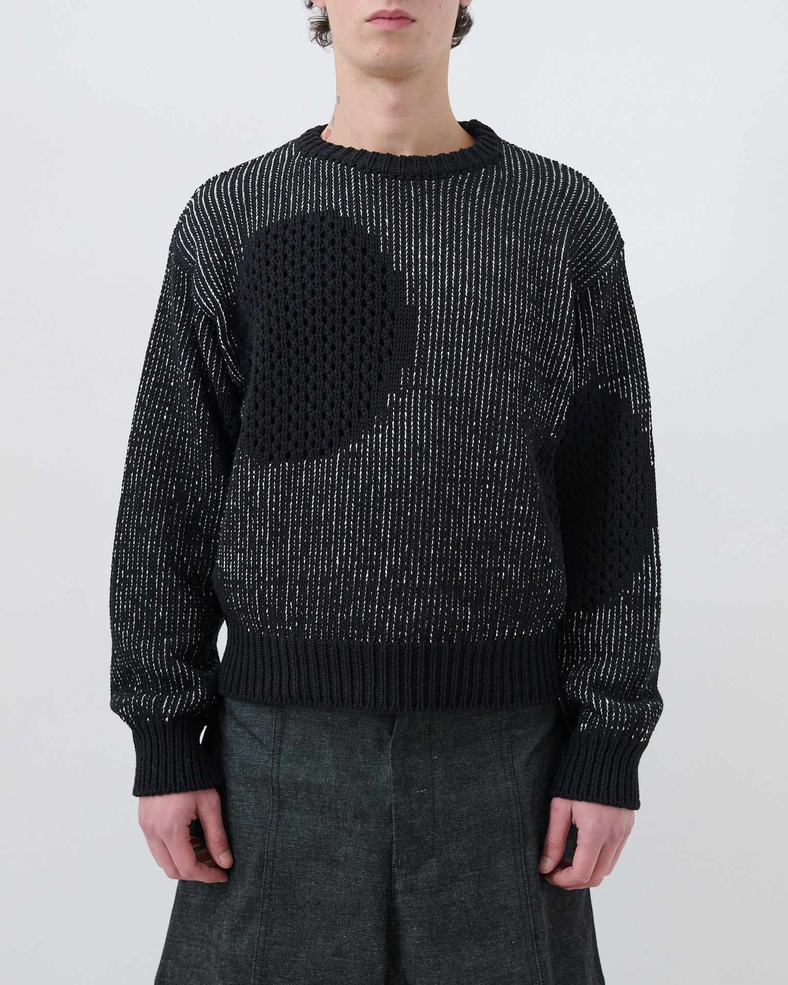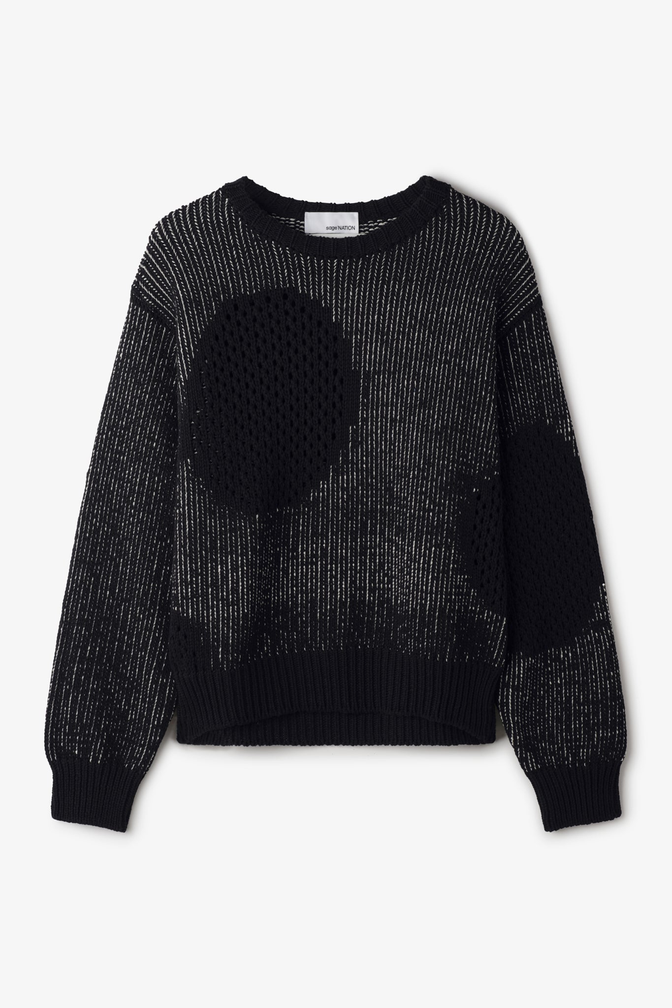 Crewneck knitted jumper in a cropped, boxy silhouette with circular open weave knitted placements across the jumper.