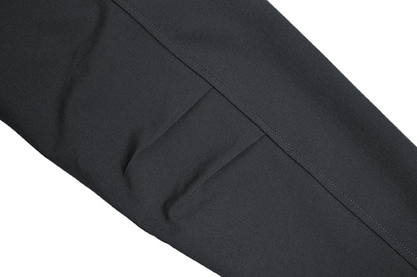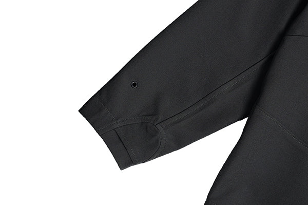 - 袖子於肘處抓出活動折以利活動, 且袖口配置拇指套環便於縱向伸展。