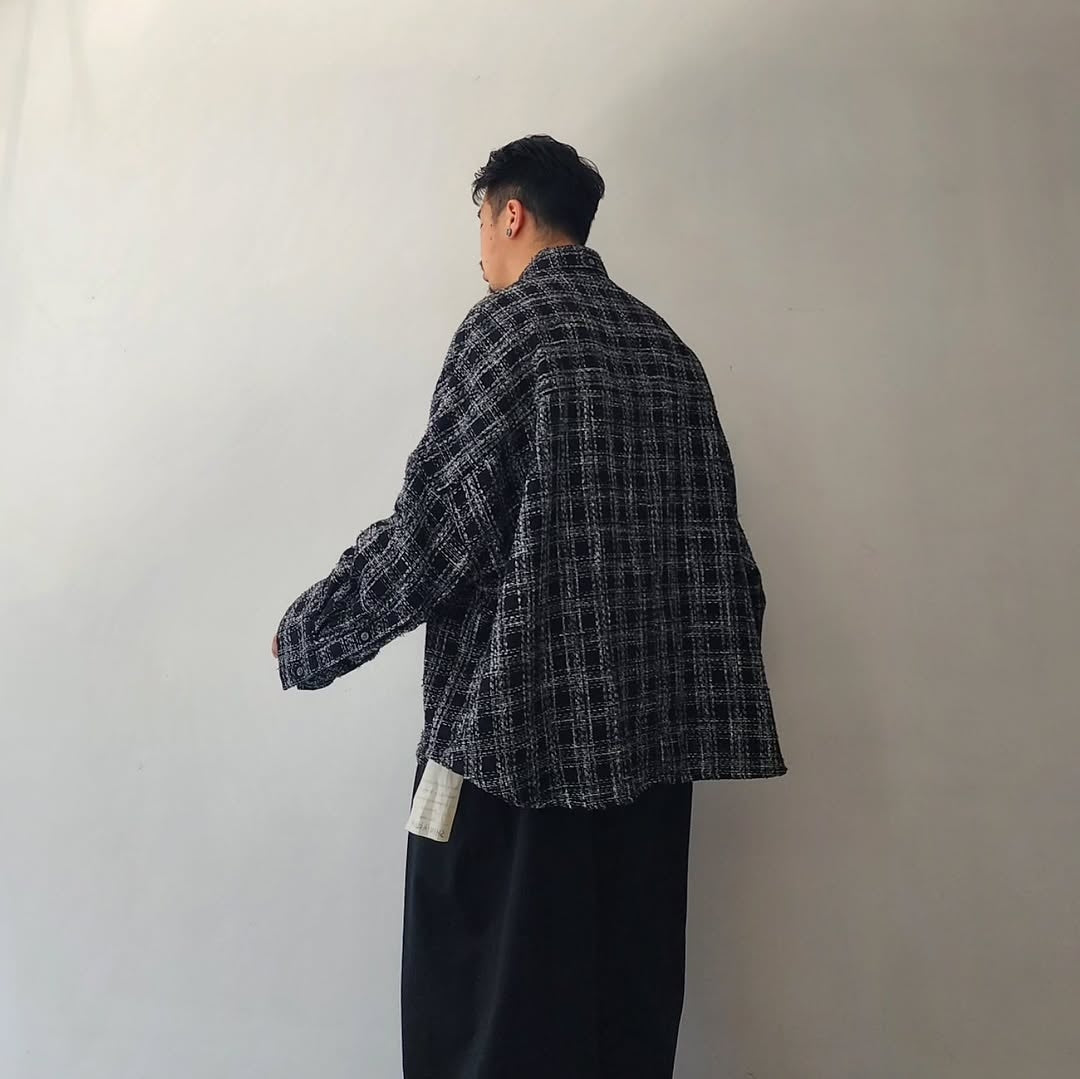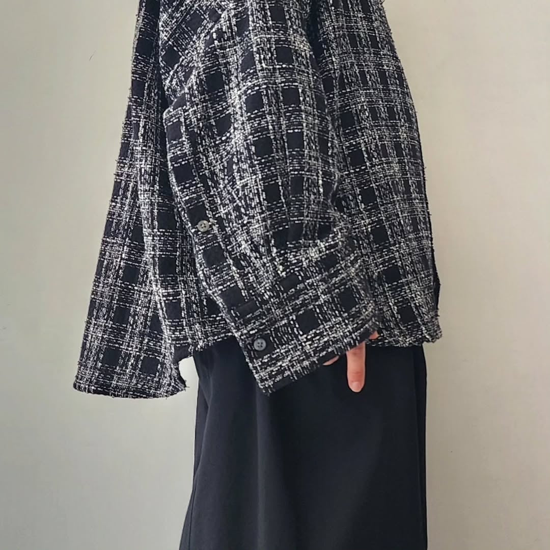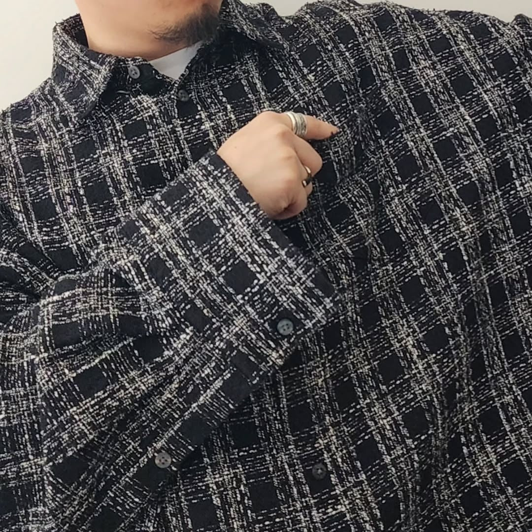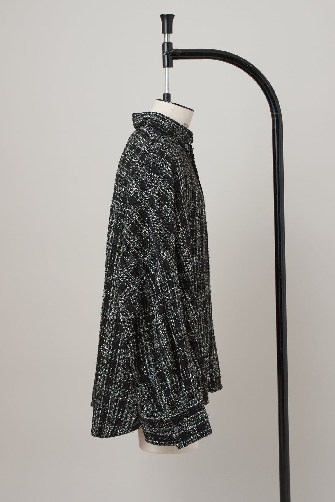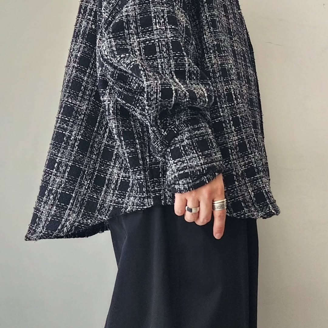 It features dropped shoulders that reach the elbow and a bold silhouette with a width roughly equal to that of two people. The length and details are kept basic. This is a recommended item that can be worn all year round.