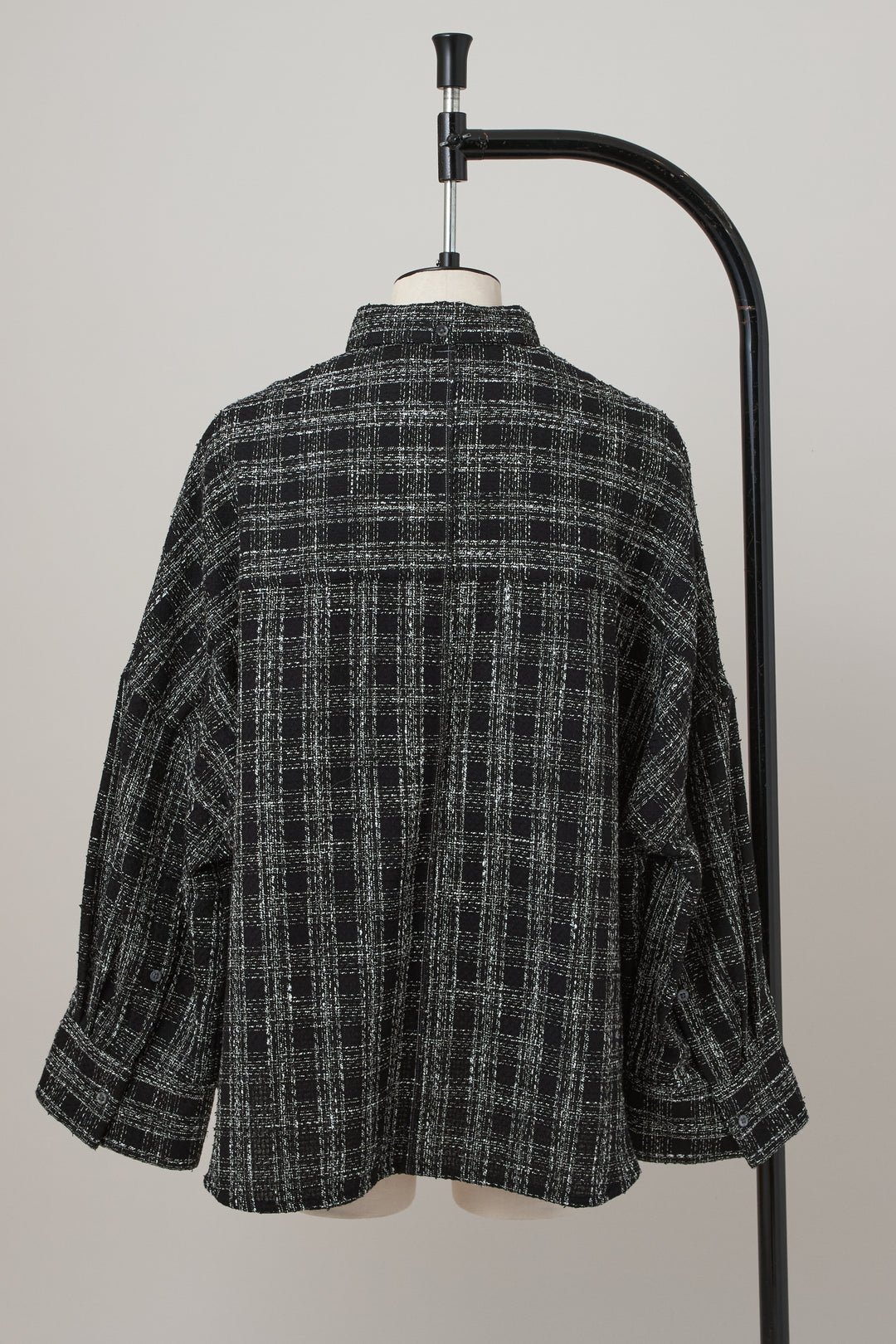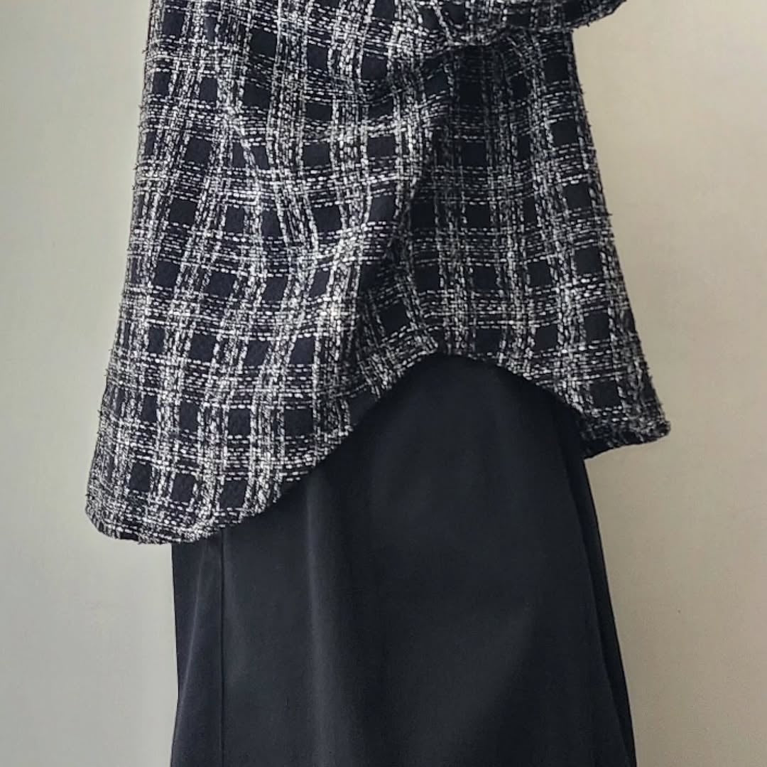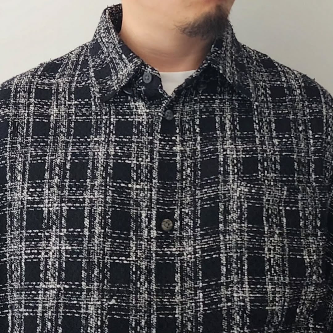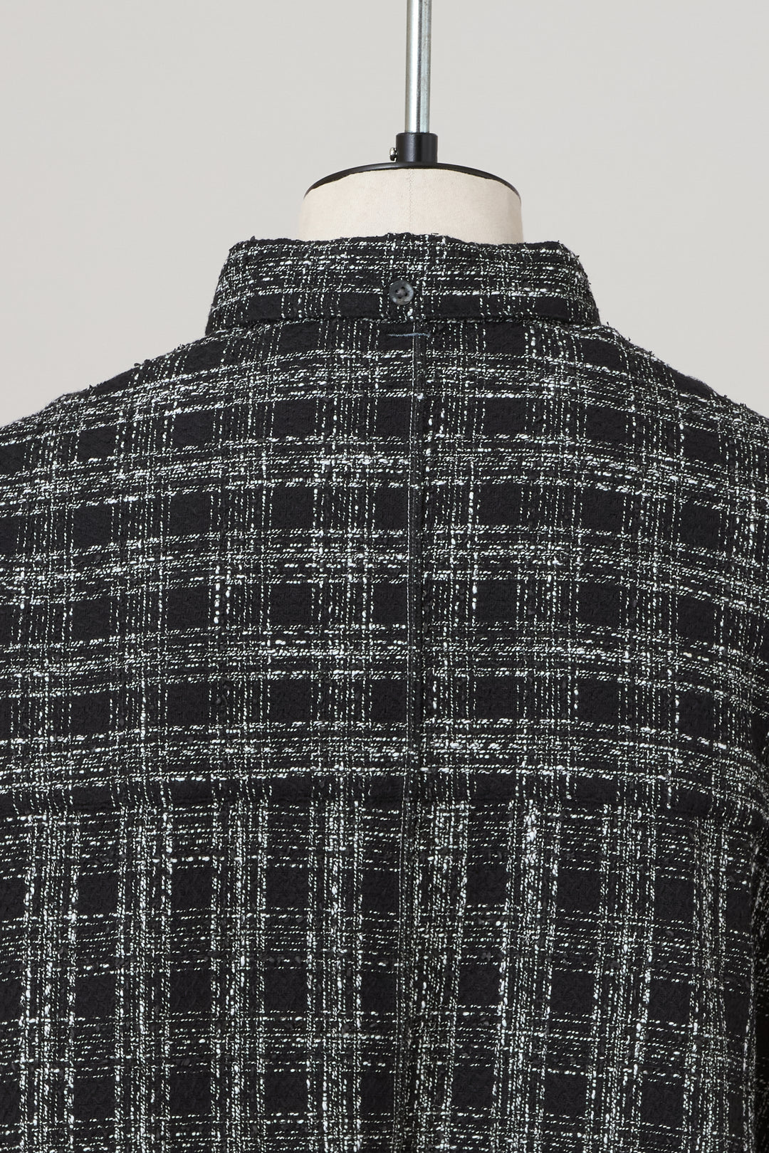 It features dropped shoulders that reach the elbow and a bold silhouette with a width roughly equal to that of two people. The length and details are kept basic. This is a recommended item that can be worn all year round.