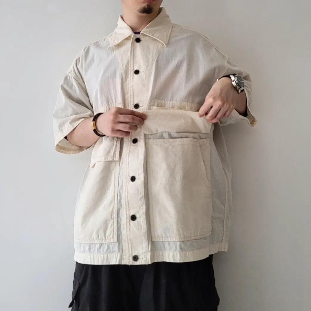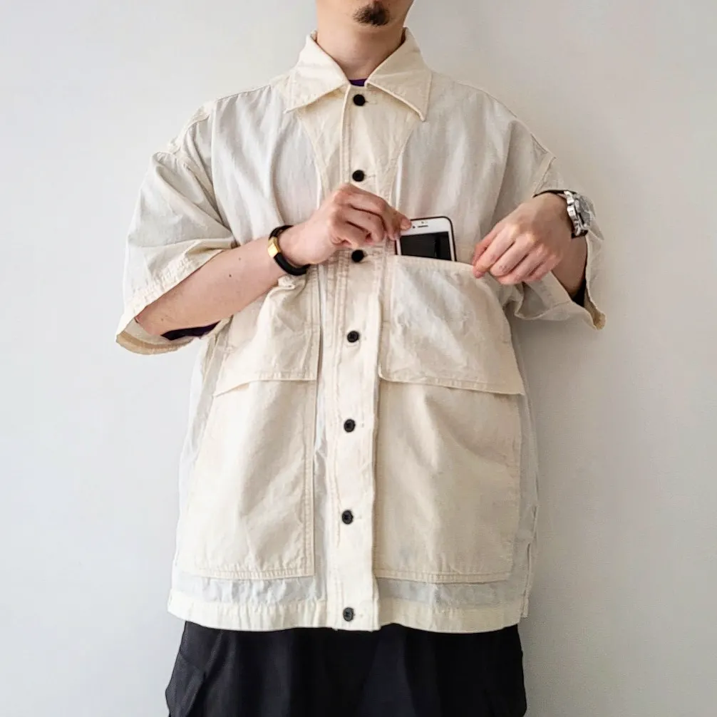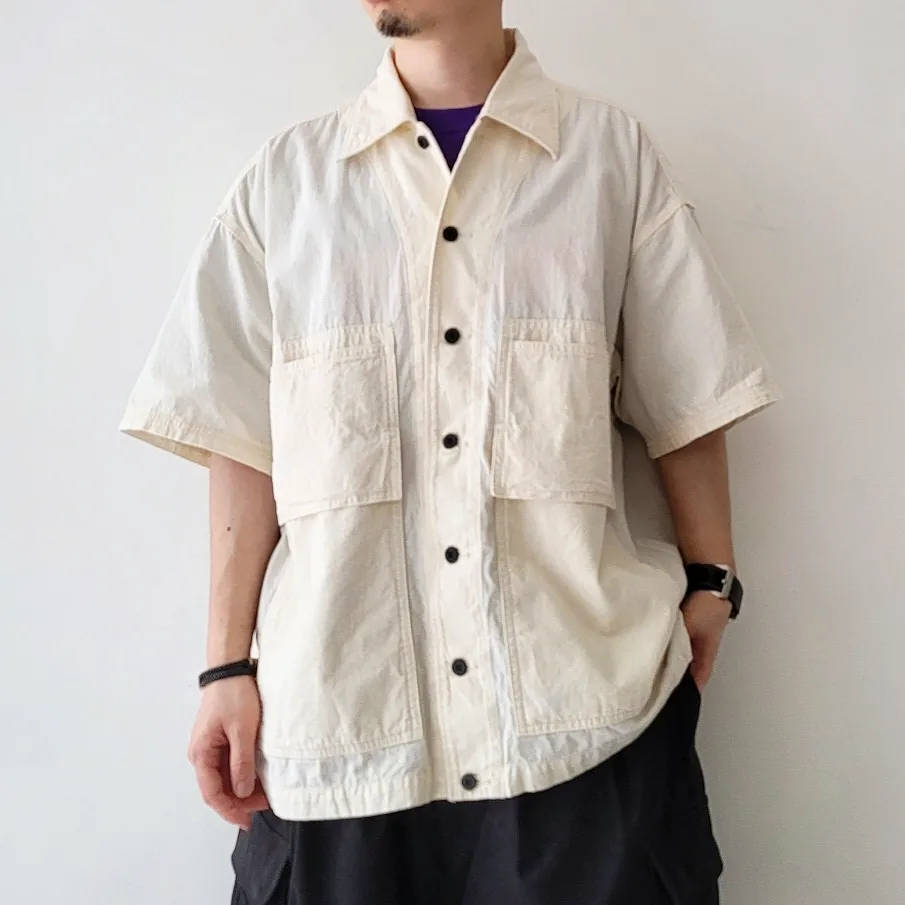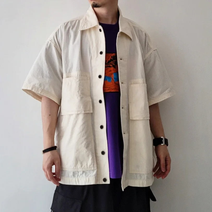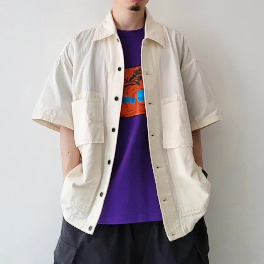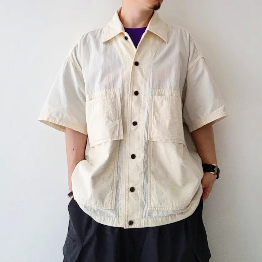 - A large-capacity short-sleeved shirt jacket with a hunting jacket design.