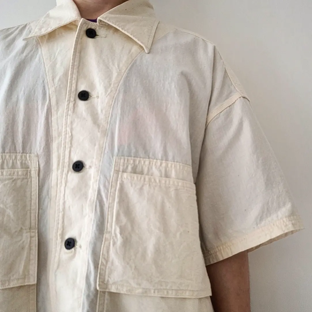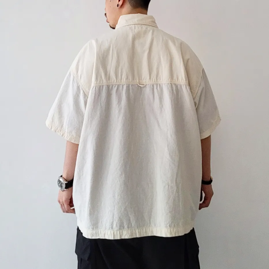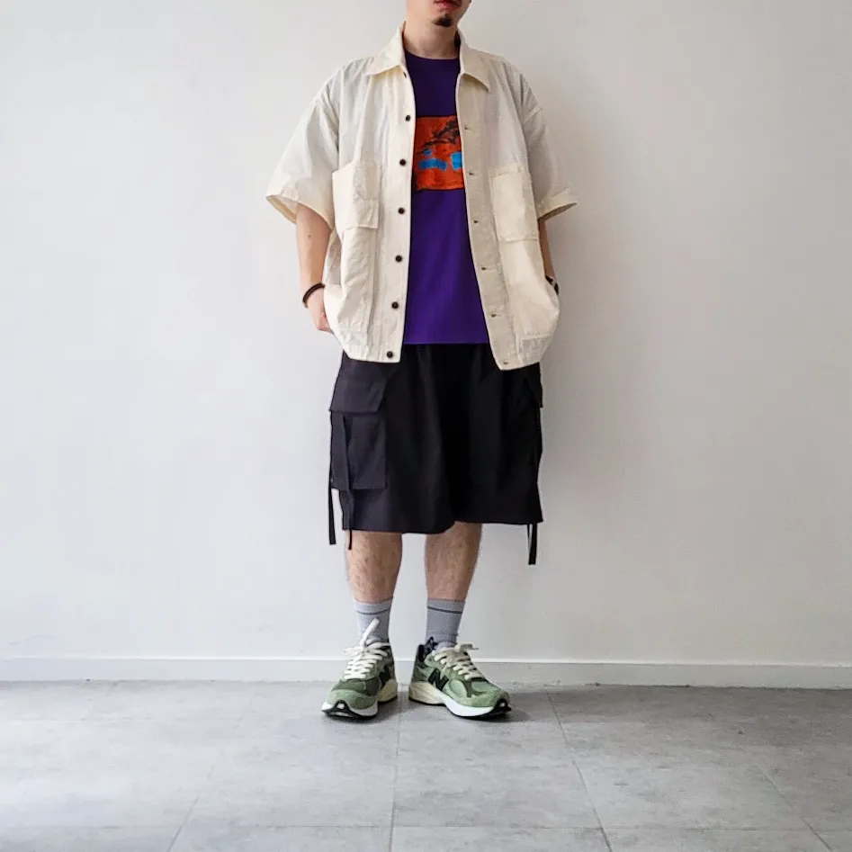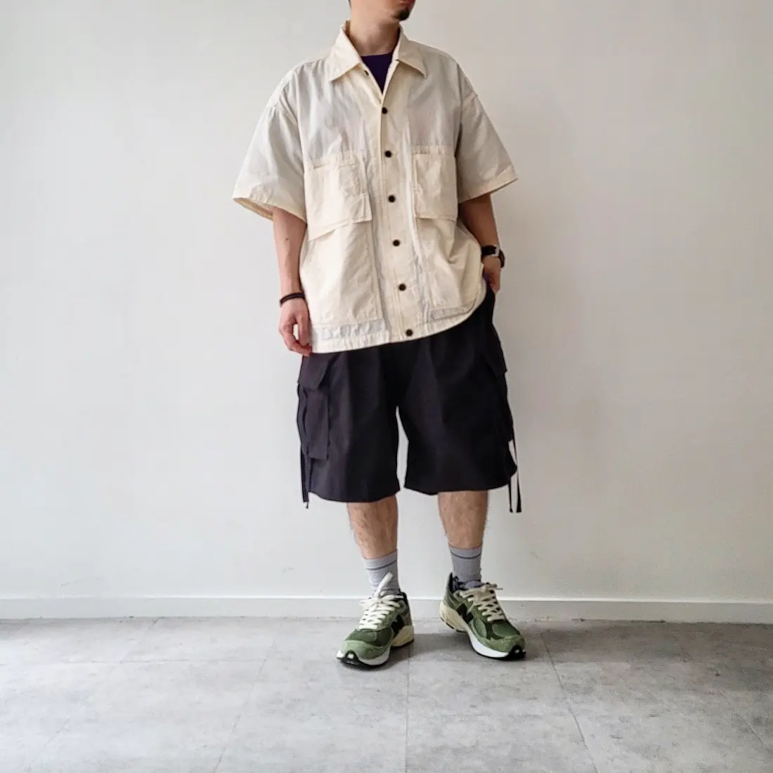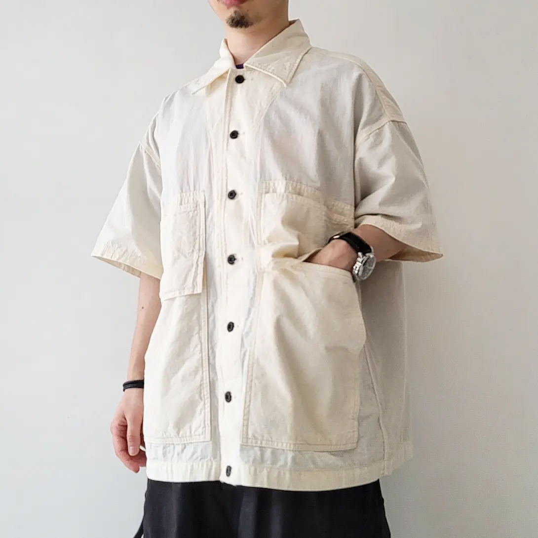 - A large-capacity short-sleeved shirt jacket with a hunting jacket design.